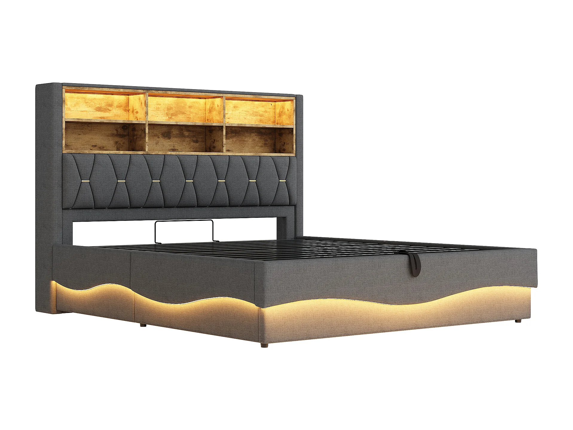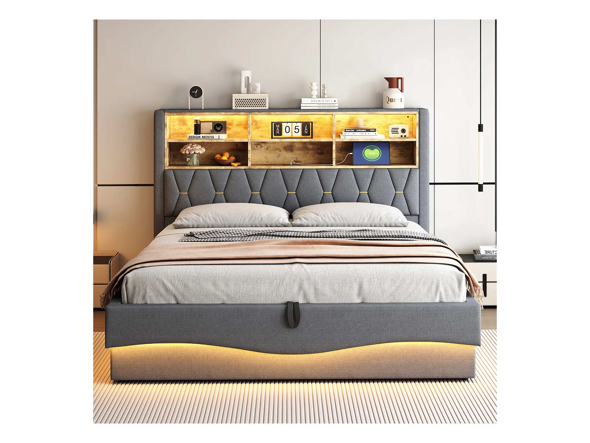 Letto con contenitore per bambini 180x200 cm - con striscia luminosa LED - con porta di ricarica USB - lino - grigio (senza materasso)