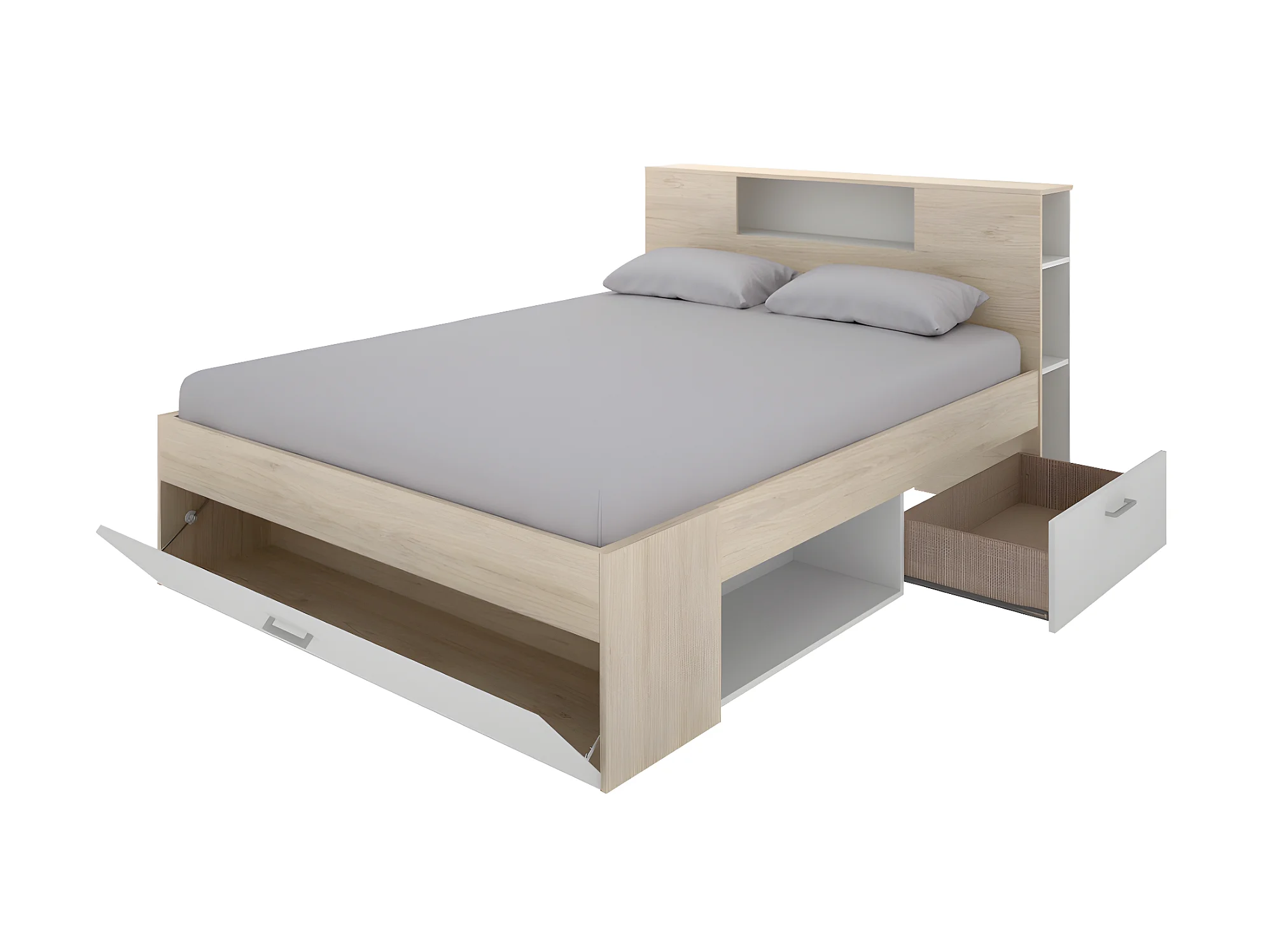 Letto con testata con vani portaoggetti e cassetti 140 x 190 cm: Naturale e Bianco + Rete LEANDRE