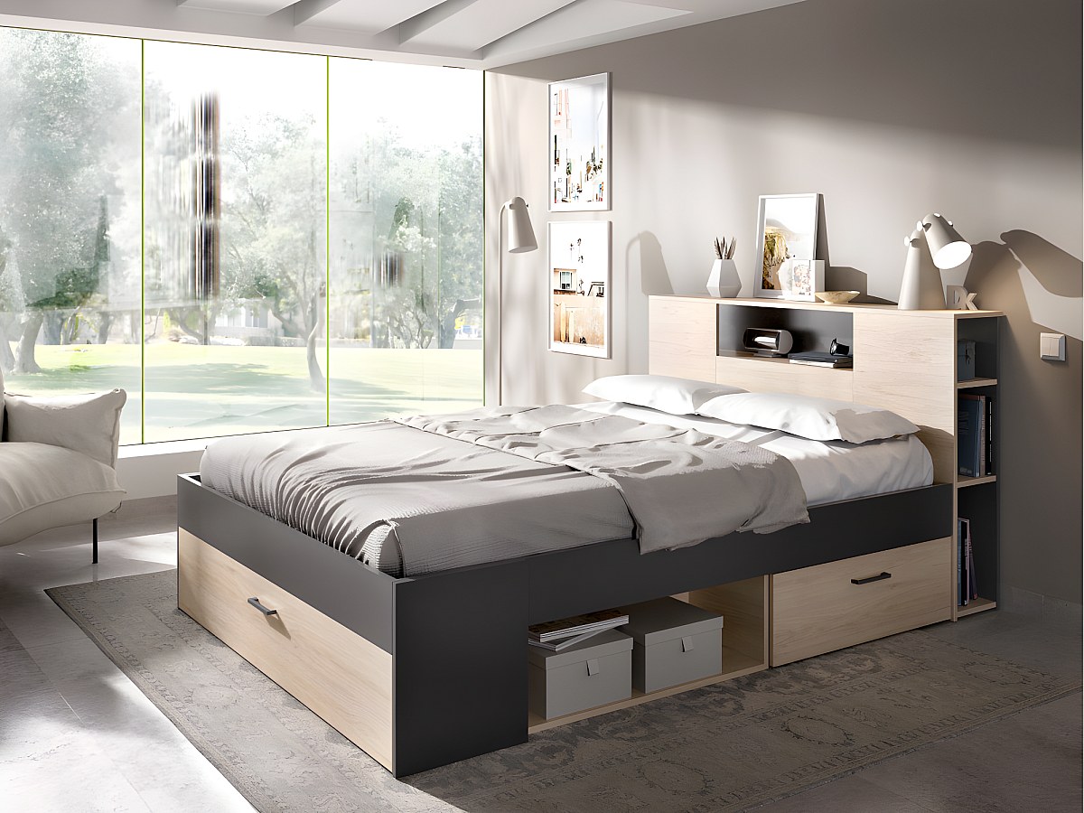 Letto matrimoniale alla francese con testiera portaoggetti e cassetti 140 x 190 cm Quercia e antracite - LEANDRE