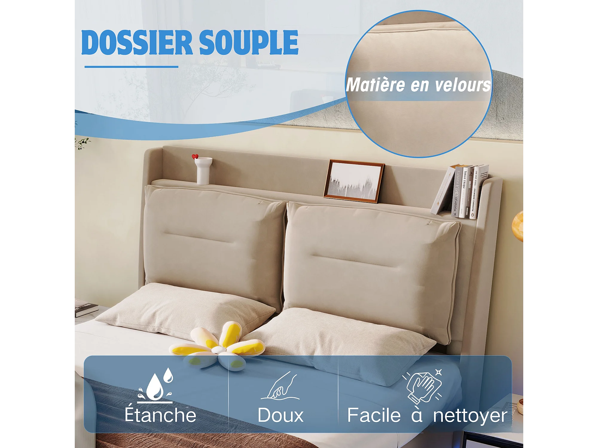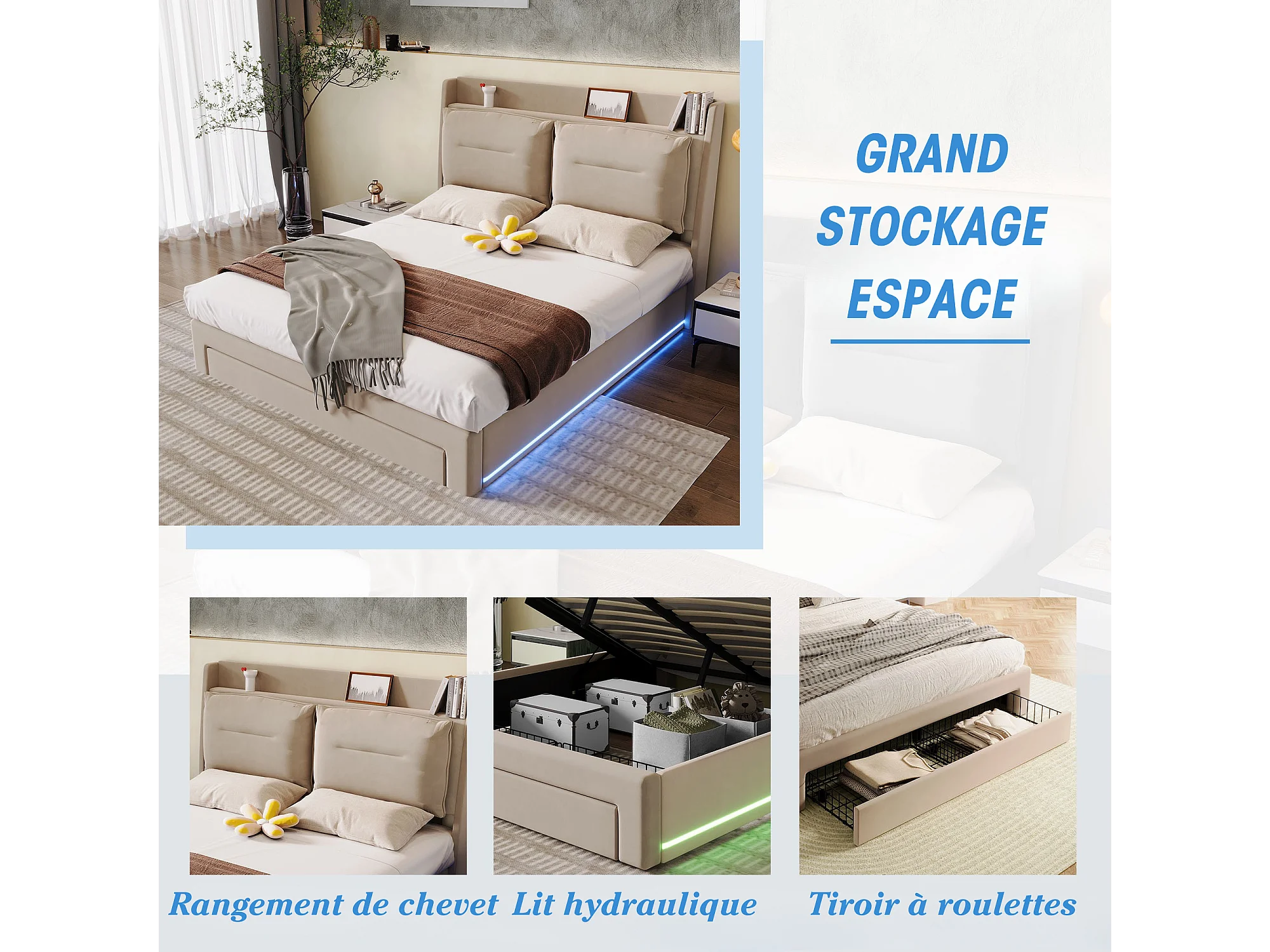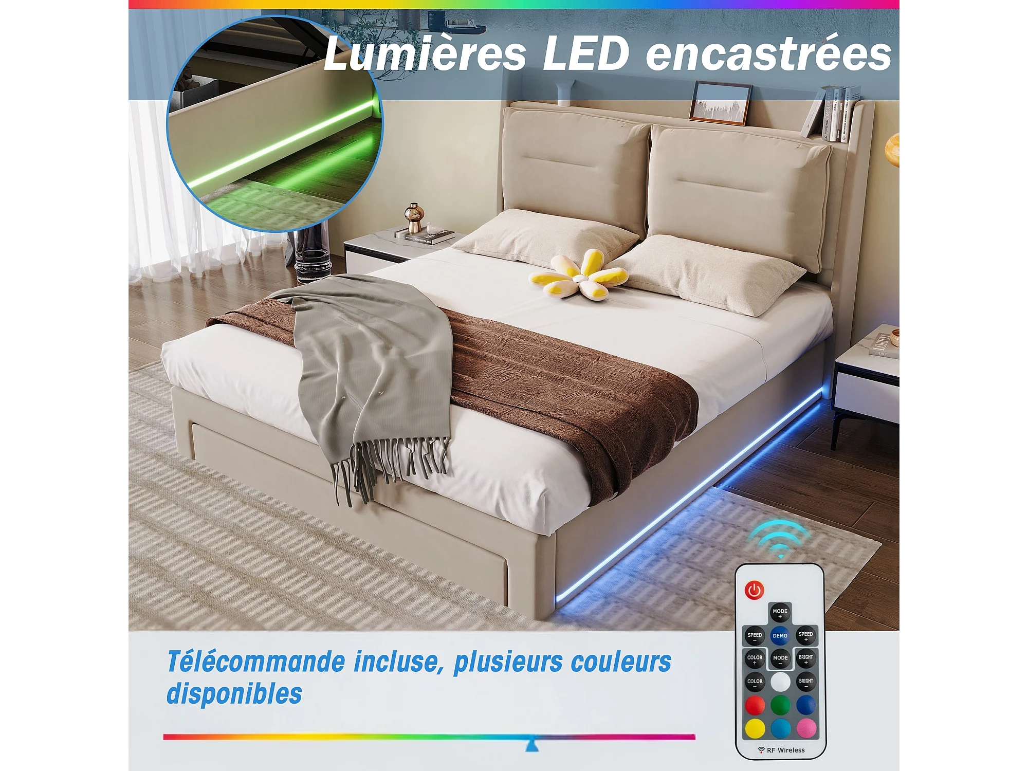 Letto contenitore 140 x 190 cm con testiera e 2 cassetti - LED - Velluto - Beige (senza materasso)
