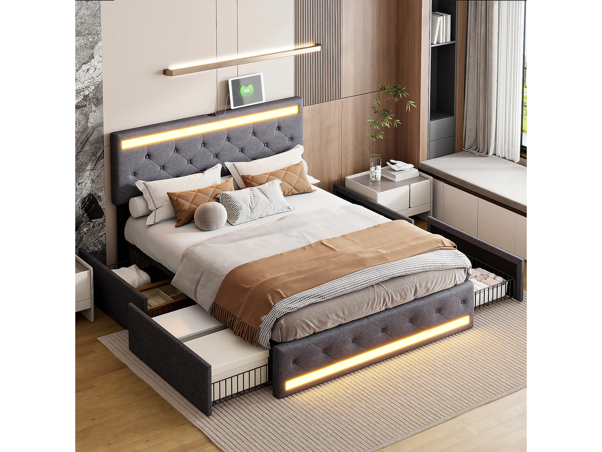 Letto matrimoniale imbottito con testiera contenitore e ricarica USB,illuminazione a LED,140x200 cm,grigio