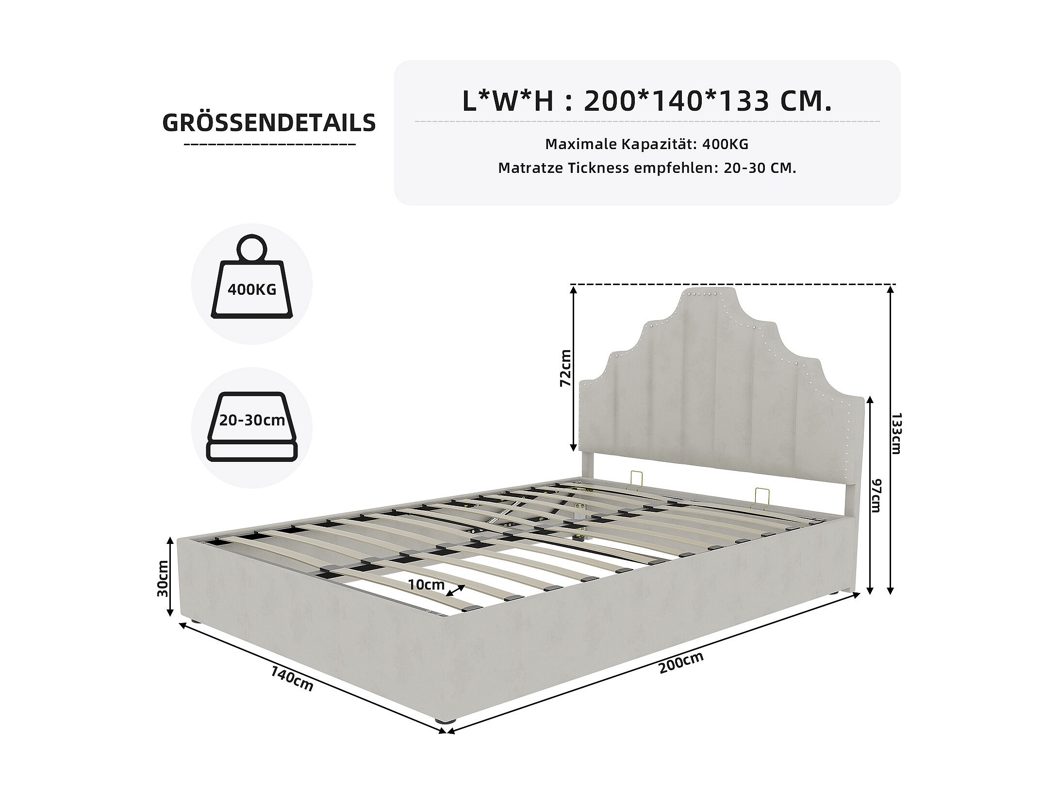 Letto contenitore 140 x 200 cm - Letto per adulti con testiera morbida e contenitore - velluto olandese beige - materasso non incluso