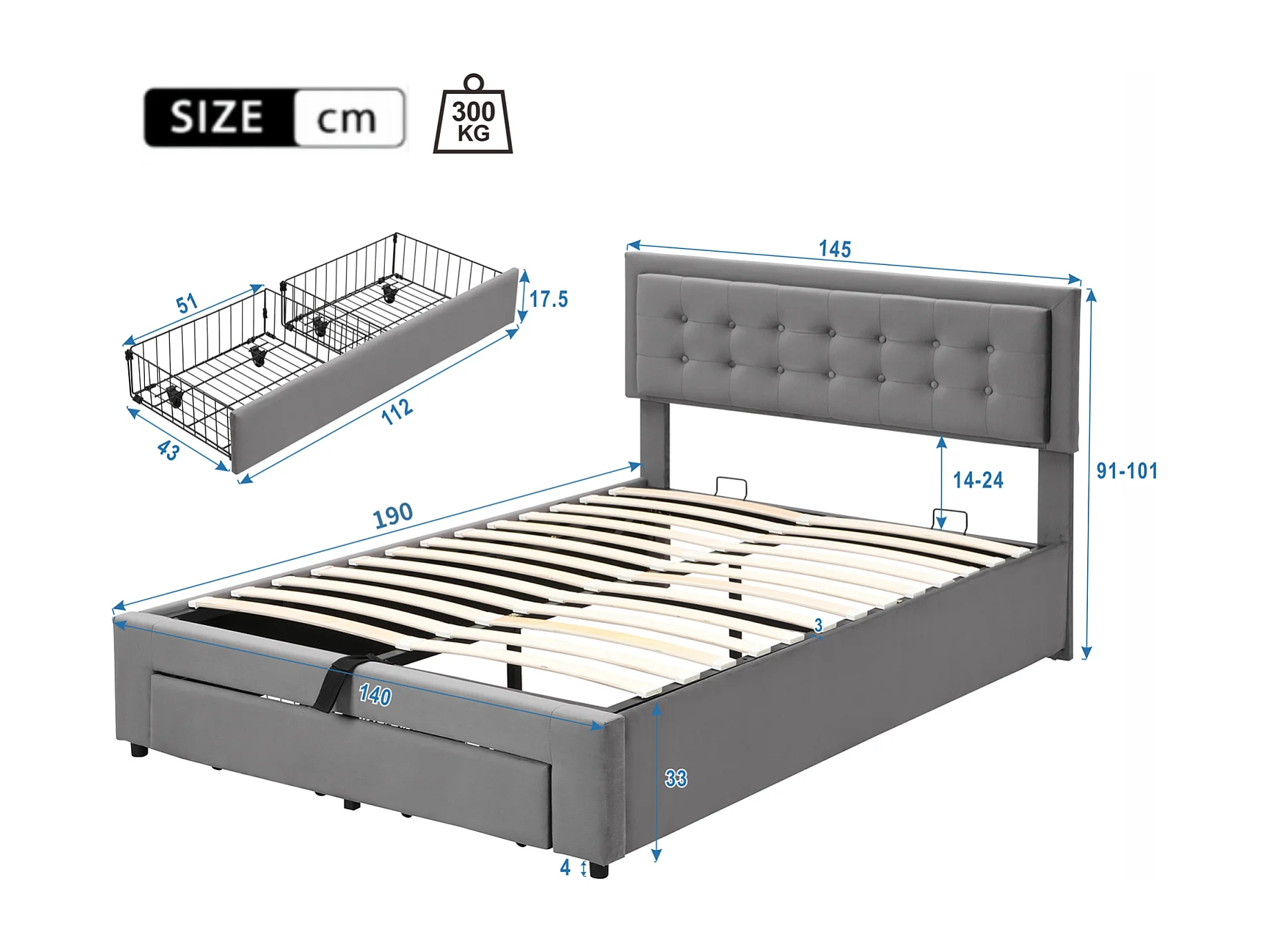 Letto contenitore 140x190cm, letto matrimoniale imbottito con rete a doghe e testiera regolabile con 2 cassetti, tessuto velluto, grigio