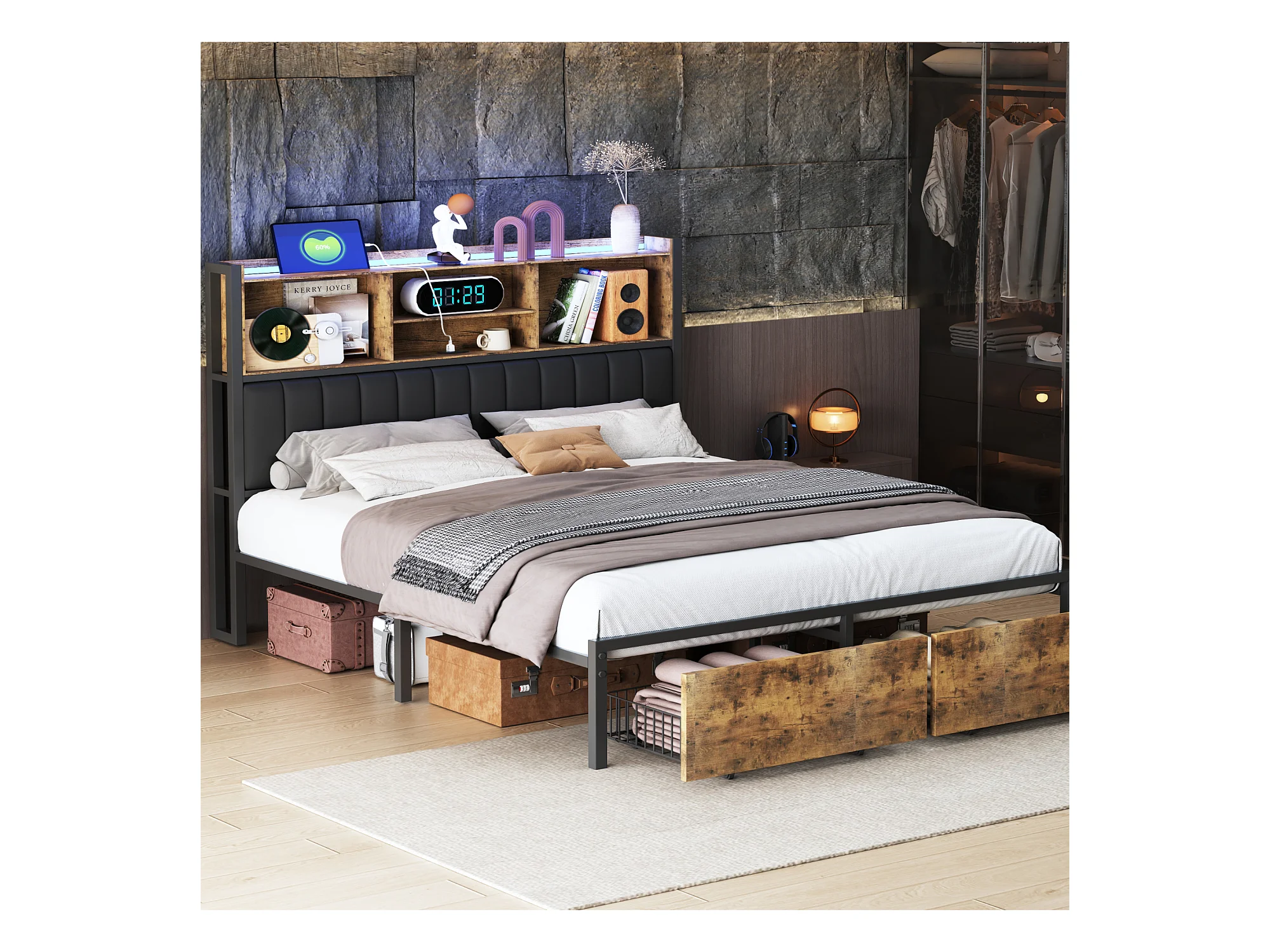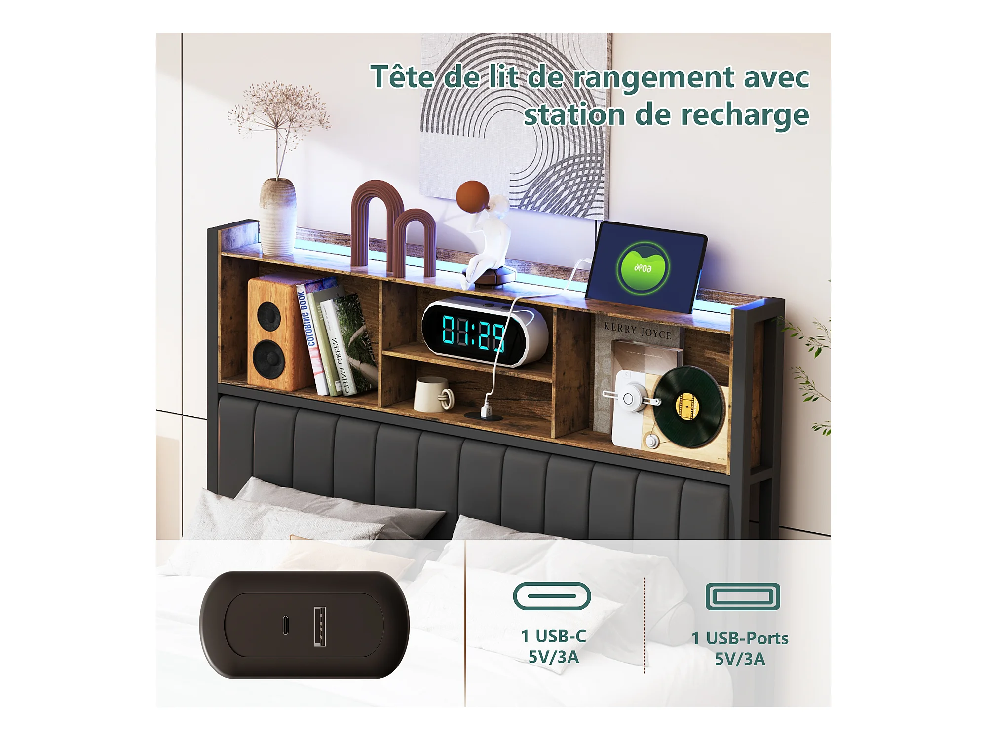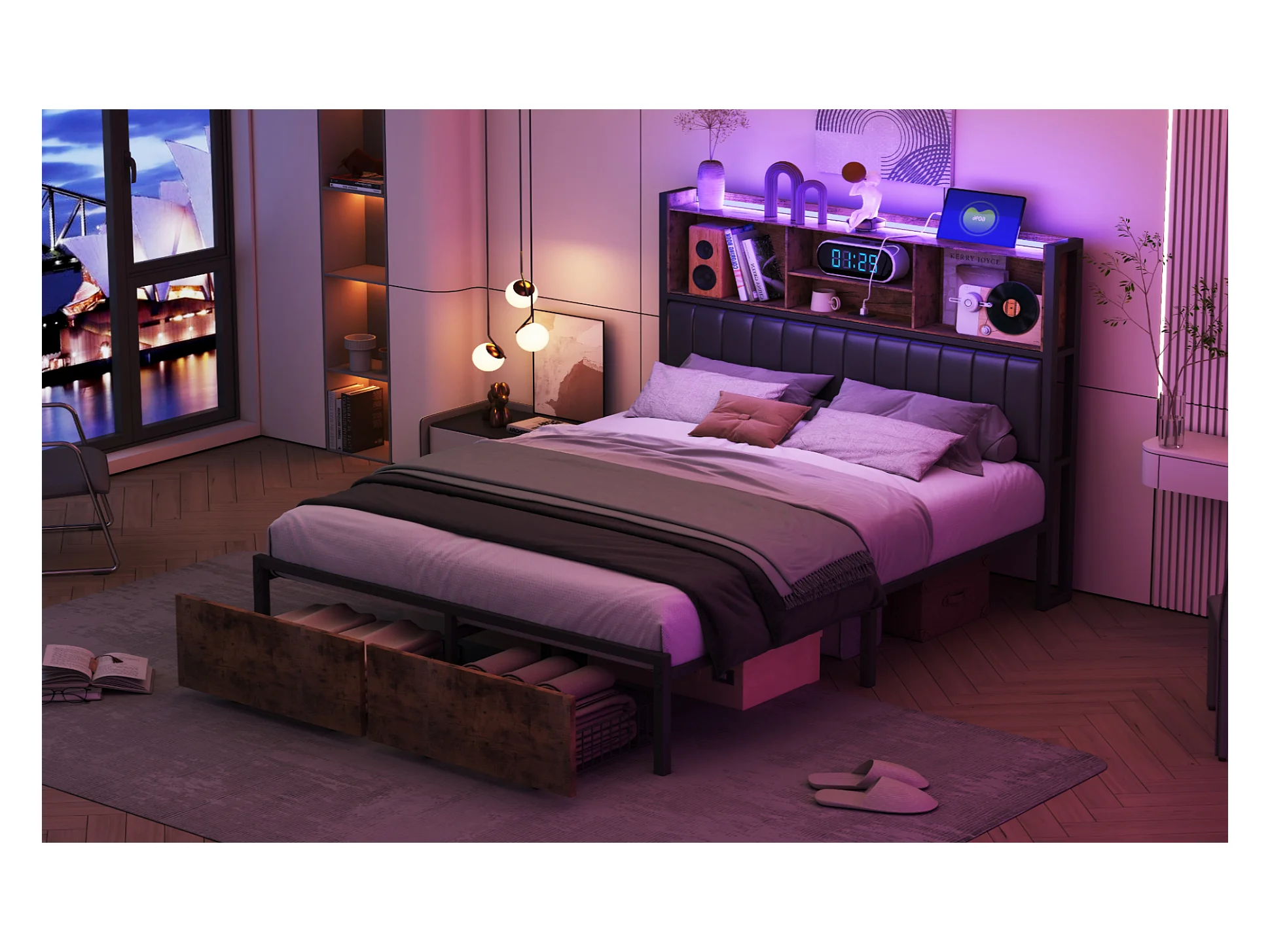 Letto contenitore 140x200 cm con rete a doghe, LED, 2 cassetti portaoggetti, testiera imbottita in PU e robusta struttura in metallo, design moderno