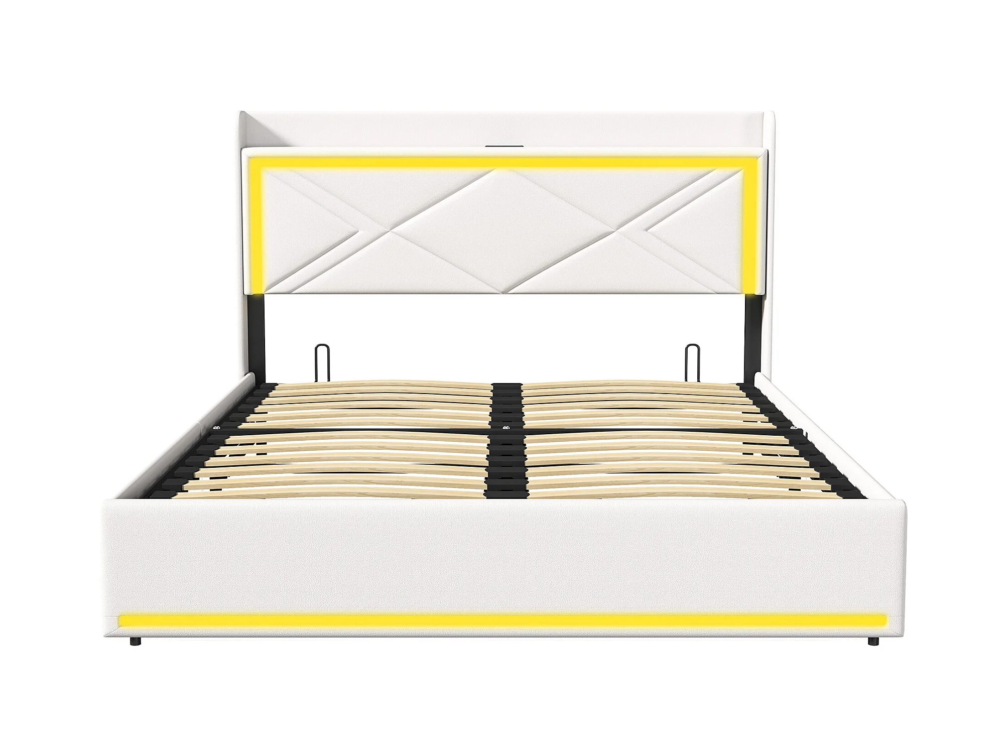 Letto contenitore 140x200cm in tessuto similpelle - con LED e porte USB - con rete a doghe - Bianco