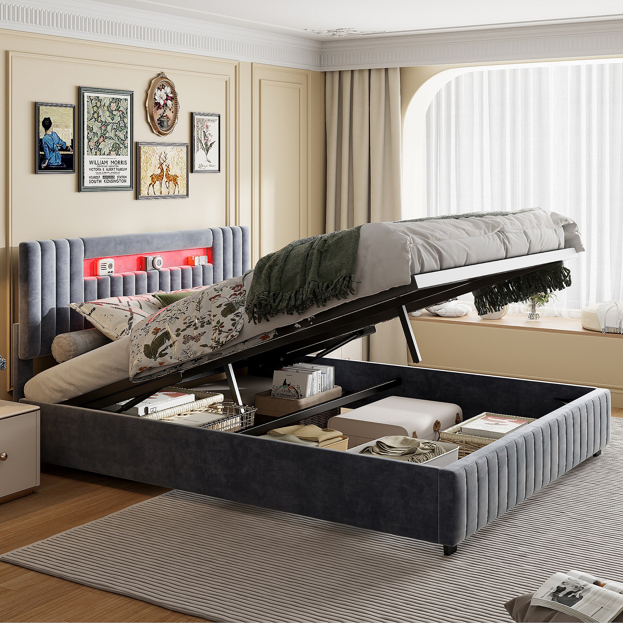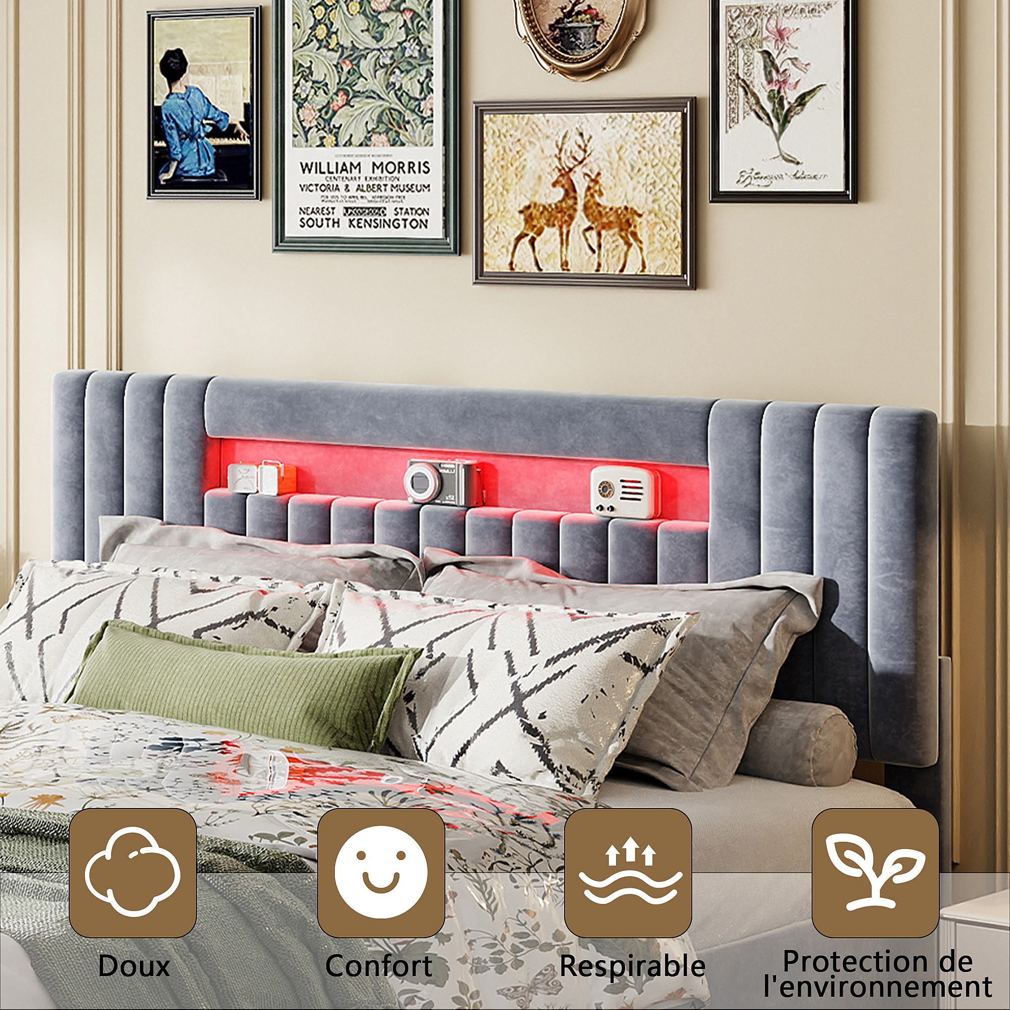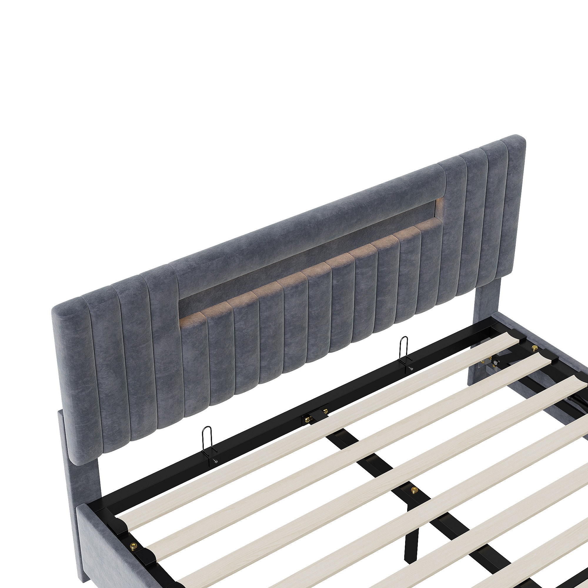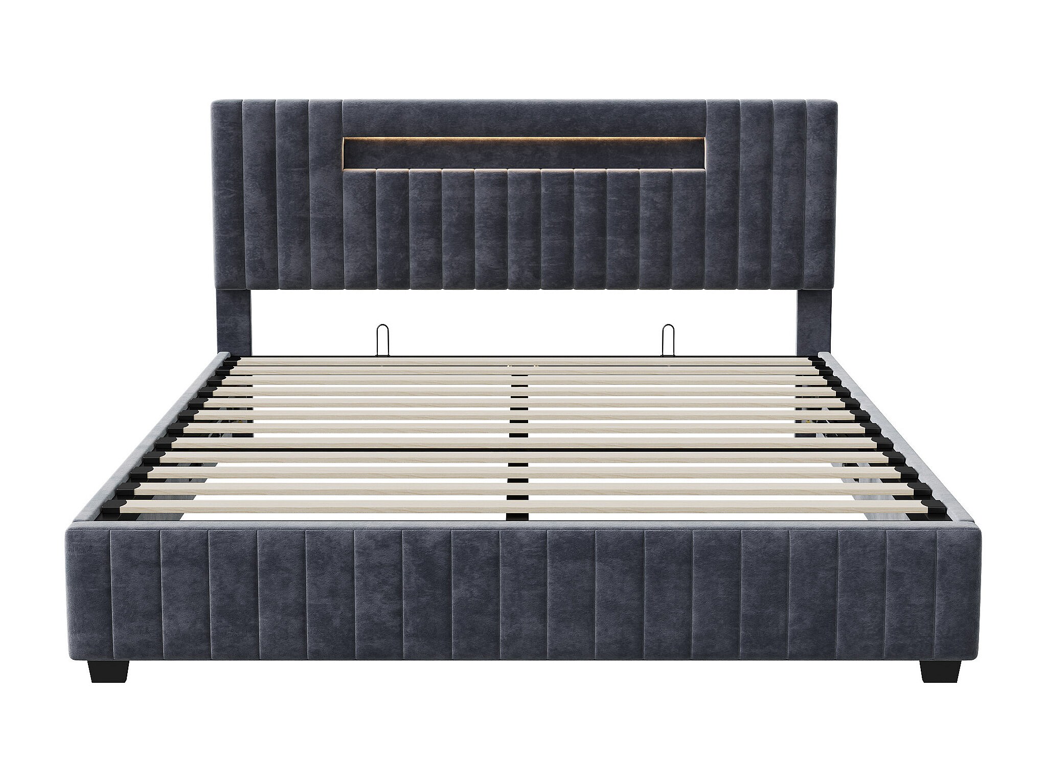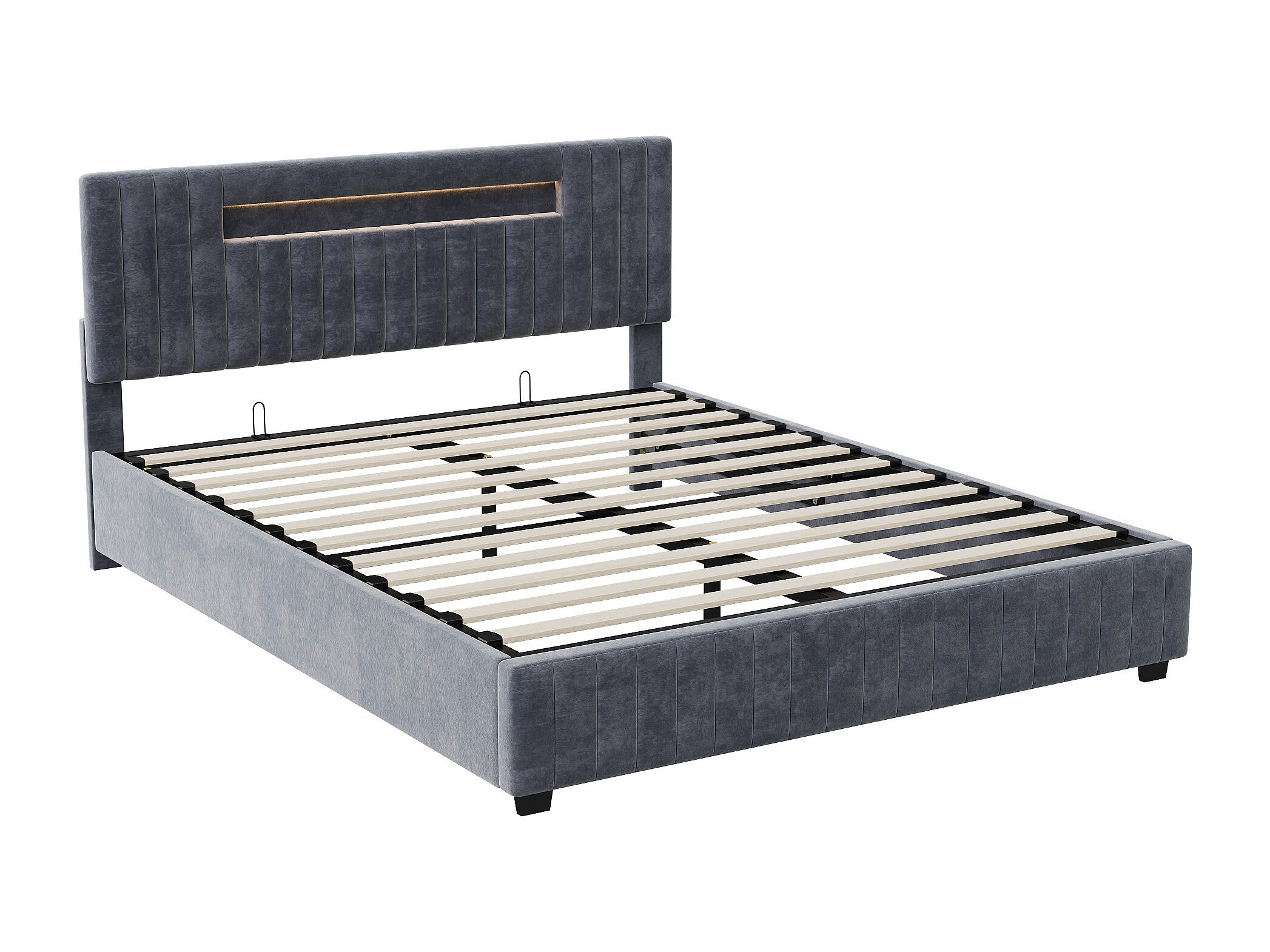 Letto contenitore 140x200cm - Letto matrimoniale con testiera LED con contenitore, in tessuto velluto grigio