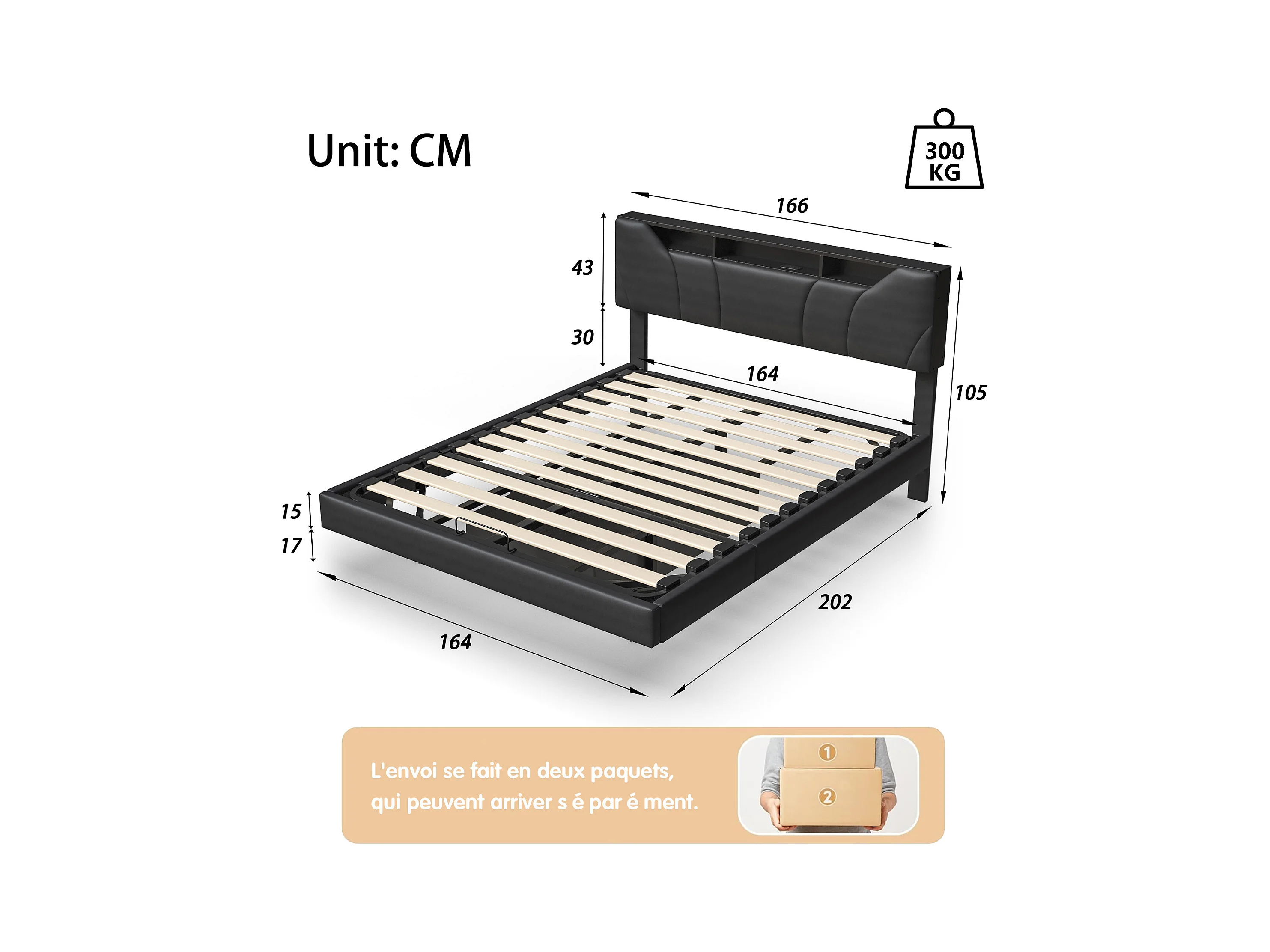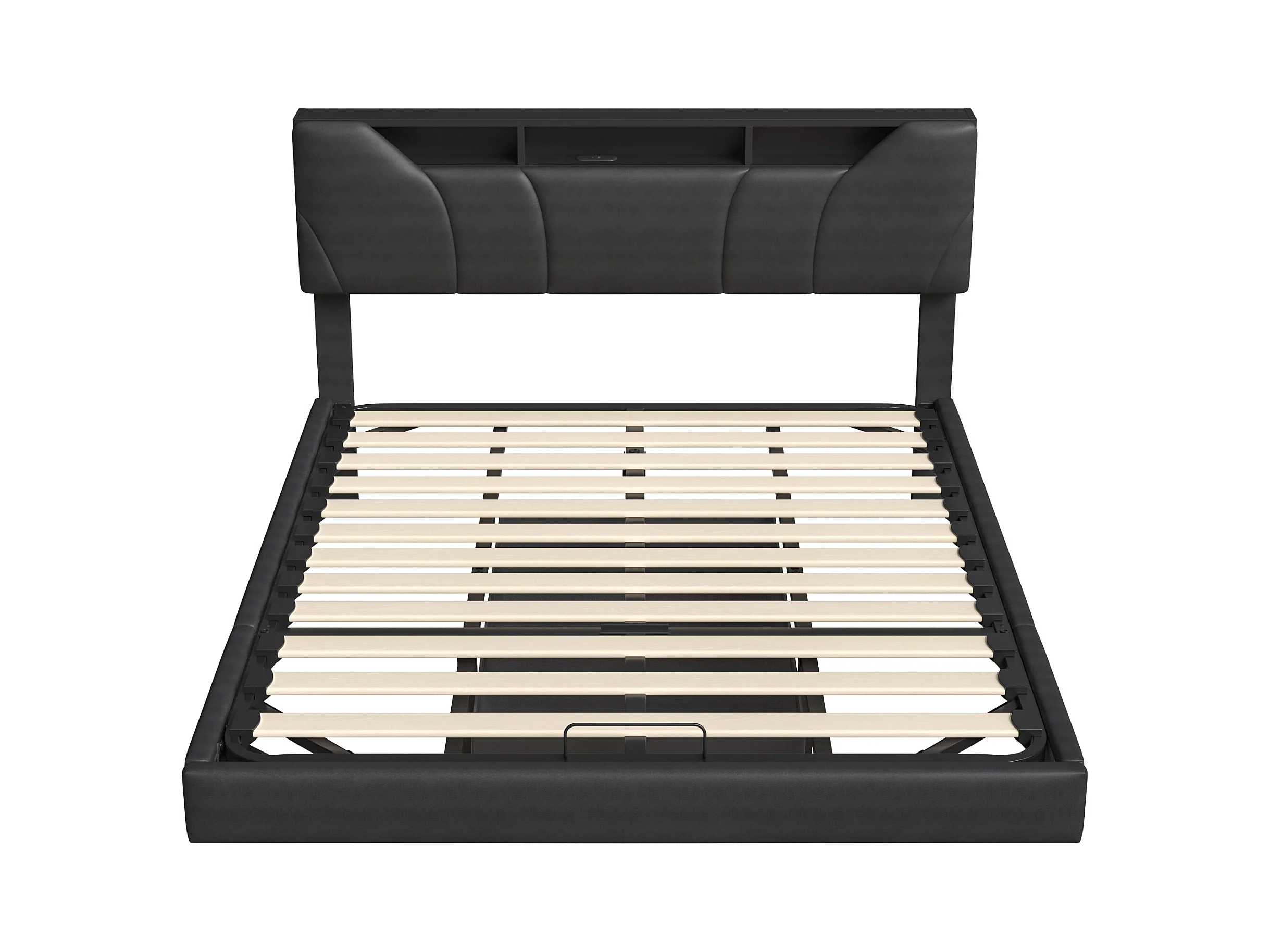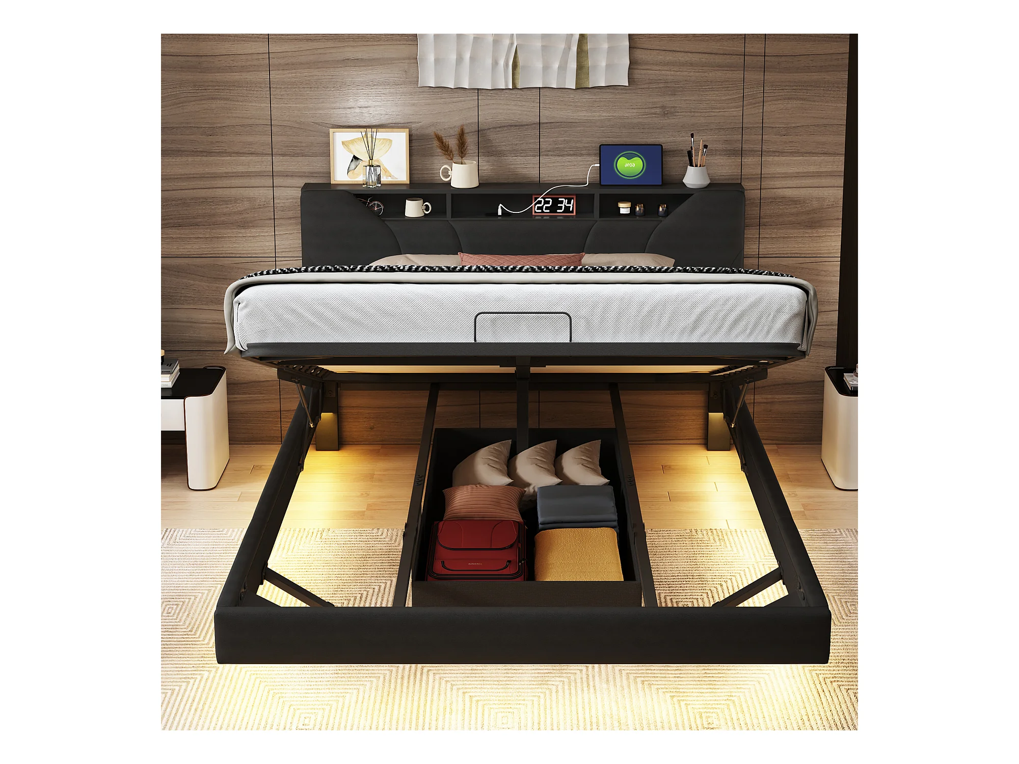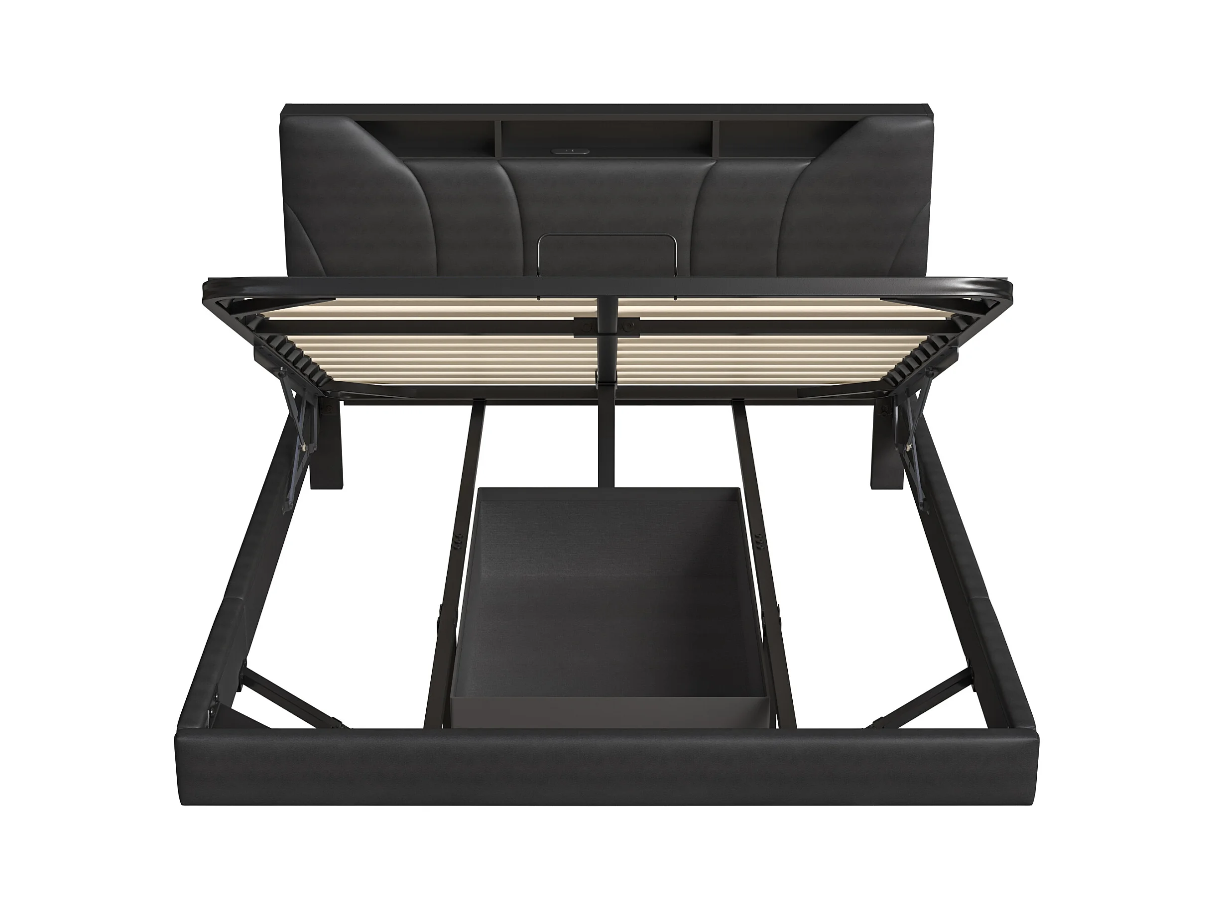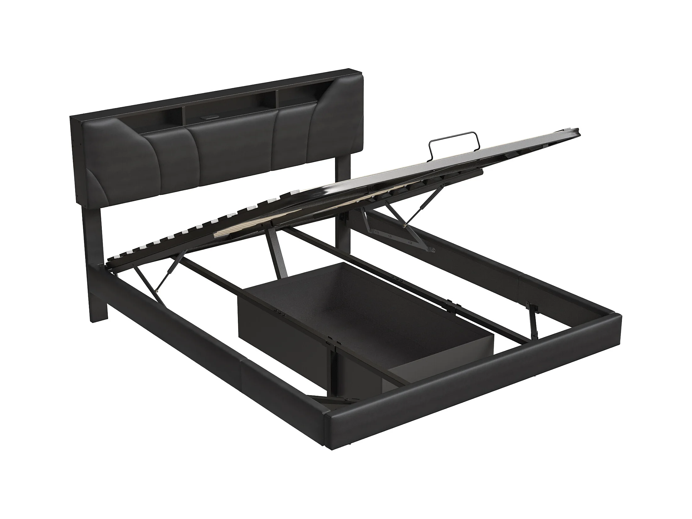 Letto contenitore 160*200CM, leva a gas, visione sospesa, con illuminazione a LED e presa di ricarica, pelle nera
