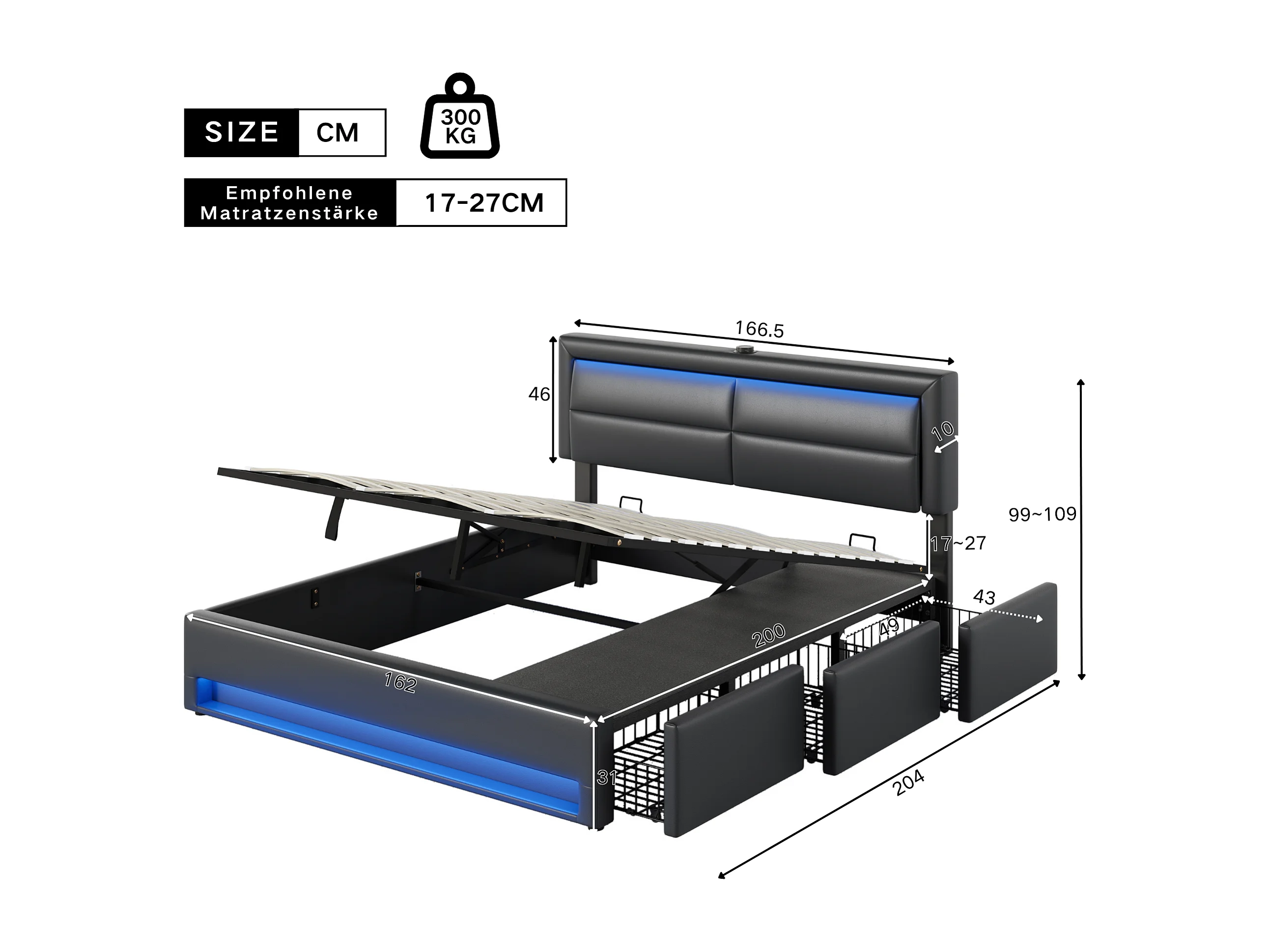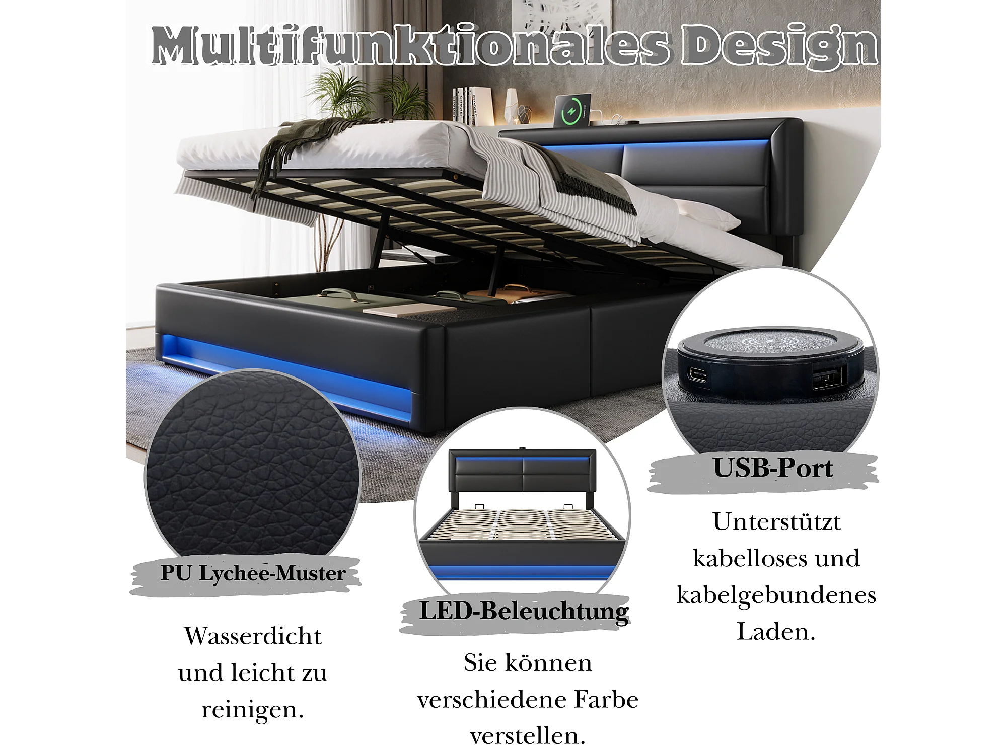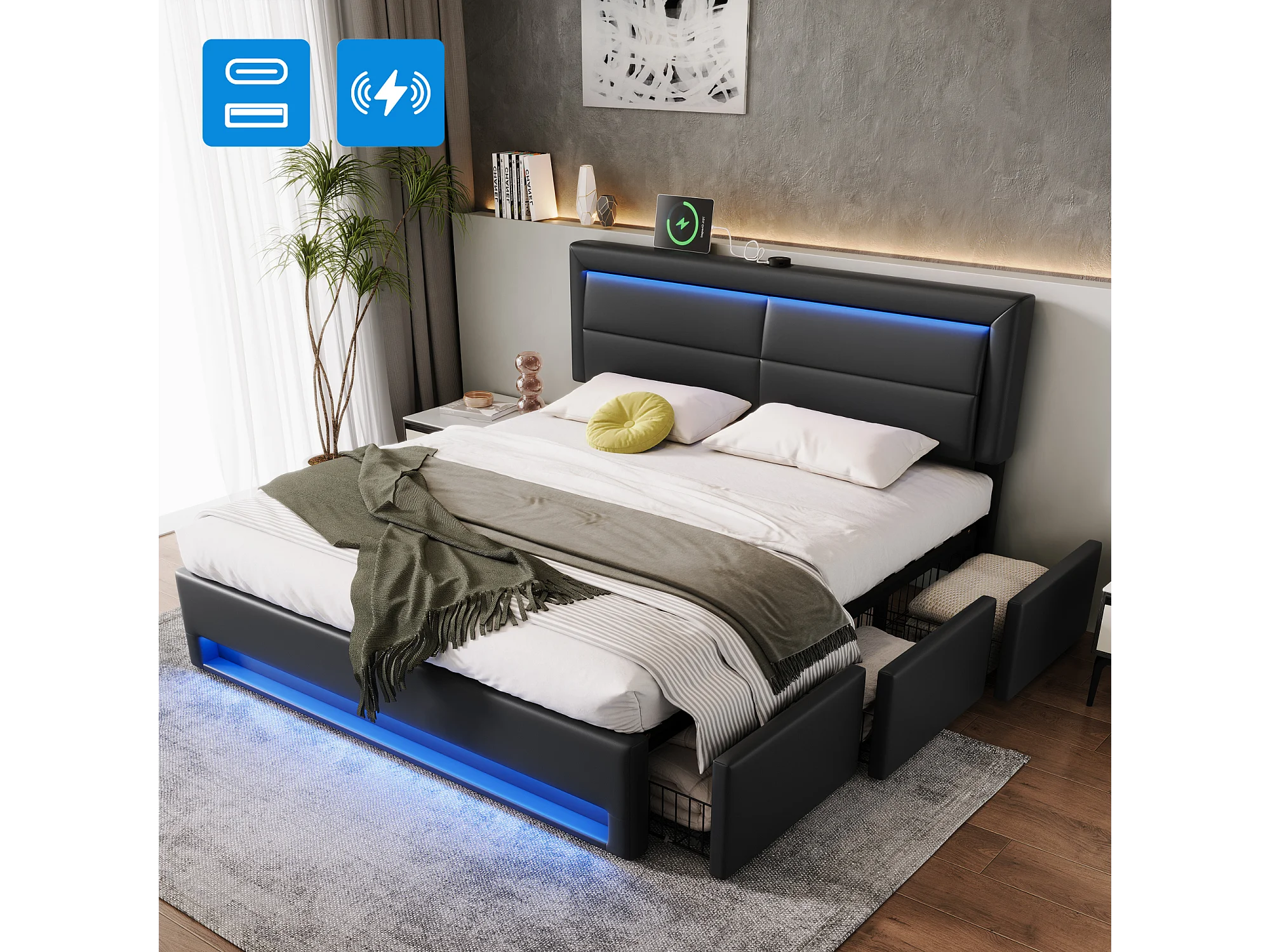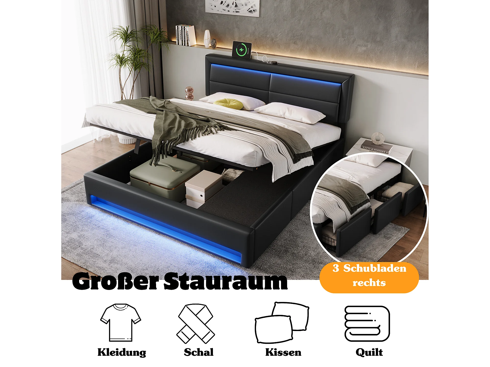 Letto contenitore 160 x 200 cm con testiera e 3 cassetti - LED e porta USB - Pelle PU - Nero (senza materasso)