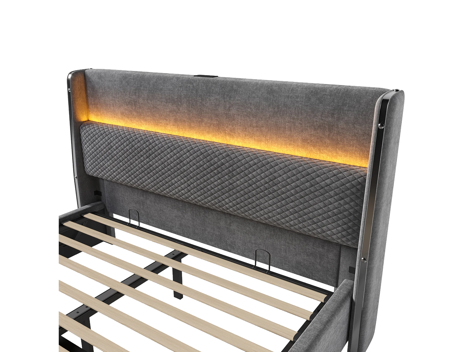 Letto contenitore per adulti 160x200cm con LED e USB tipo C, tessuto di lino grigio, rete a doghe, senza materasso