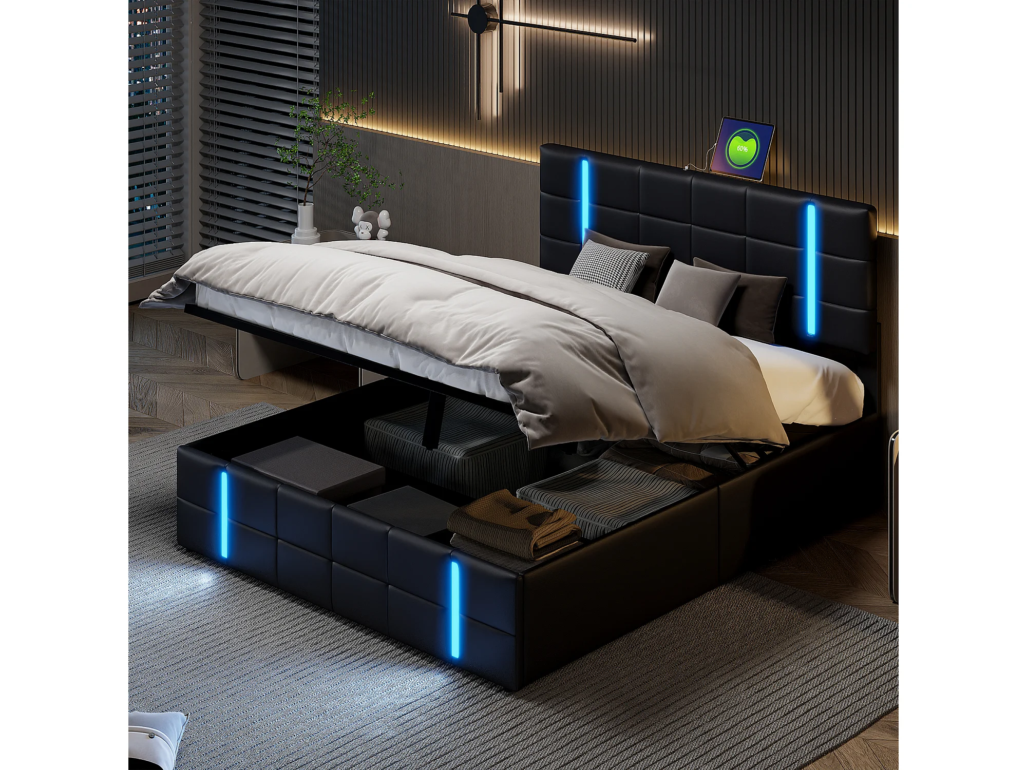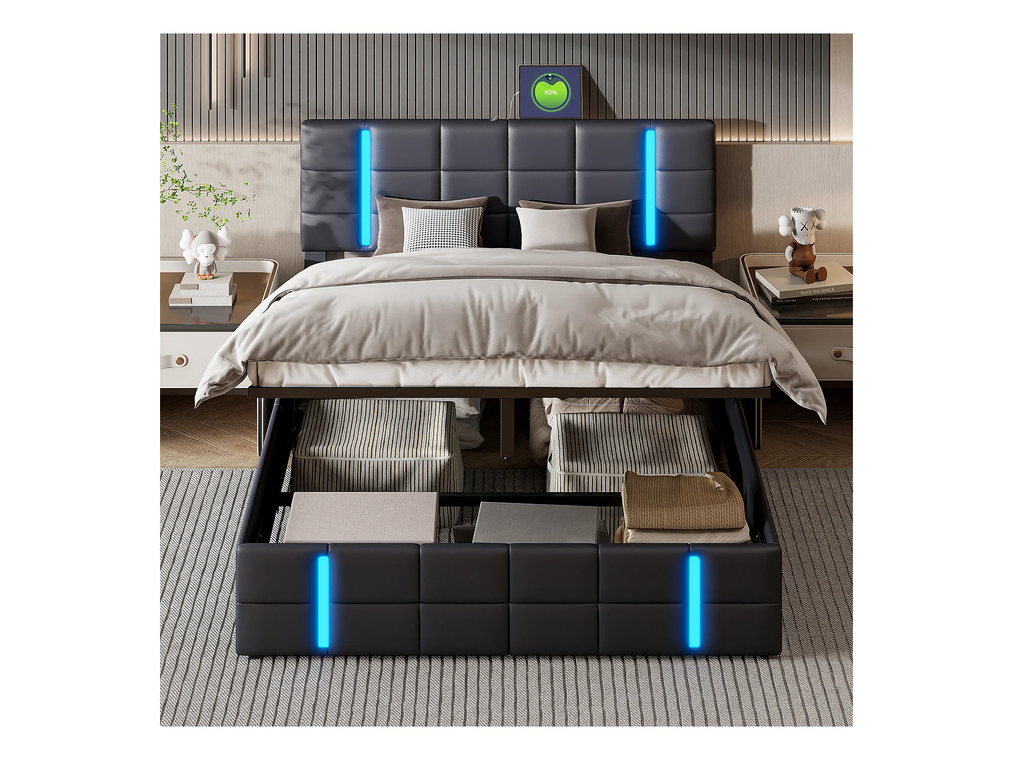 Letto contenitore 160x200 cm con base, letto matrimoniale imbottito con illuminazione a LED e porta USB, PU, nero