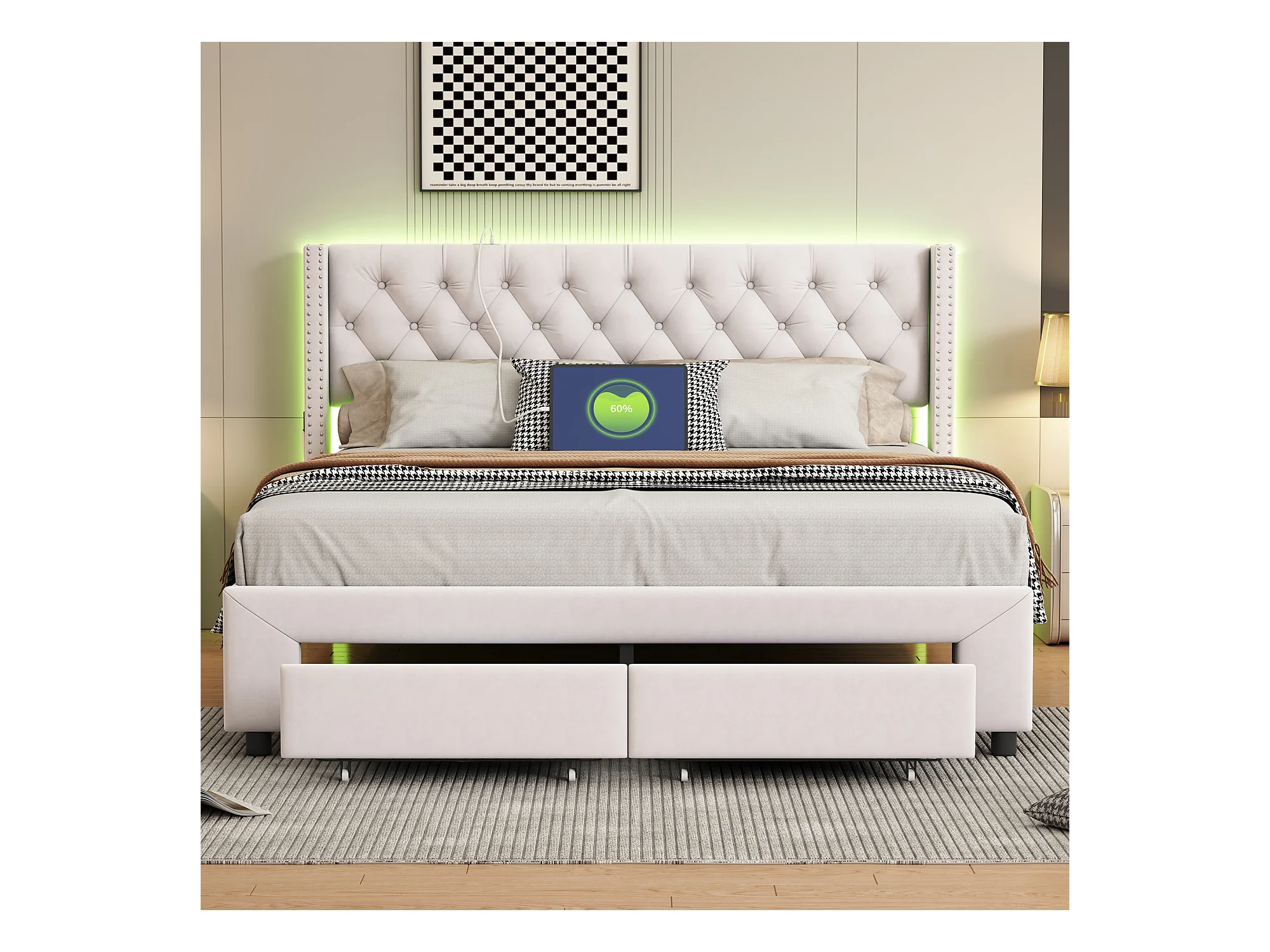 Letto contenitore 160x200 cm in velluto beige, testiera con borchie, 2 cassetti, porte USB, tasche laterali, striscia LED rimovibile