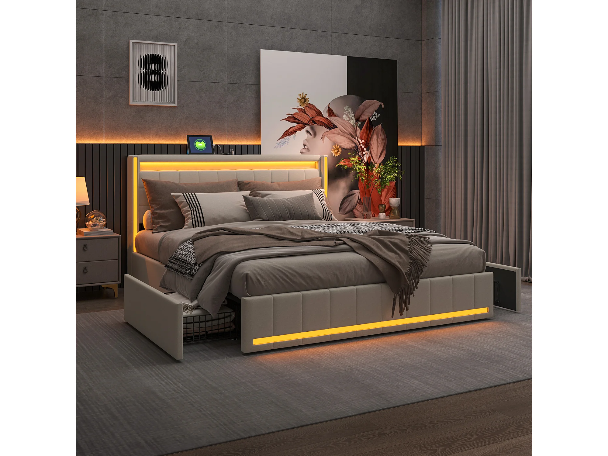 Letto 160x200 cm con LED e USB, cassettiera con 4 cassetti e ampio contenitore, matrimoniale con rete a doghe, beige