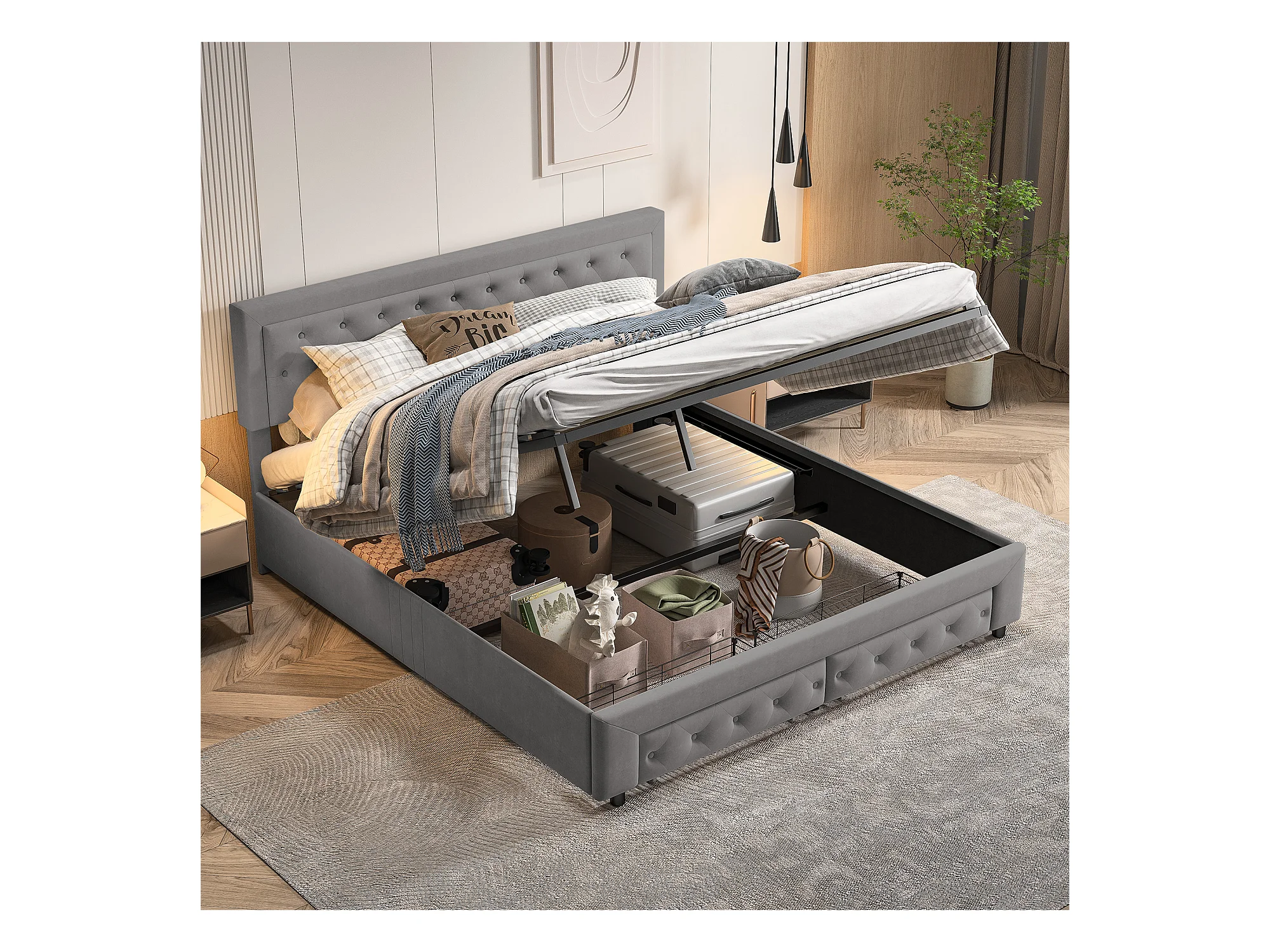 Letto contenitore in velluto grigio 160x200 cm con martinetti idraulici, testiera LED a 7 colori, porte USB e Type-C integrate e cassetti portaoggetti