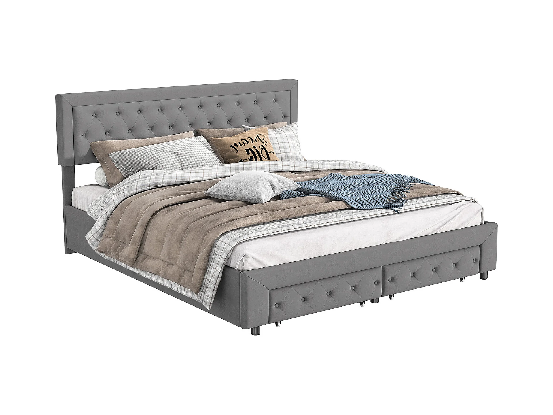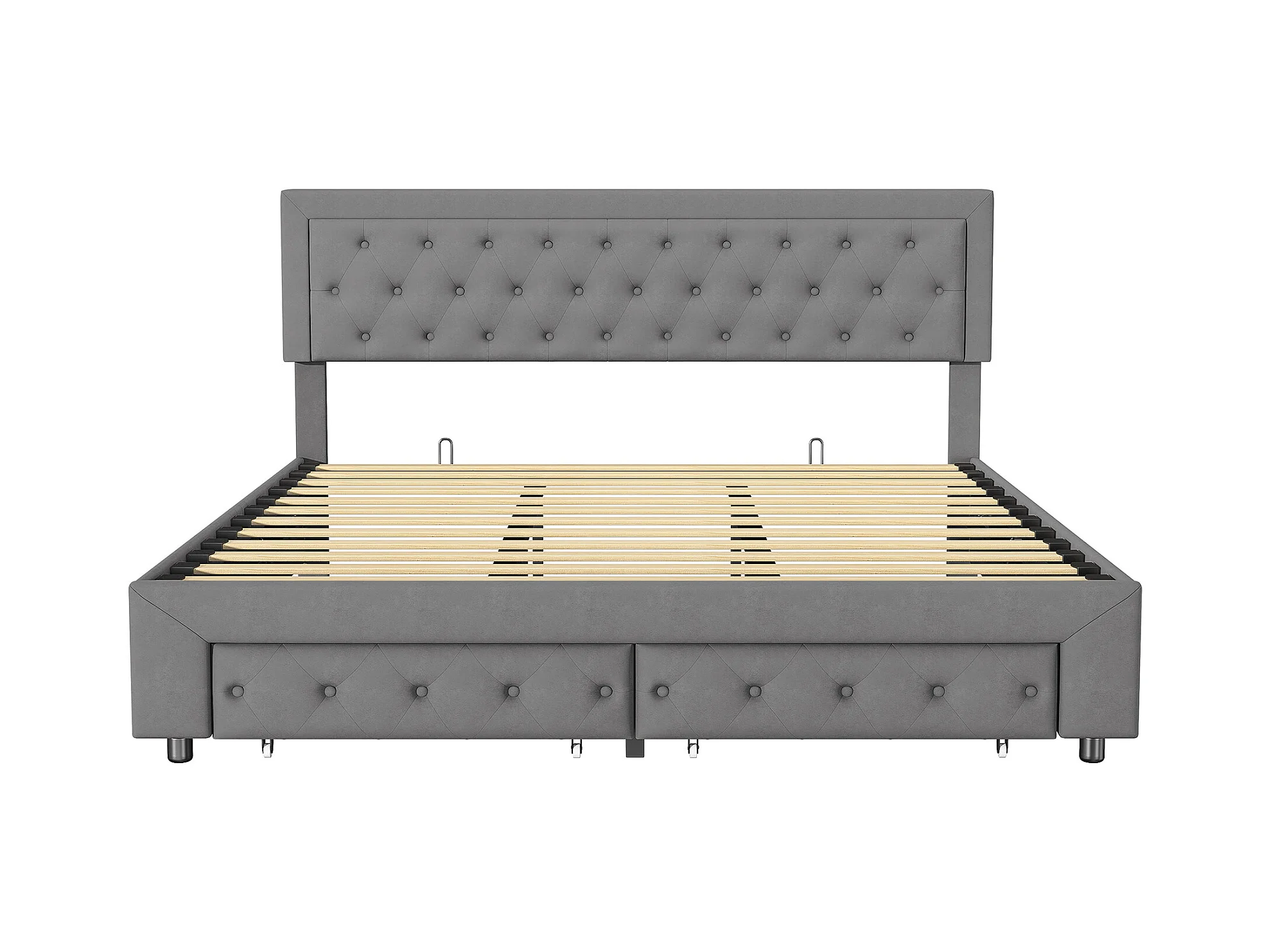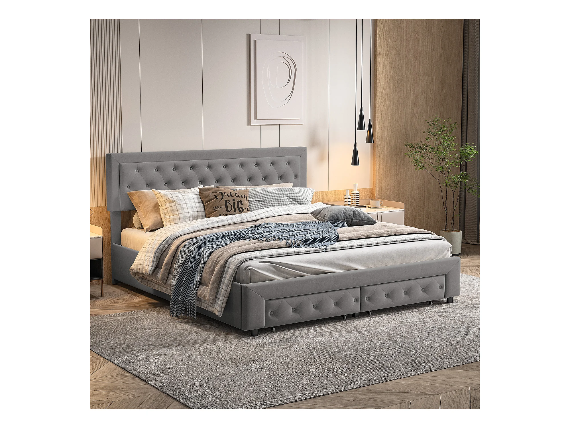 Letto contenitore 160x200 con 2 cassetti, Letto imbottito con rete a doghe, tessuto in velluto e decorazione con bottoni, grigio
