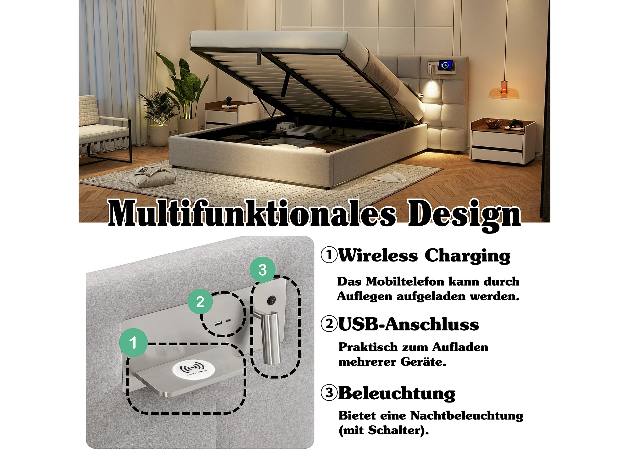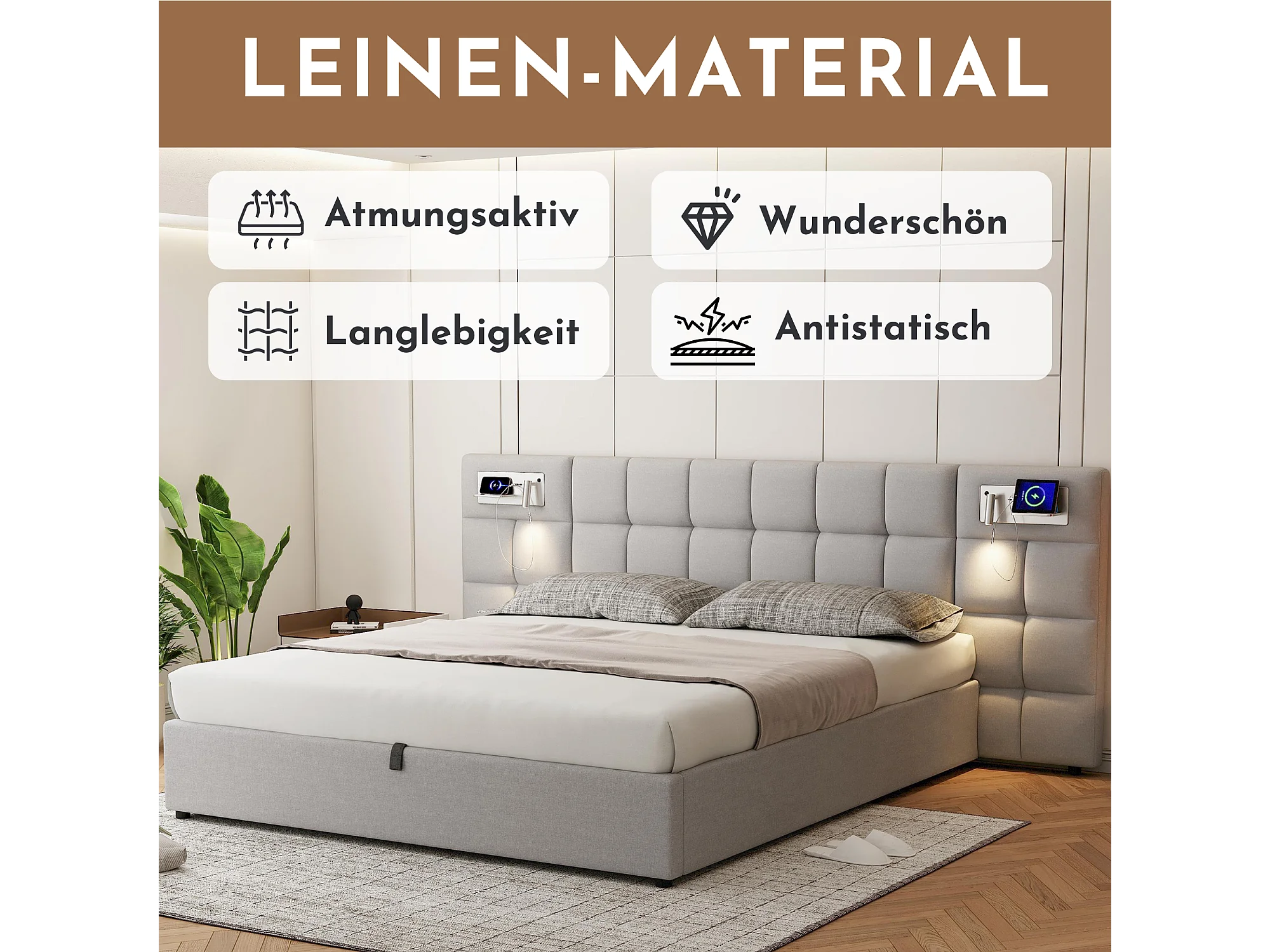 Letto contenitore 180 x 200 cm con testiera ampia - Porta USB e ricarica wireless e lampada luminosa - Tessuto di lino - Grigio (senza materasso)