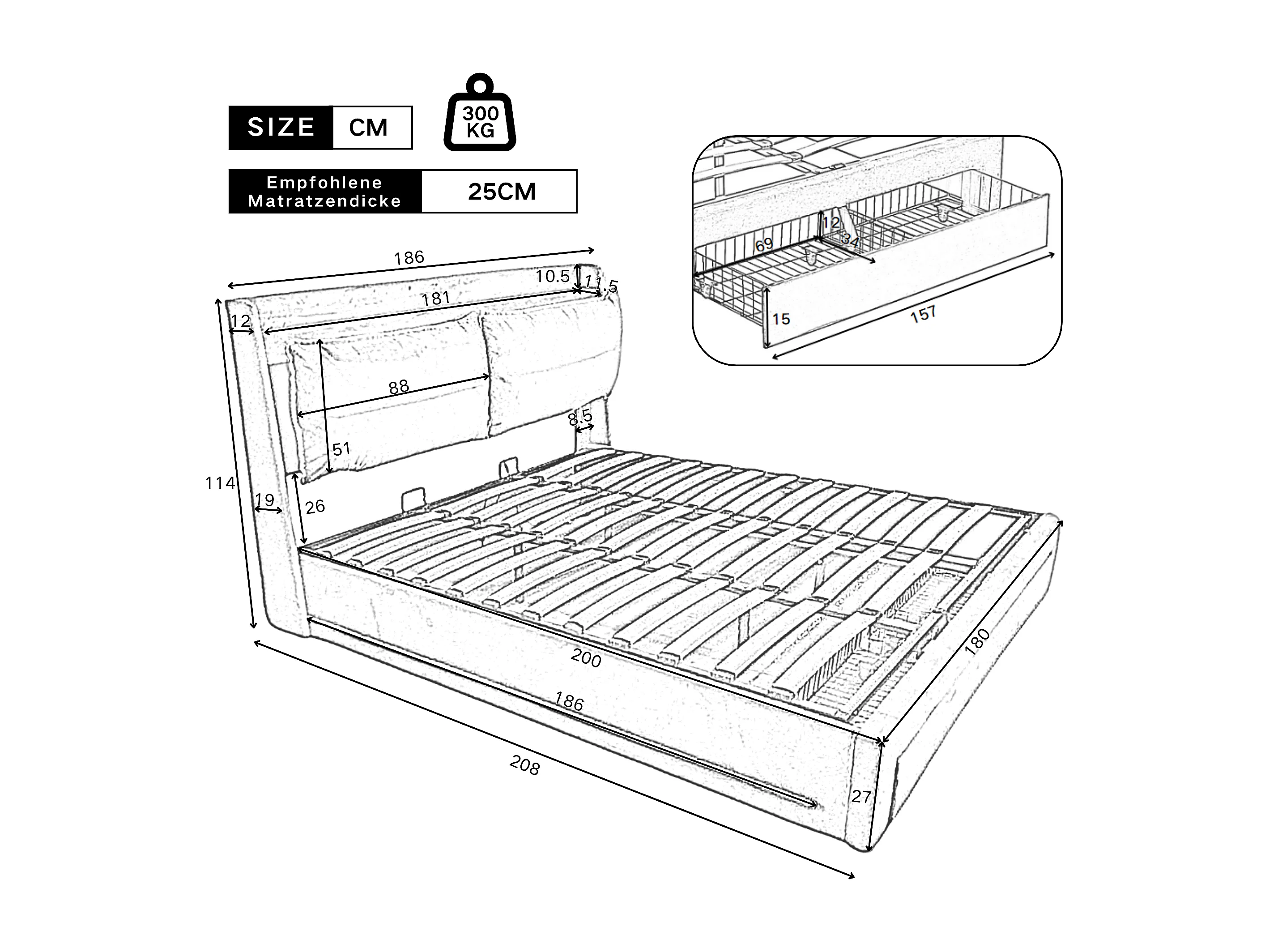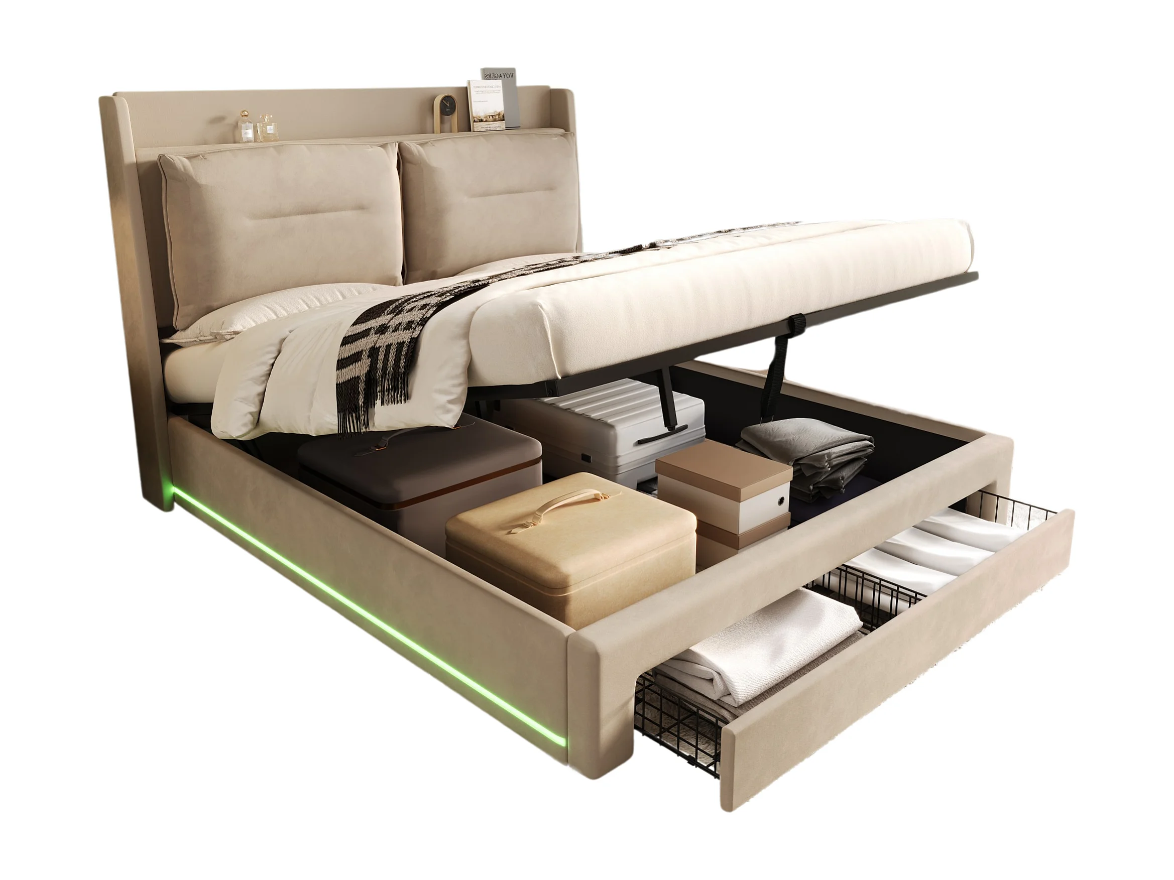 Letto contenitore 180 x 200 cm con testiera e 2 cassetti - LED - Velluto - Beige (senza materasso)