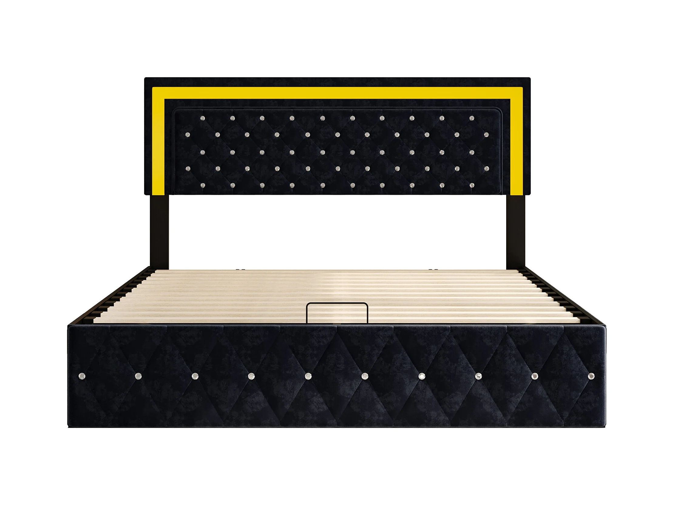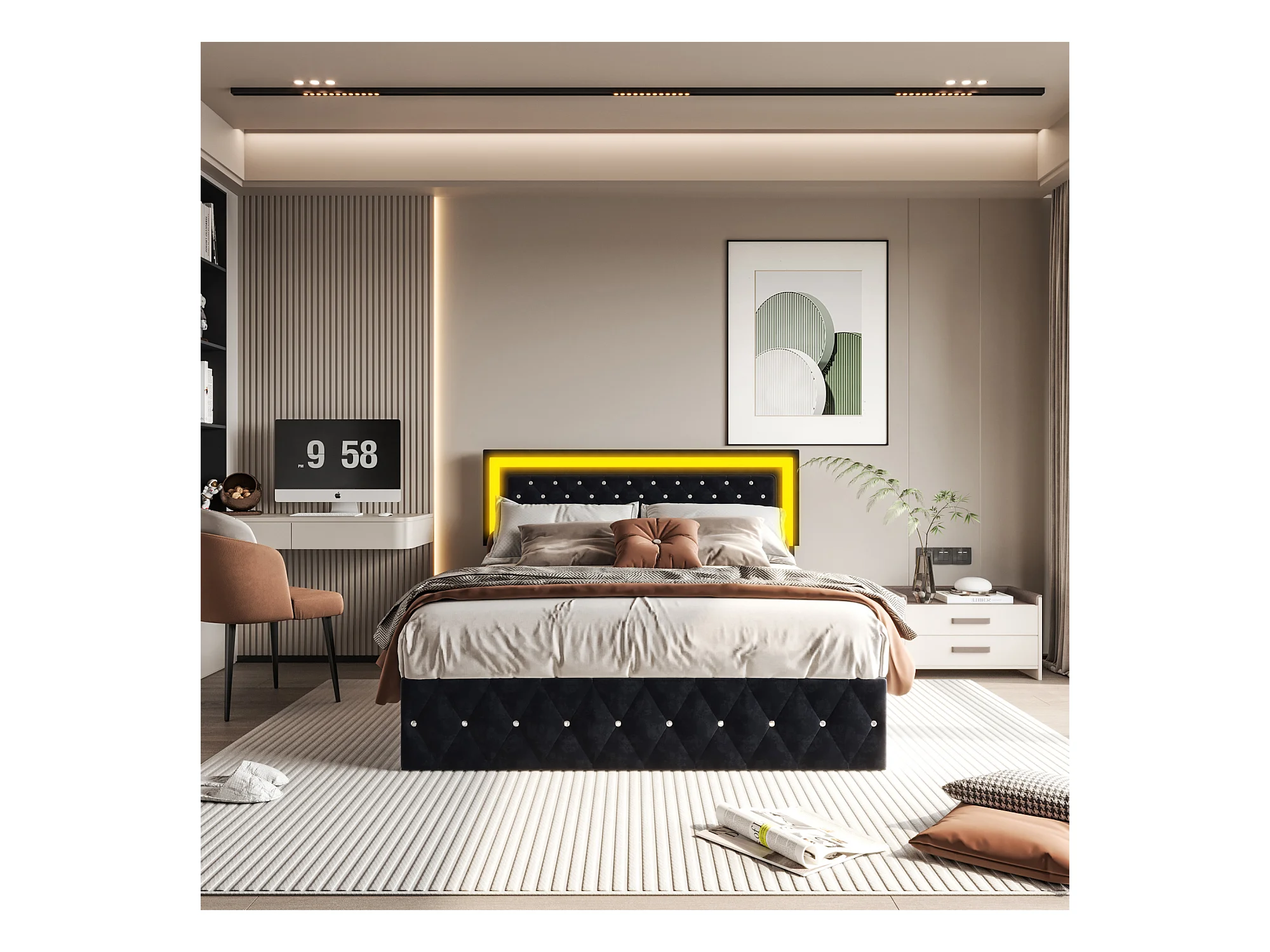 Letto contenitore 180x200 cm con LED e contenitore, letto matrimoniale con testiera regolabile, velluto, nero