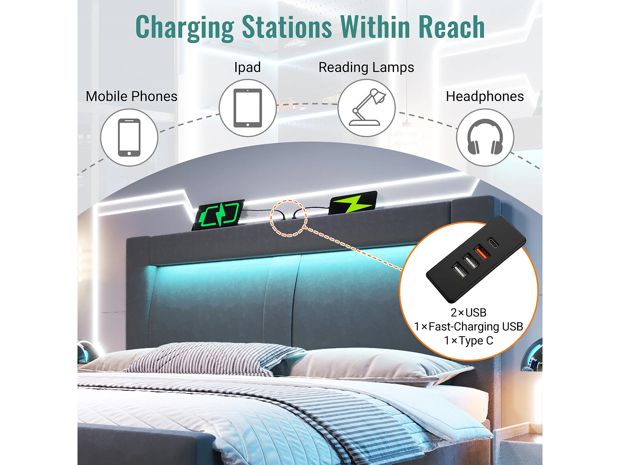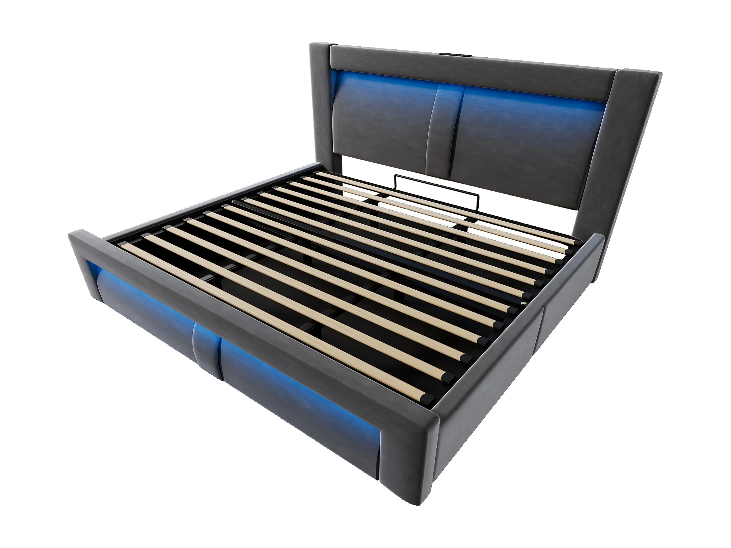 Letto contenitore 180x200 cm con LED e USB - Letto matrimoniale per adulti in velluto grigio (materasso non incluso)