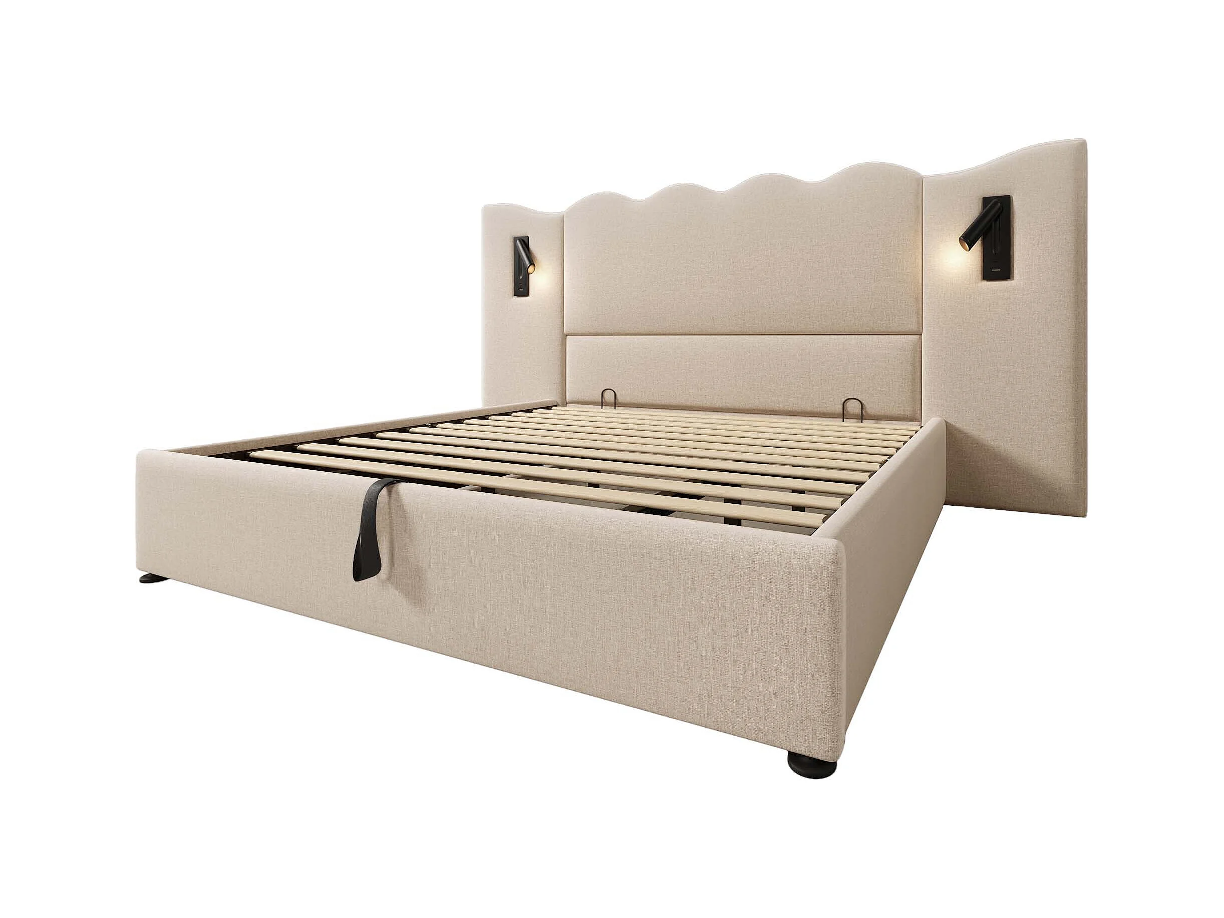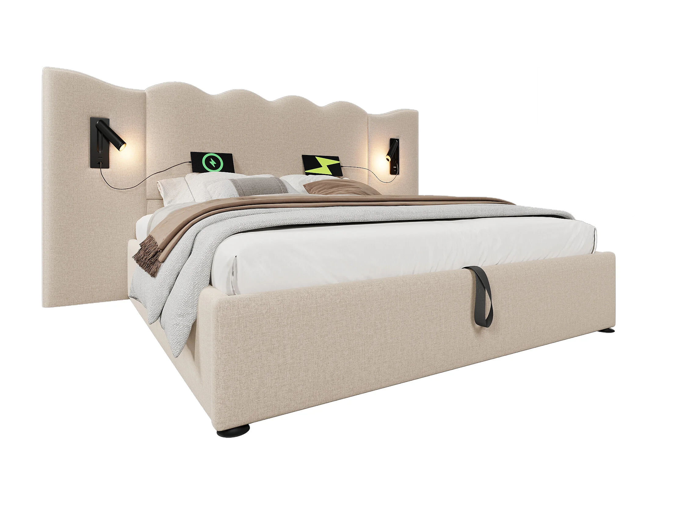 Letto contenitore 180x200 cm - con testiera, porte USB/Type-C, rete a doghe - lino - beige - materasso non incluso