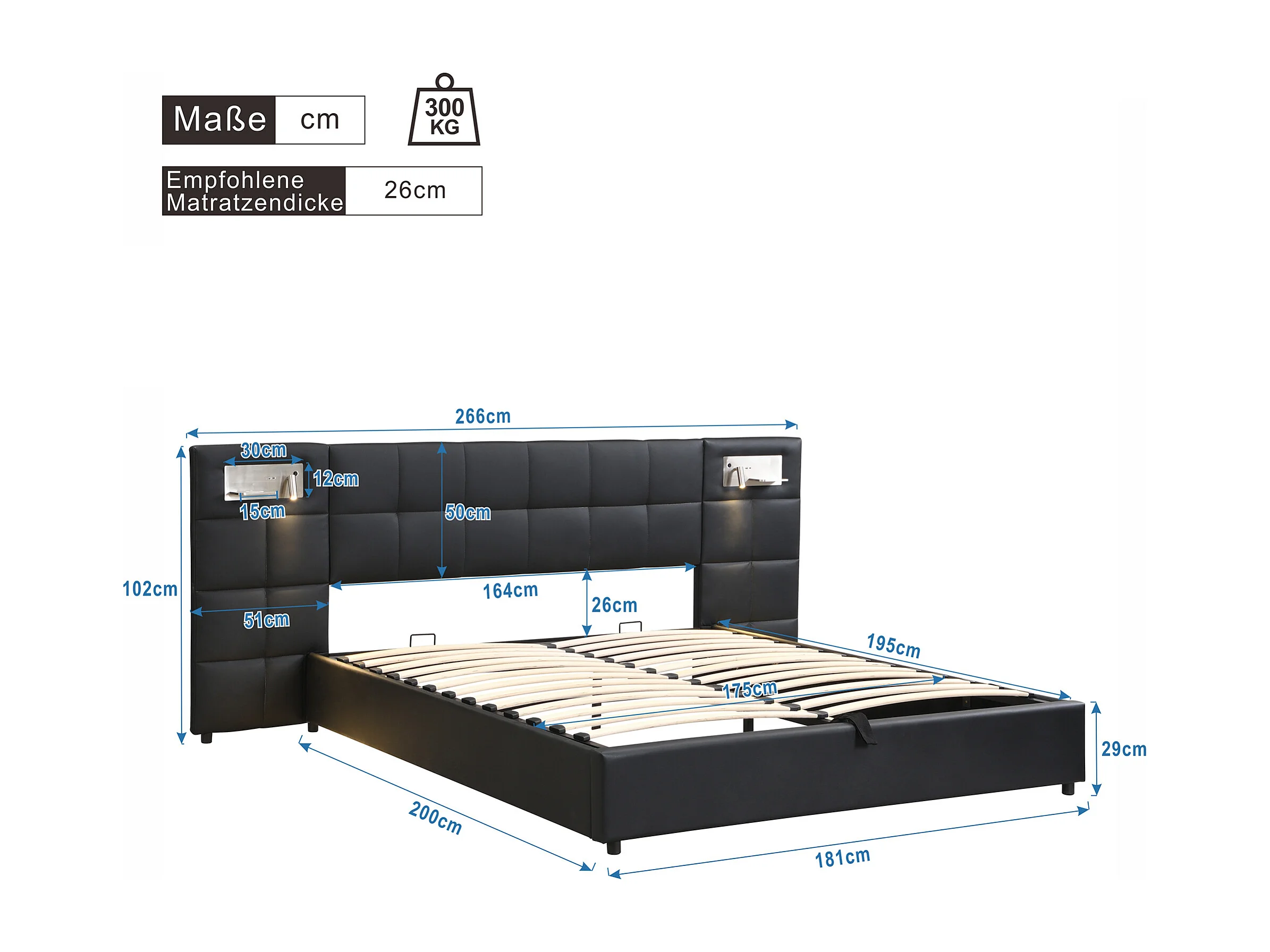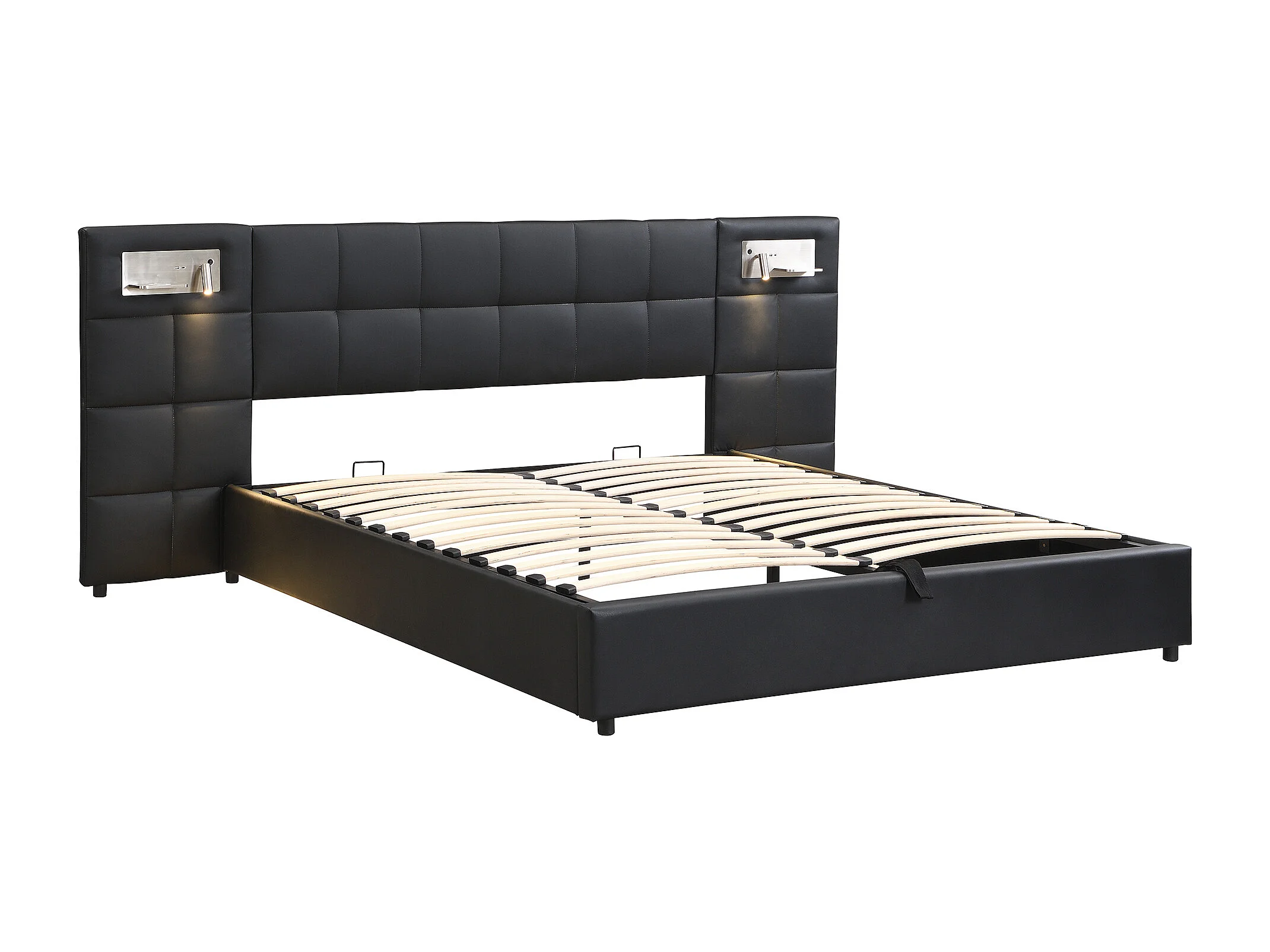 Letto contenitore 180x200 cm - con testiera, USB, rete a doghe - nero - senza materasso