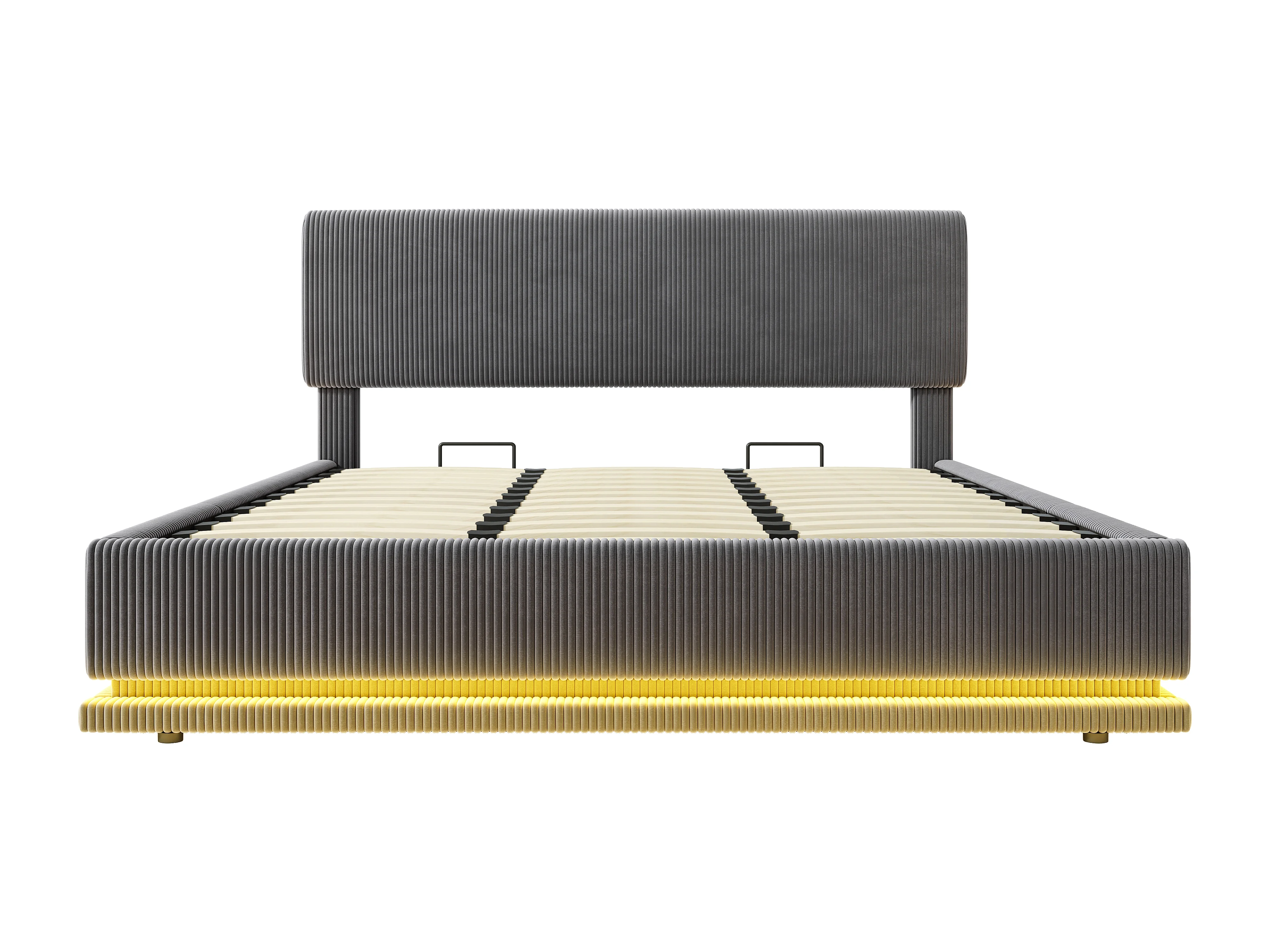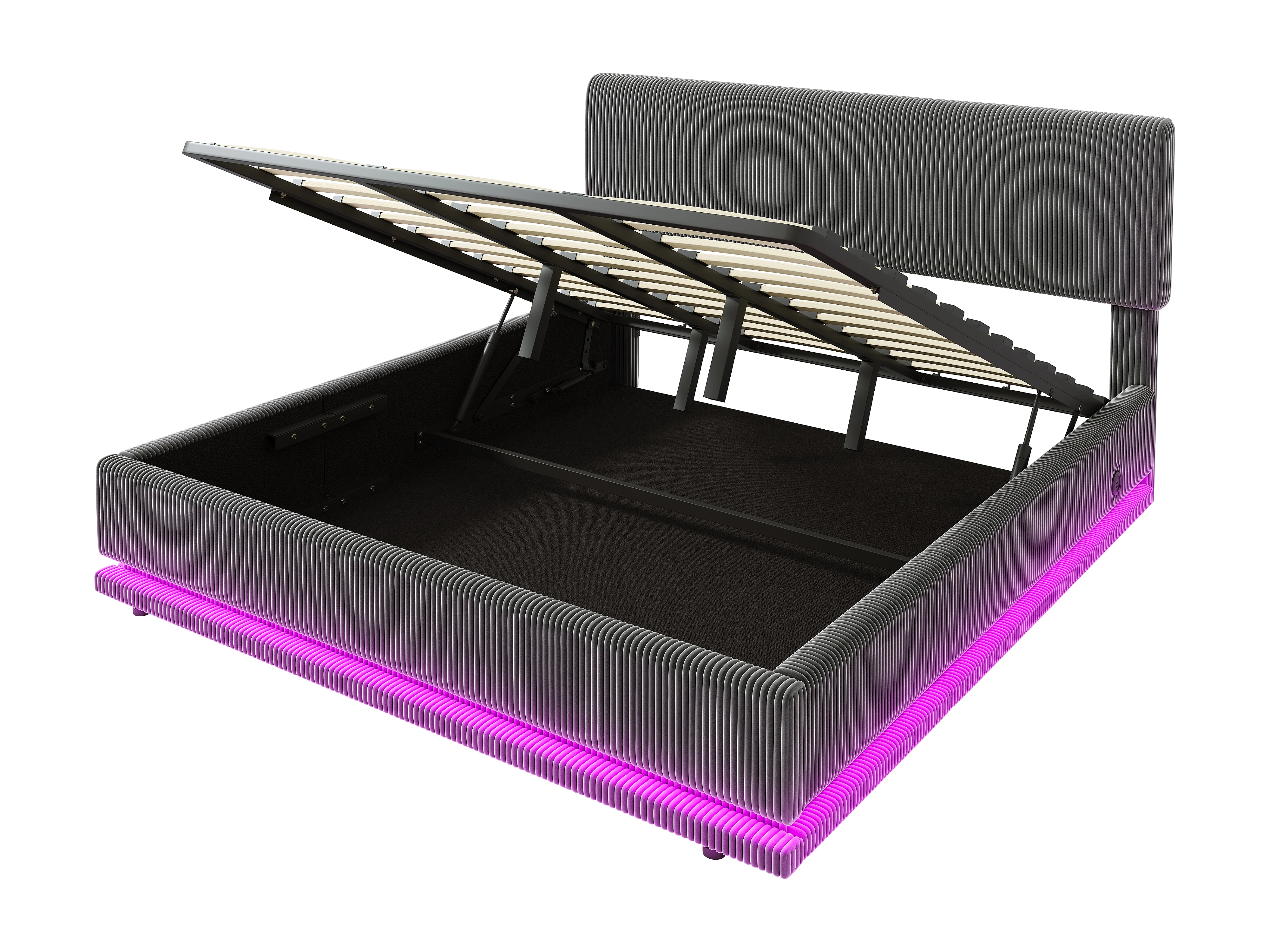 Letto contenitore 180x200 cm in velluto a coste grigio scuro - Letto matrimoniale per adulti con testiera regolabile, illuminazione a LED e porte USB