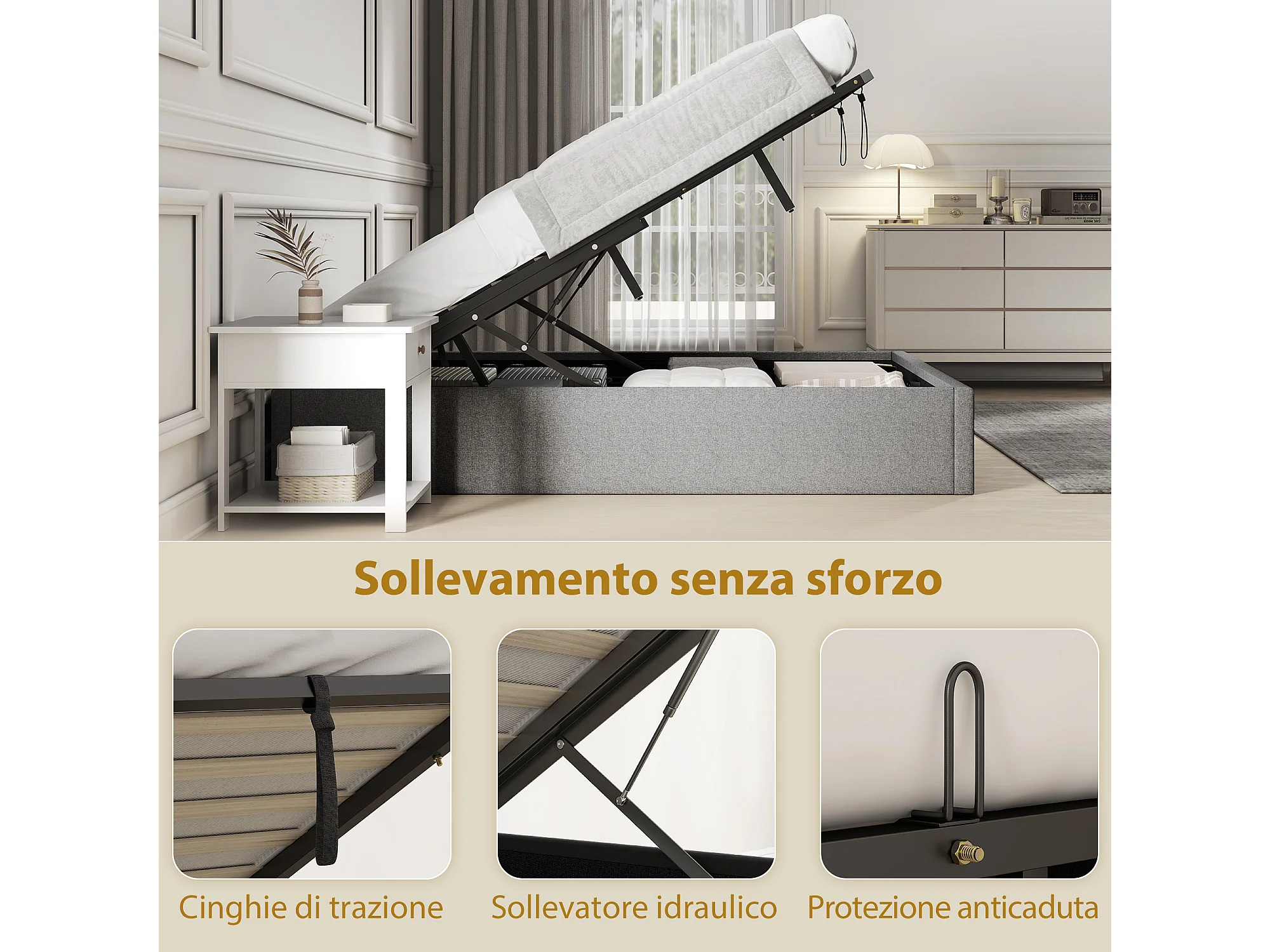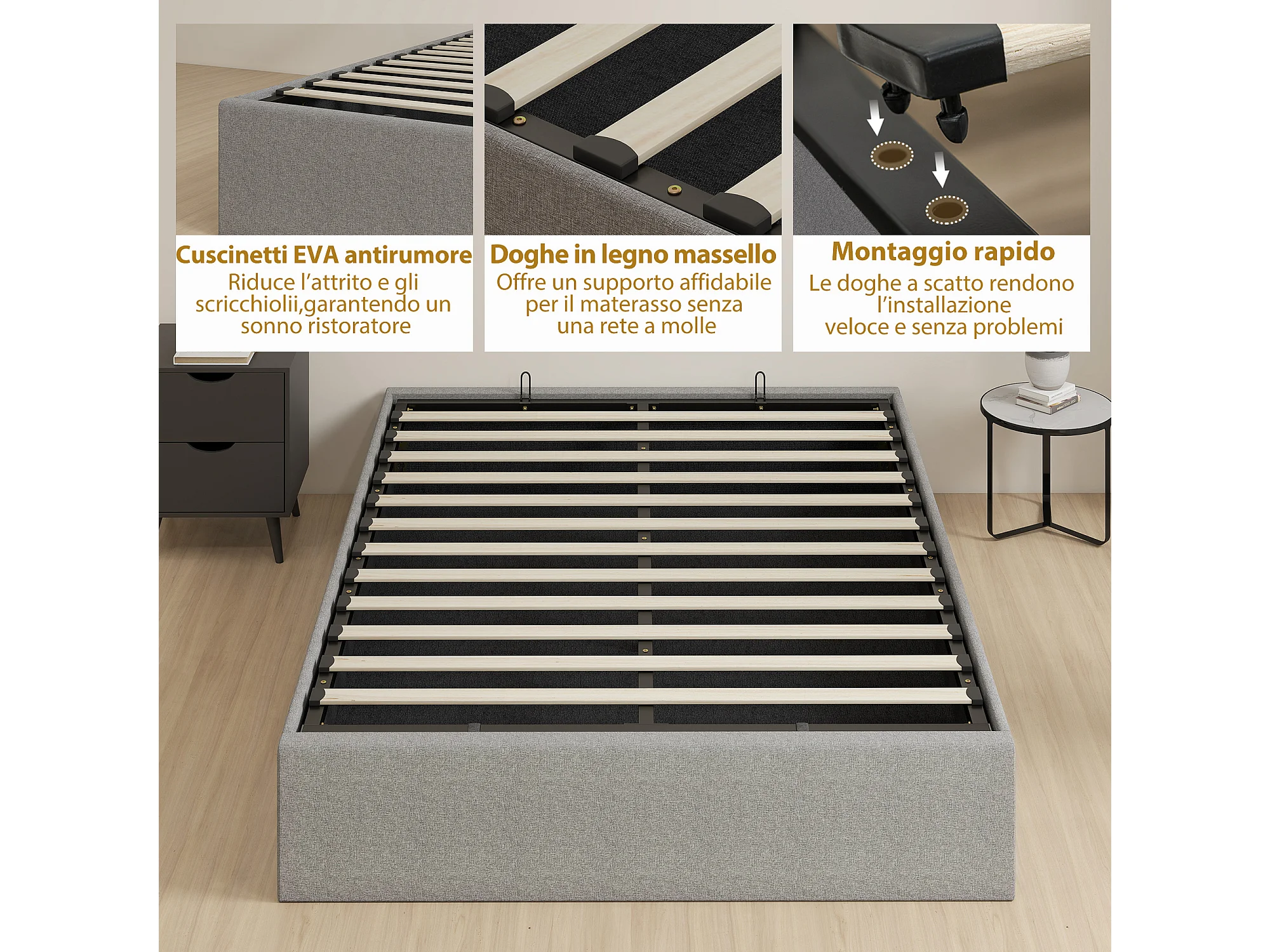 Letto contenitore 190x140 cm con doghe in legno e tessuto grigio