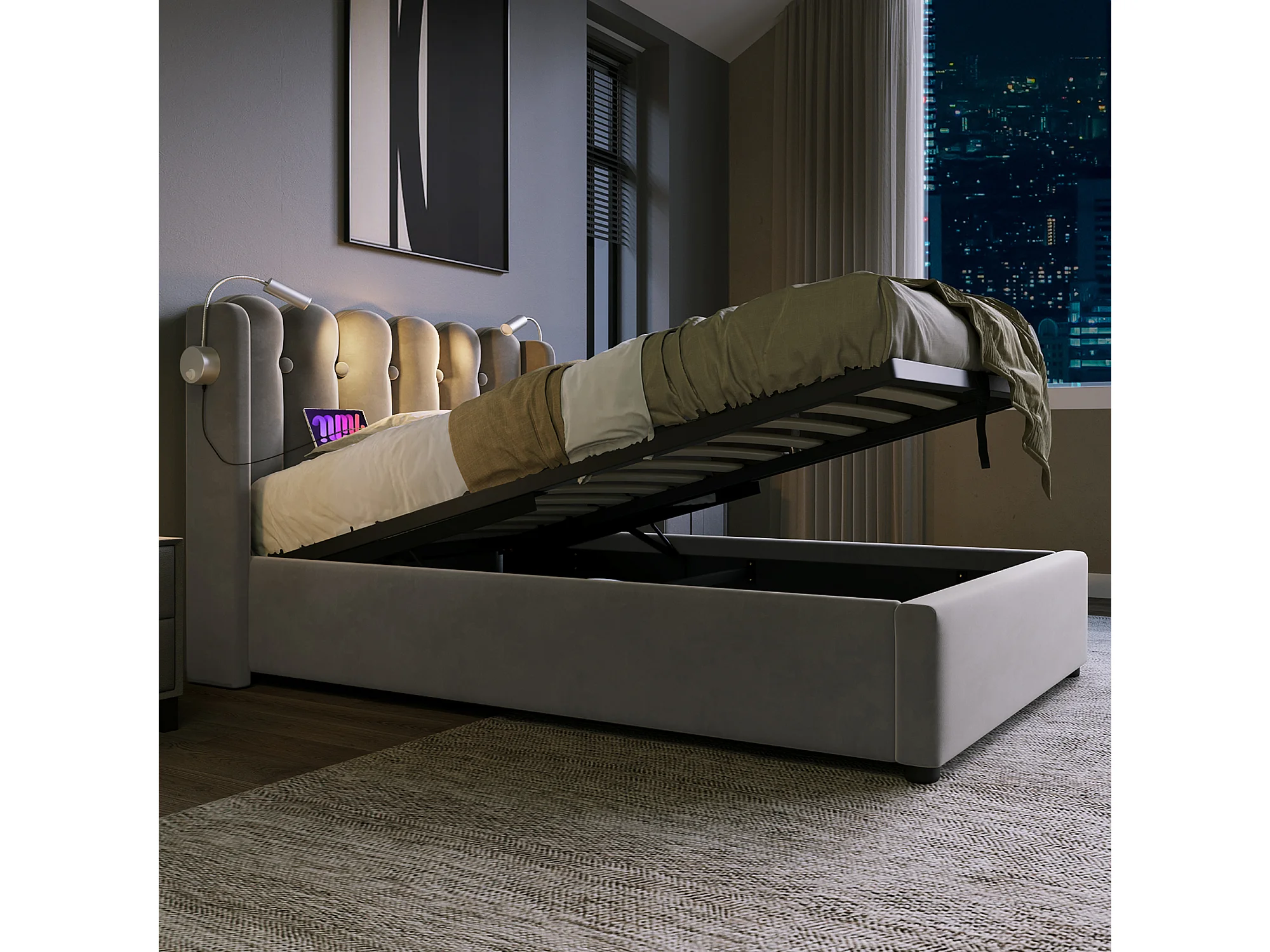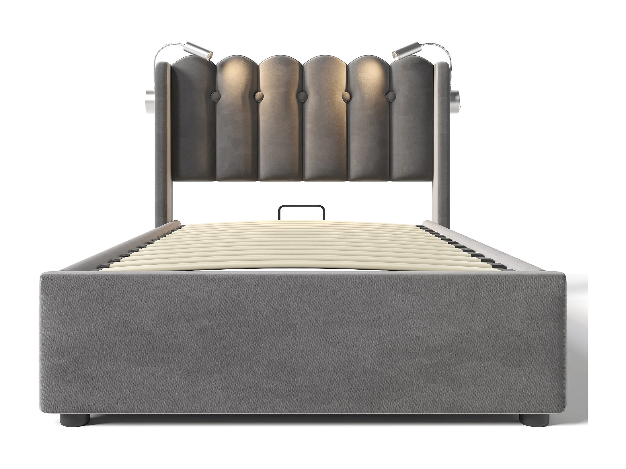 Letto contenitore 90 x 200 cm - Letto singolo con luce di lettura ricaricabile - Velluto grigio - Materasso incluso