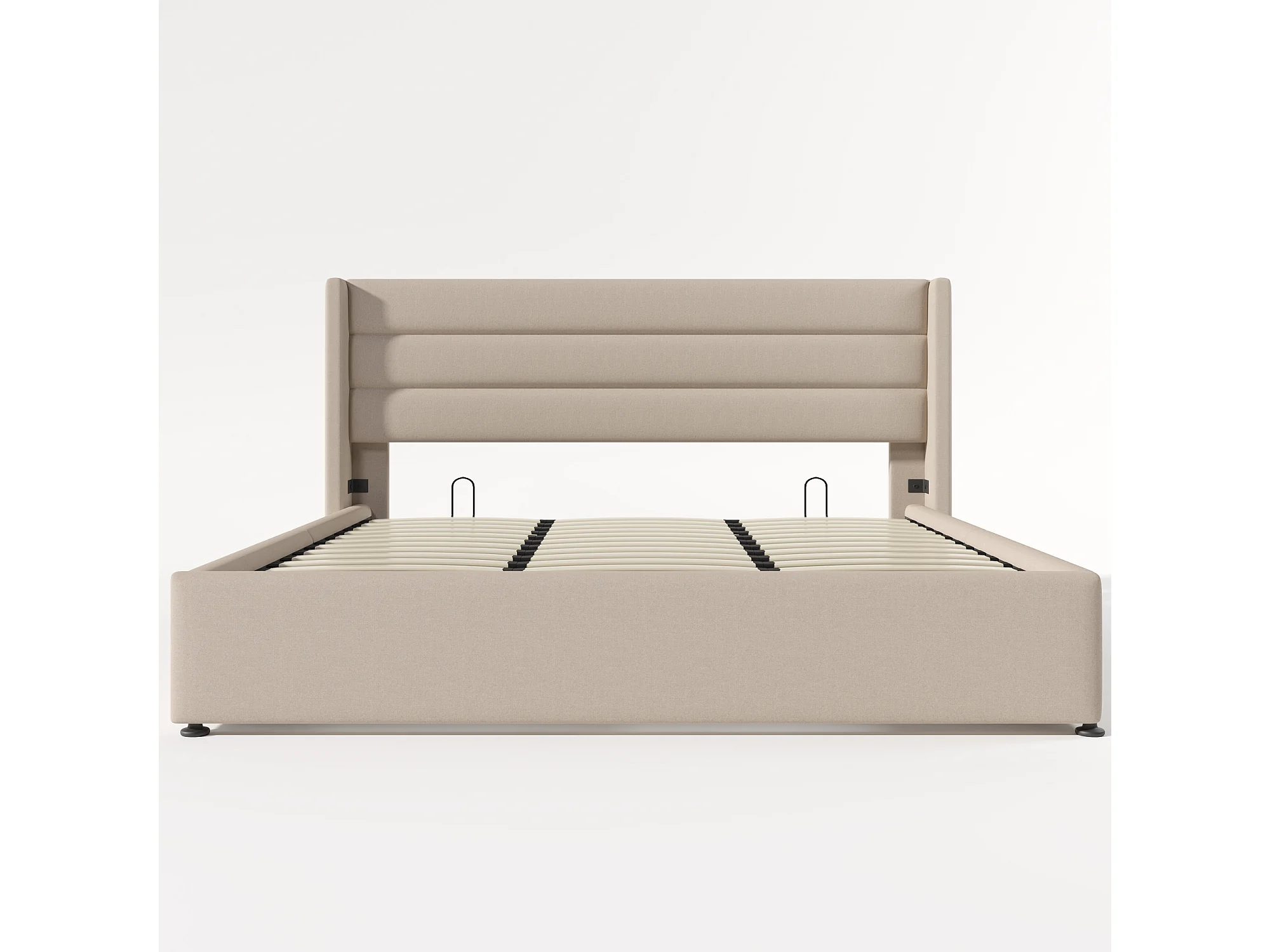 Letto matrimoniale con contenitore, 180x200 cm, lenzuola beige, materasso non incluso.