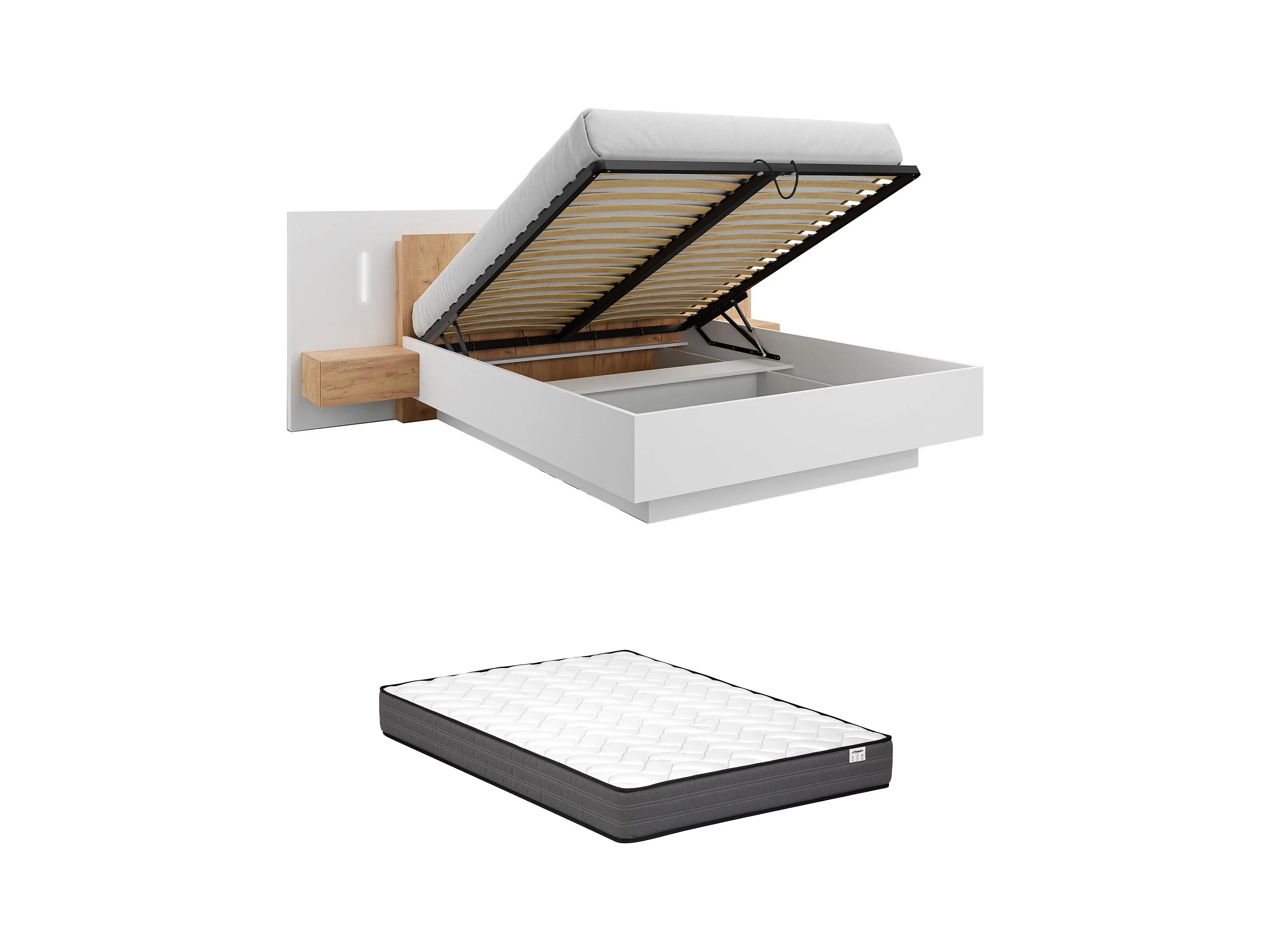 Letto con vano con comodini + Materasso - 2 cassetti - con LED - 160 x 200 cm - Bianco e Naturale - FRANCOLI