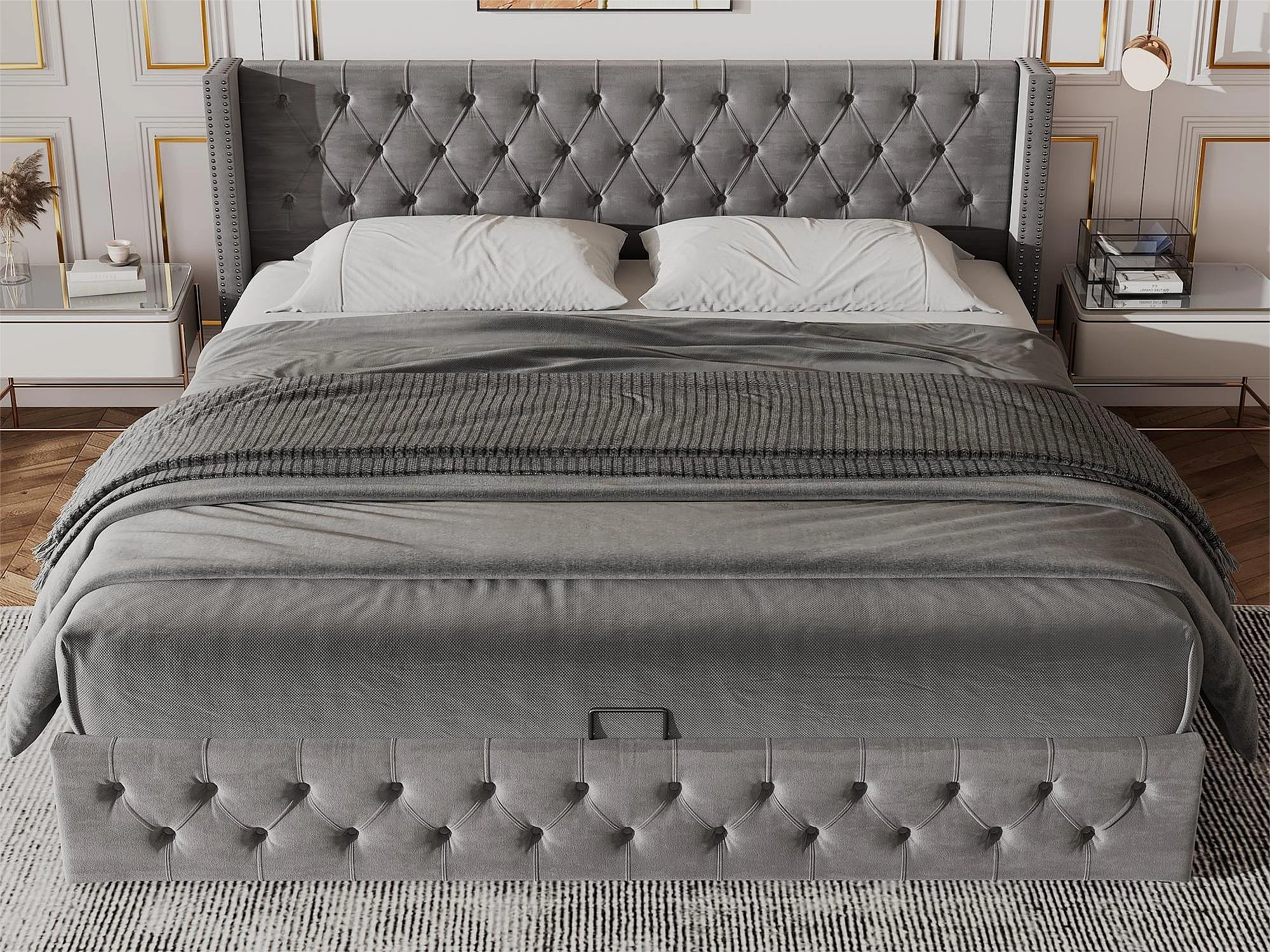 Letto contenitore - 140 x 200 cm - velluto - rete a doghe - stile scandinavo - grigio