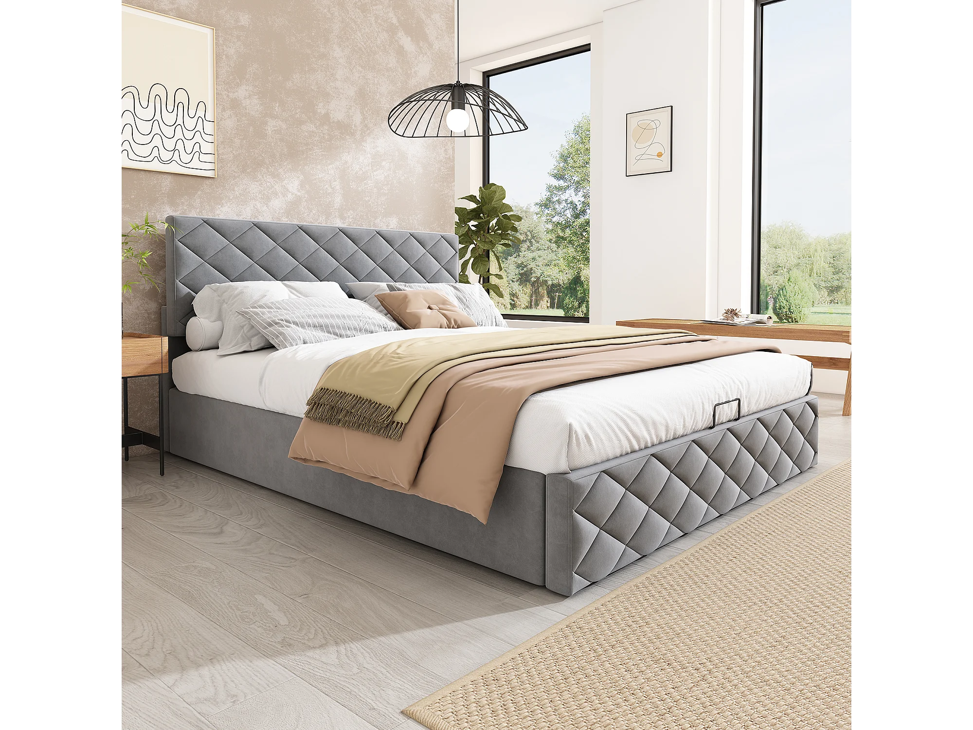 Letto contenitore con testiera regolabile - 140 x 200 cm - velluto - rete a doghe - stile scandinavo - grigio