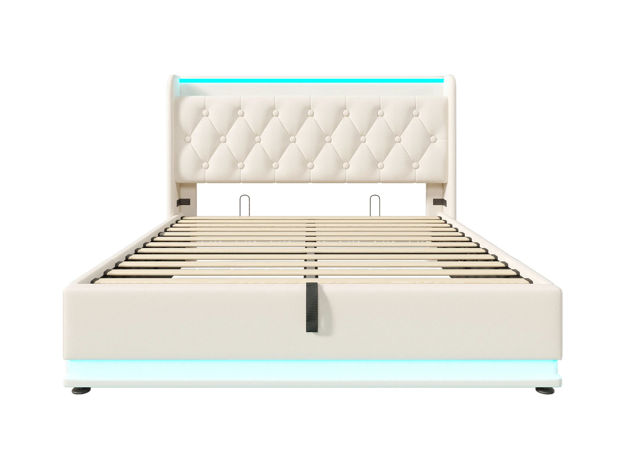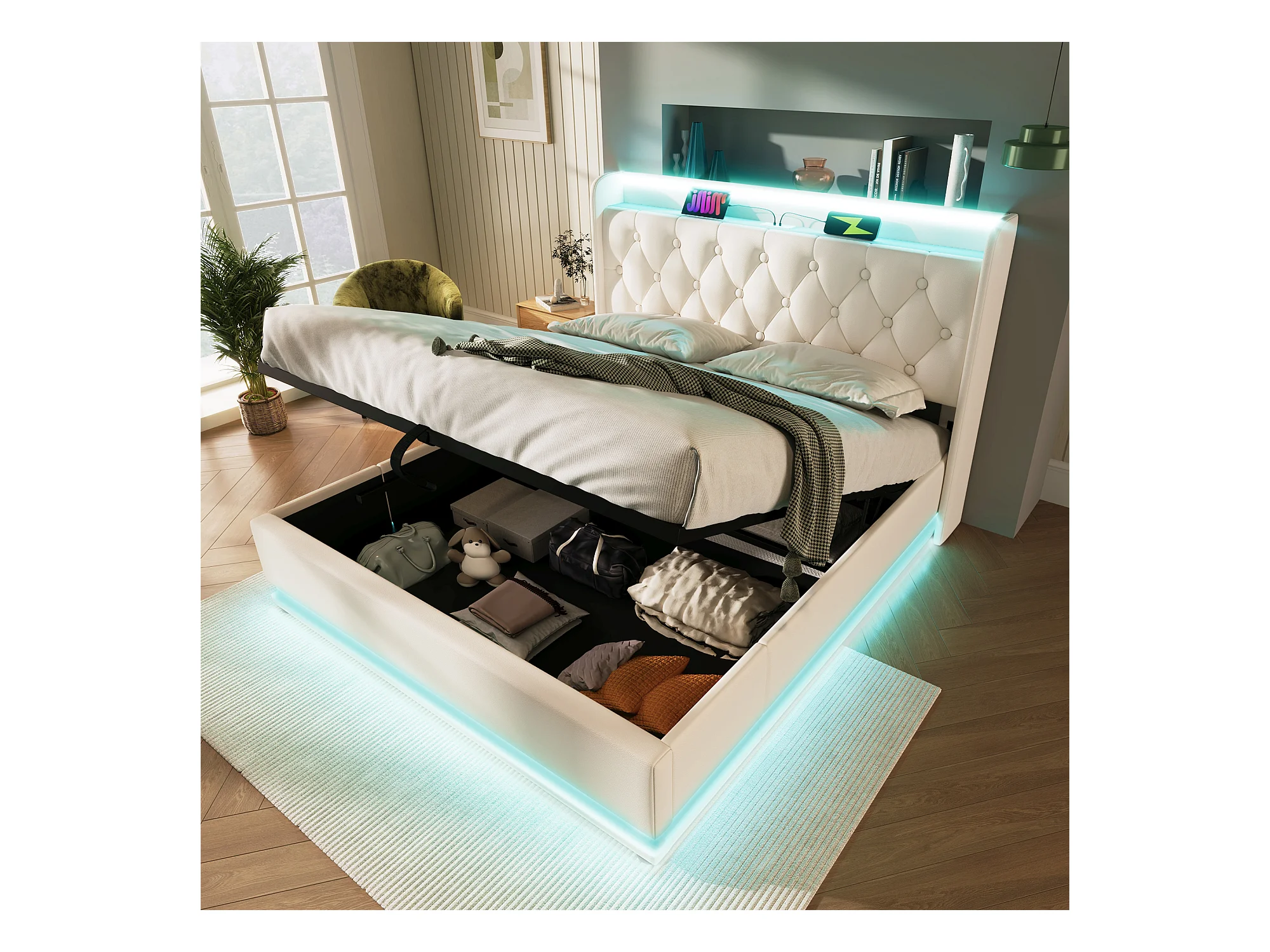 Letto contenitore matrimoniale 140x200 cm, con porta USB Type-C, funzione LED su 3 lati, PU bianco (senza materasso)