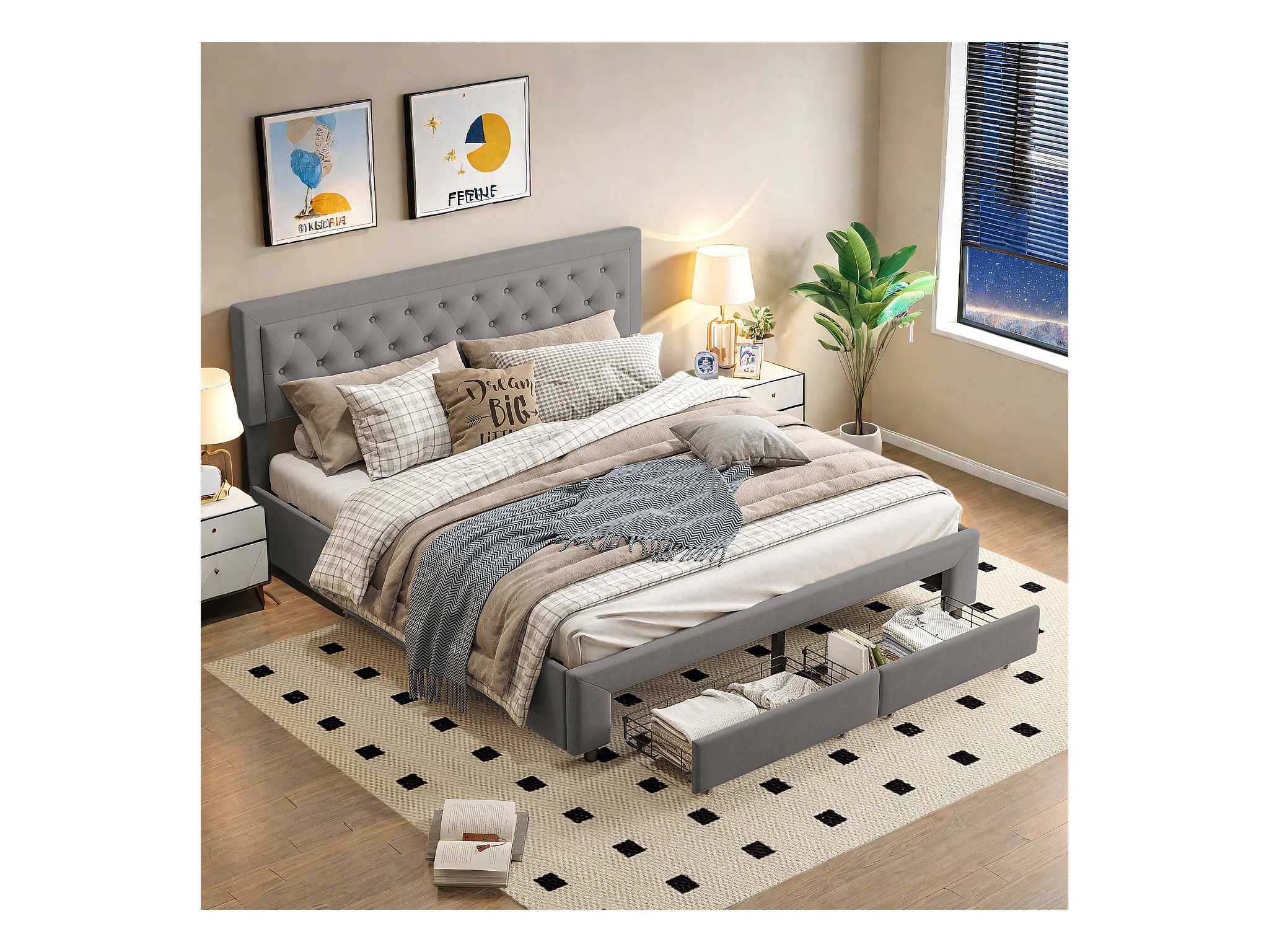 Letto matrimoniale 160x200 cm in tessuto effetto lino grigio con 2 cassetti, testiera con tasche laterali, contenitore integrato e illuminazione LED ambientale