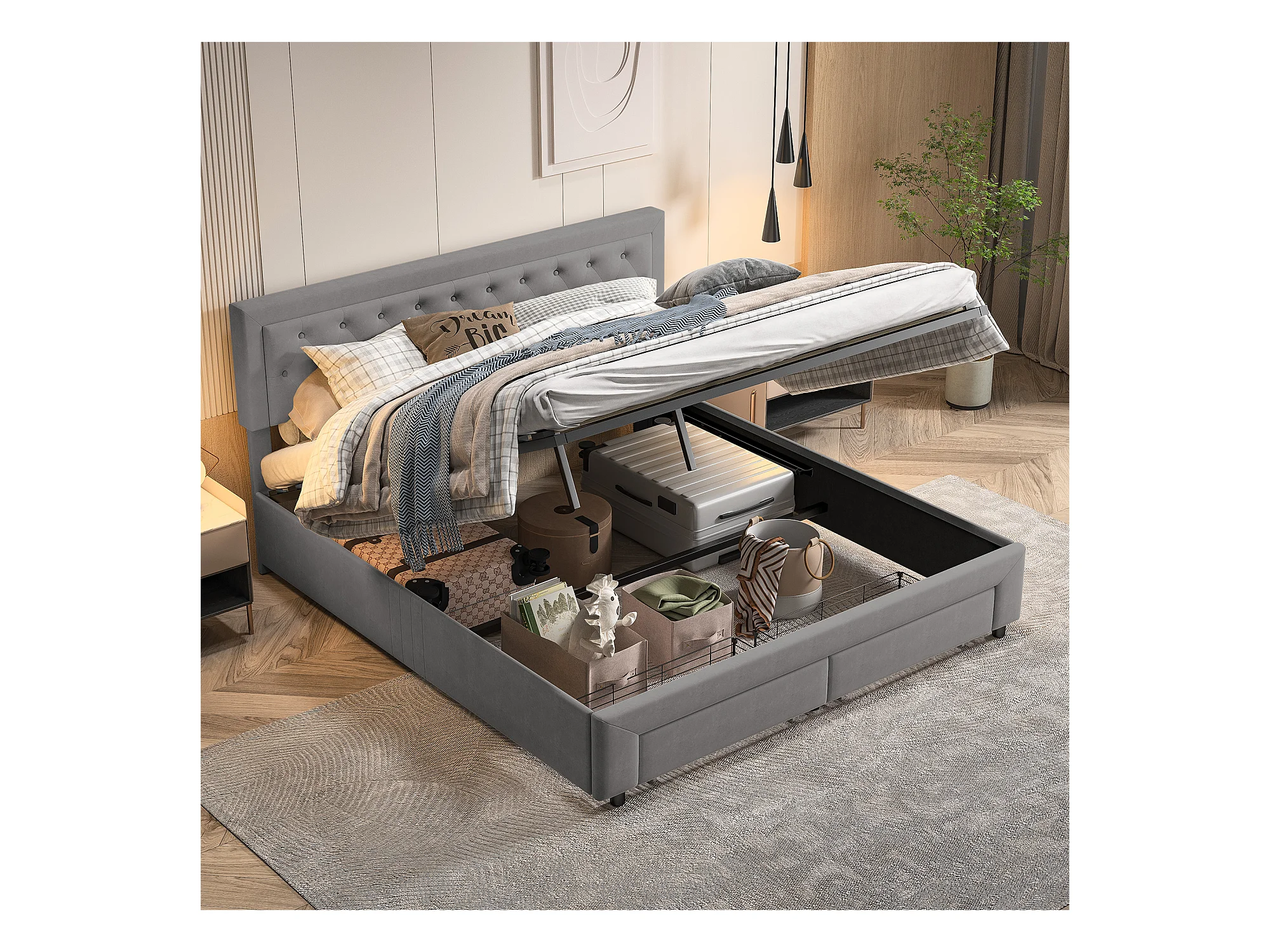 Letto contenitore grigio 160 x 200 cm, in velluto, con testiera imbottita regolabile in altezza, letto contenitore con cassetti e doghe in legno