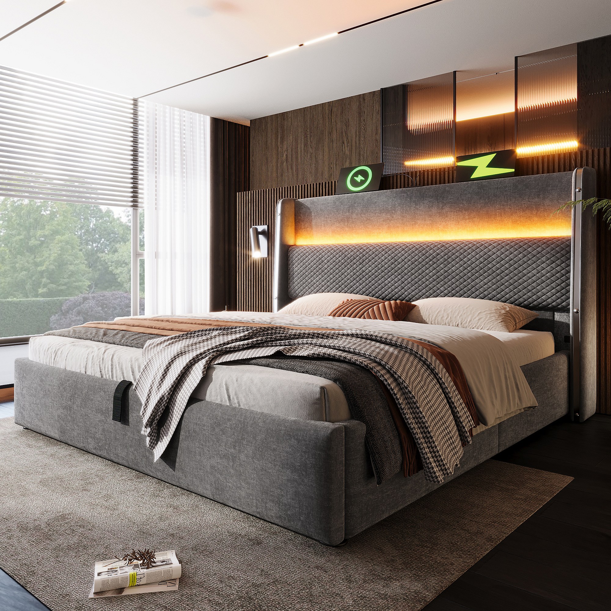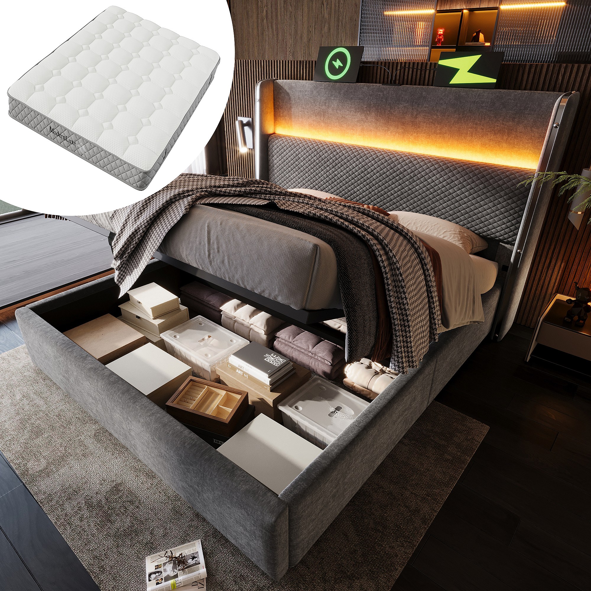Letto contenitore idraulico con testiera + LED e porte USB/Type-C - 180 x 200 cm - lino - grigio (con materasso)