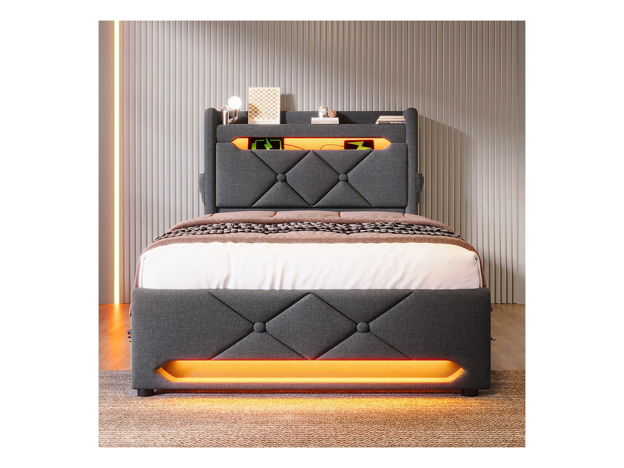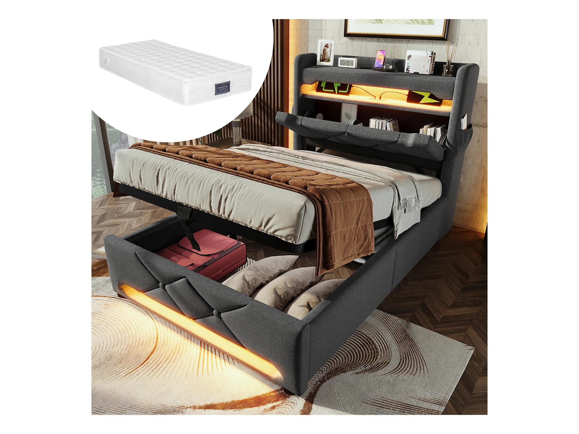 Letto contenitore imbottito - 90 x 200 cm - testiera con USB + Type-C + LED - contenitore idraulico - con materasso - lino - grigio