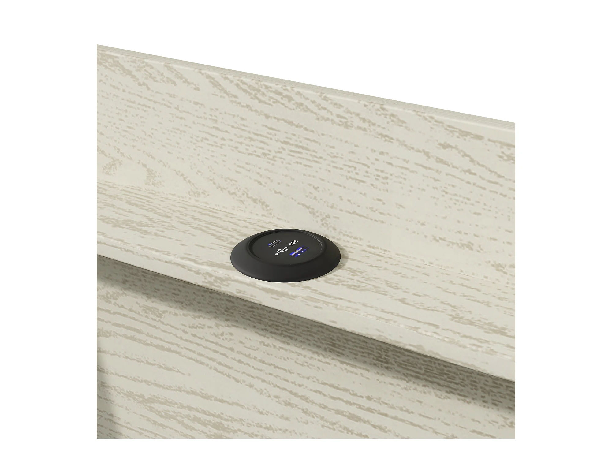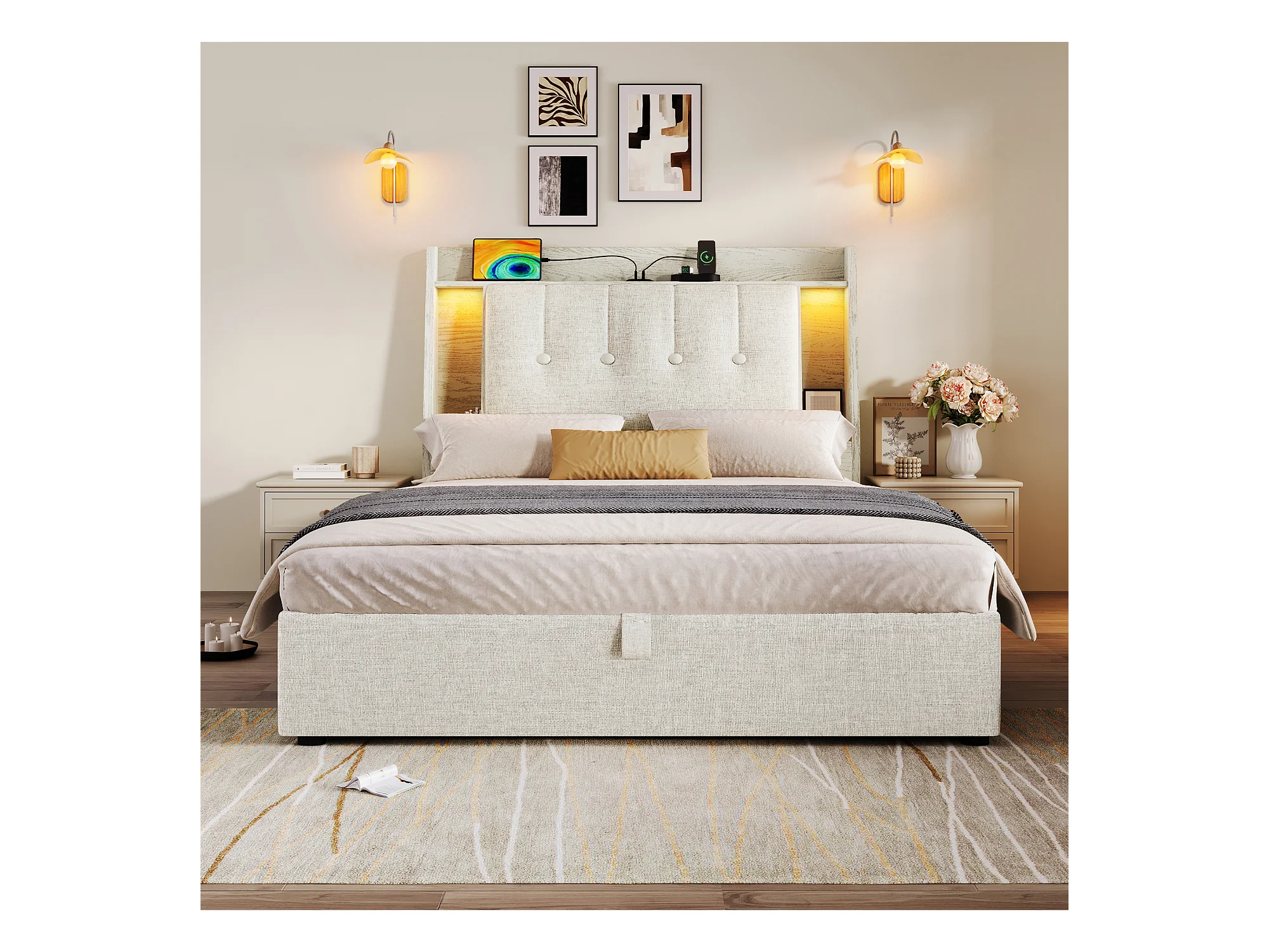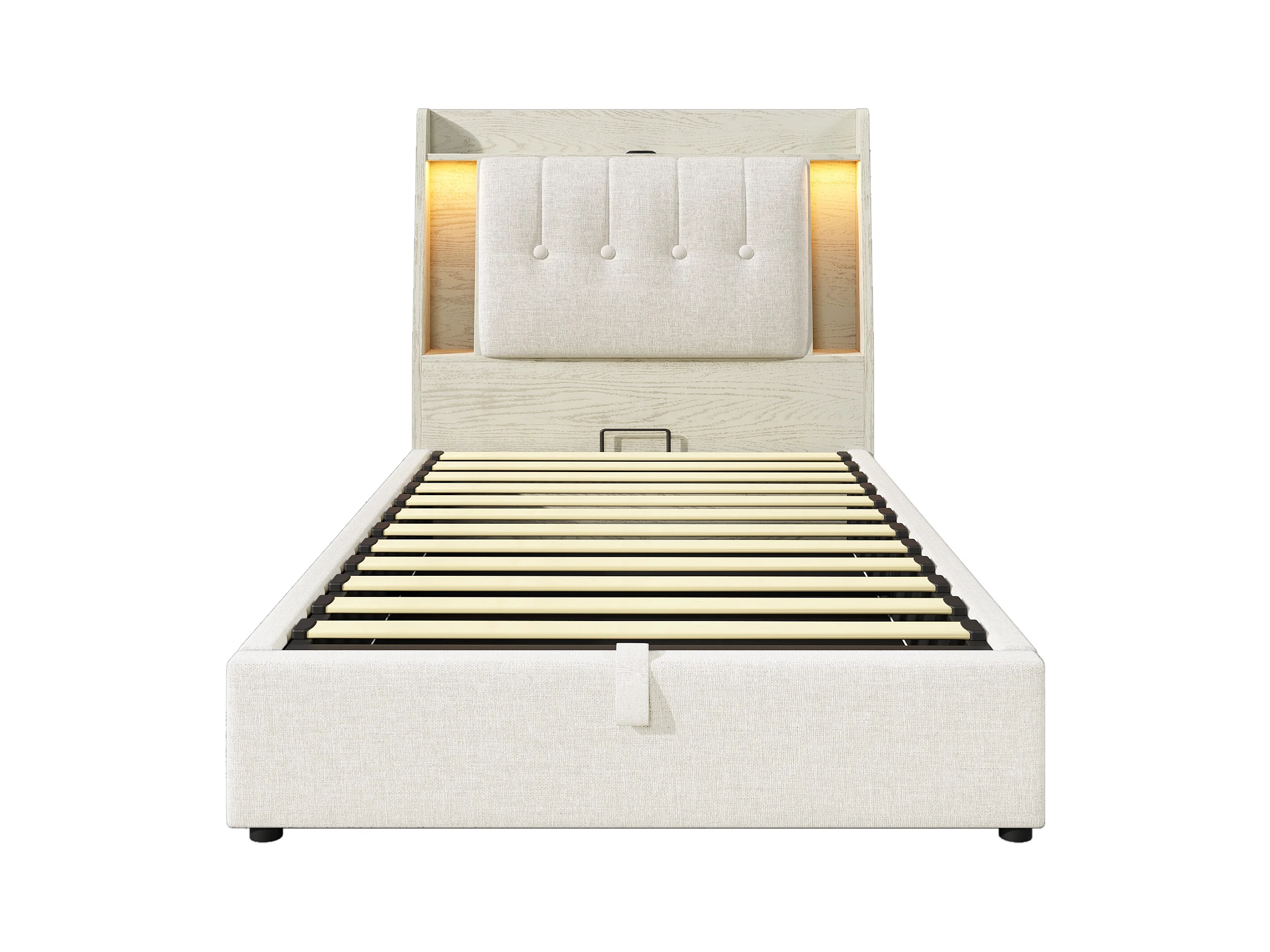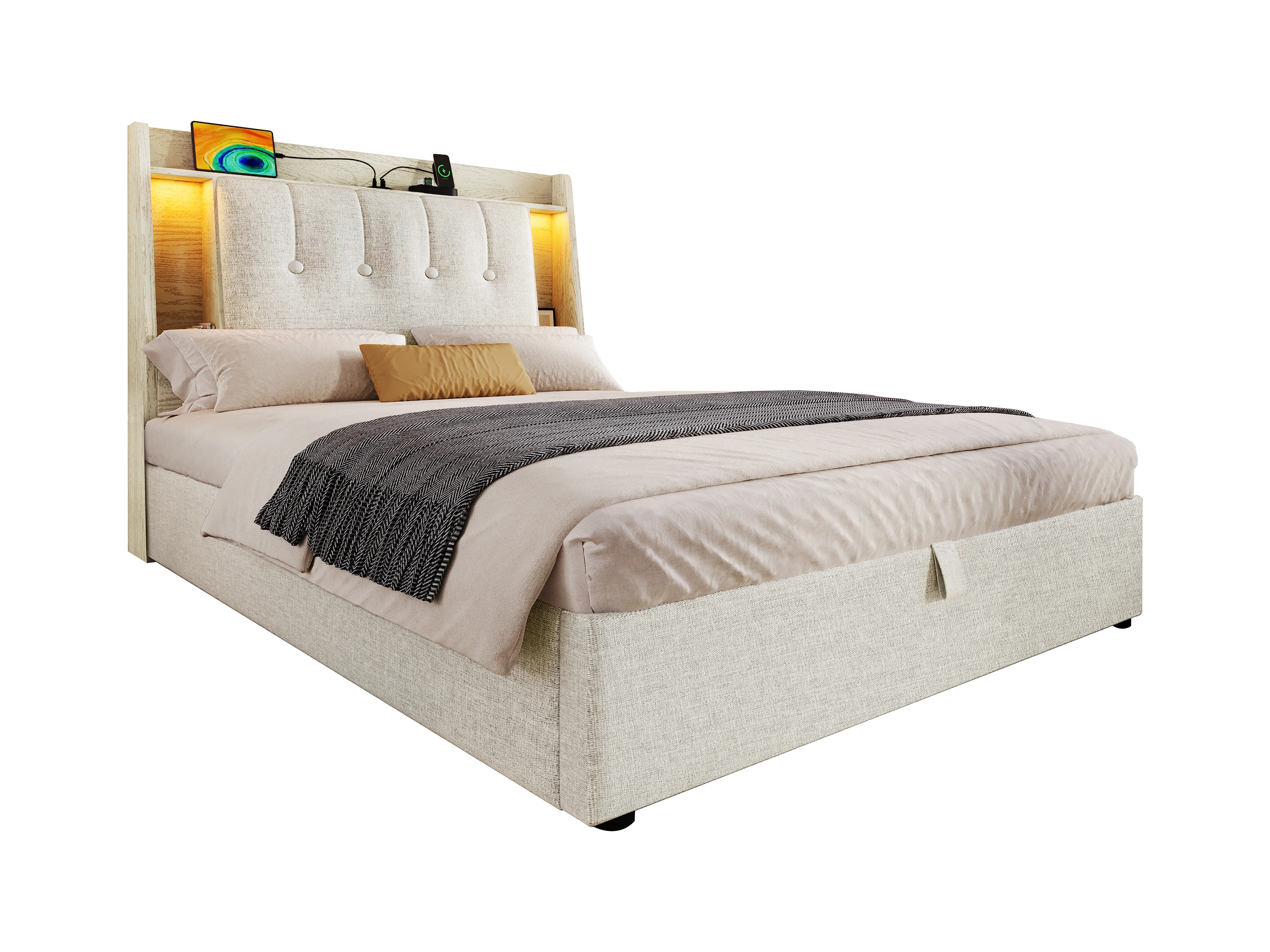 Letto contenitore imbottito 90x200 cm - con ricarica USB Tipo-C - illuminazione LED - lino - beige (materasso non incluso)
