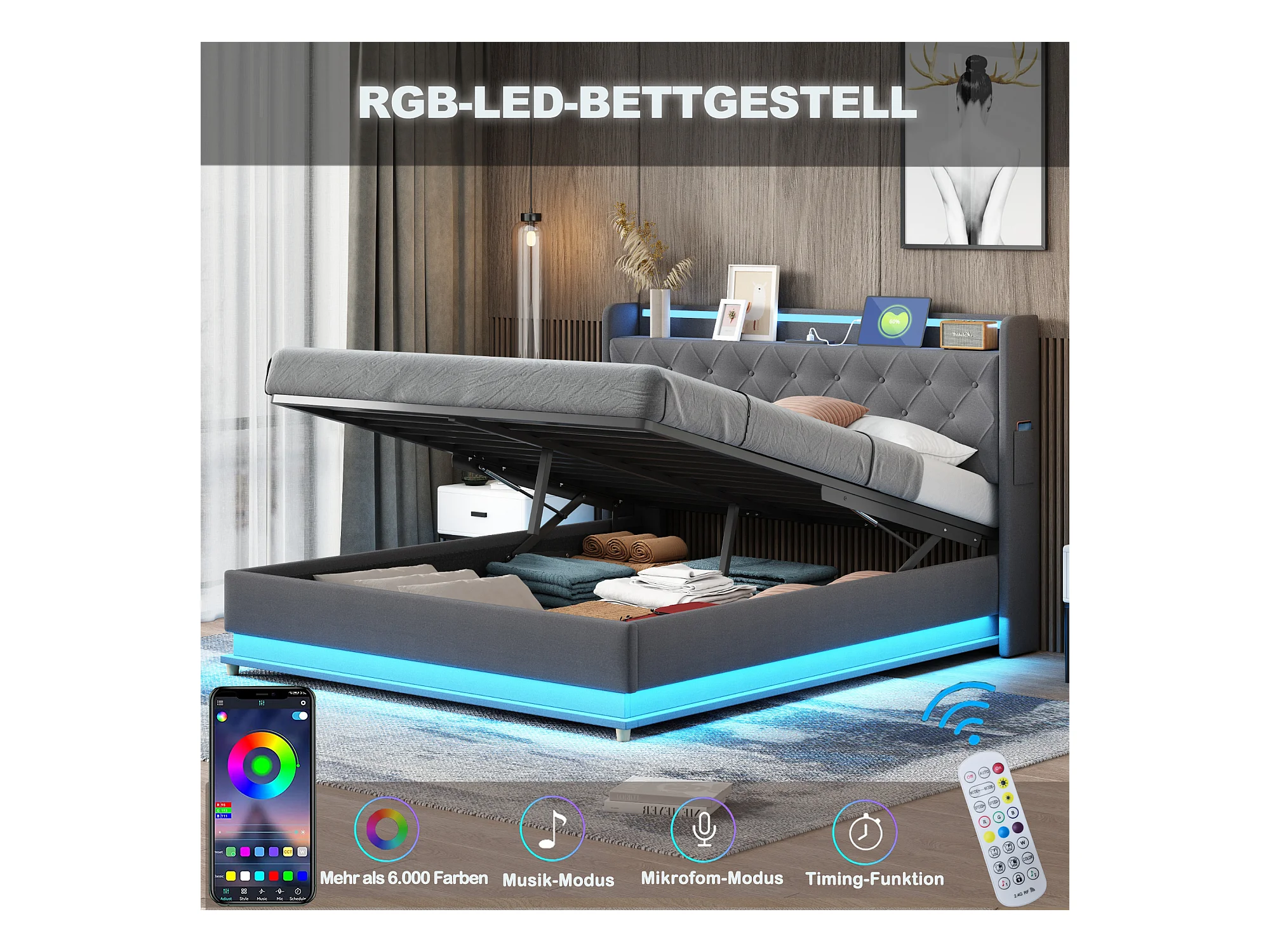 Letto contenitore 160 x 200 cm per adulto - USB + Type C + LED - tessuto lino - grigio + Materasso