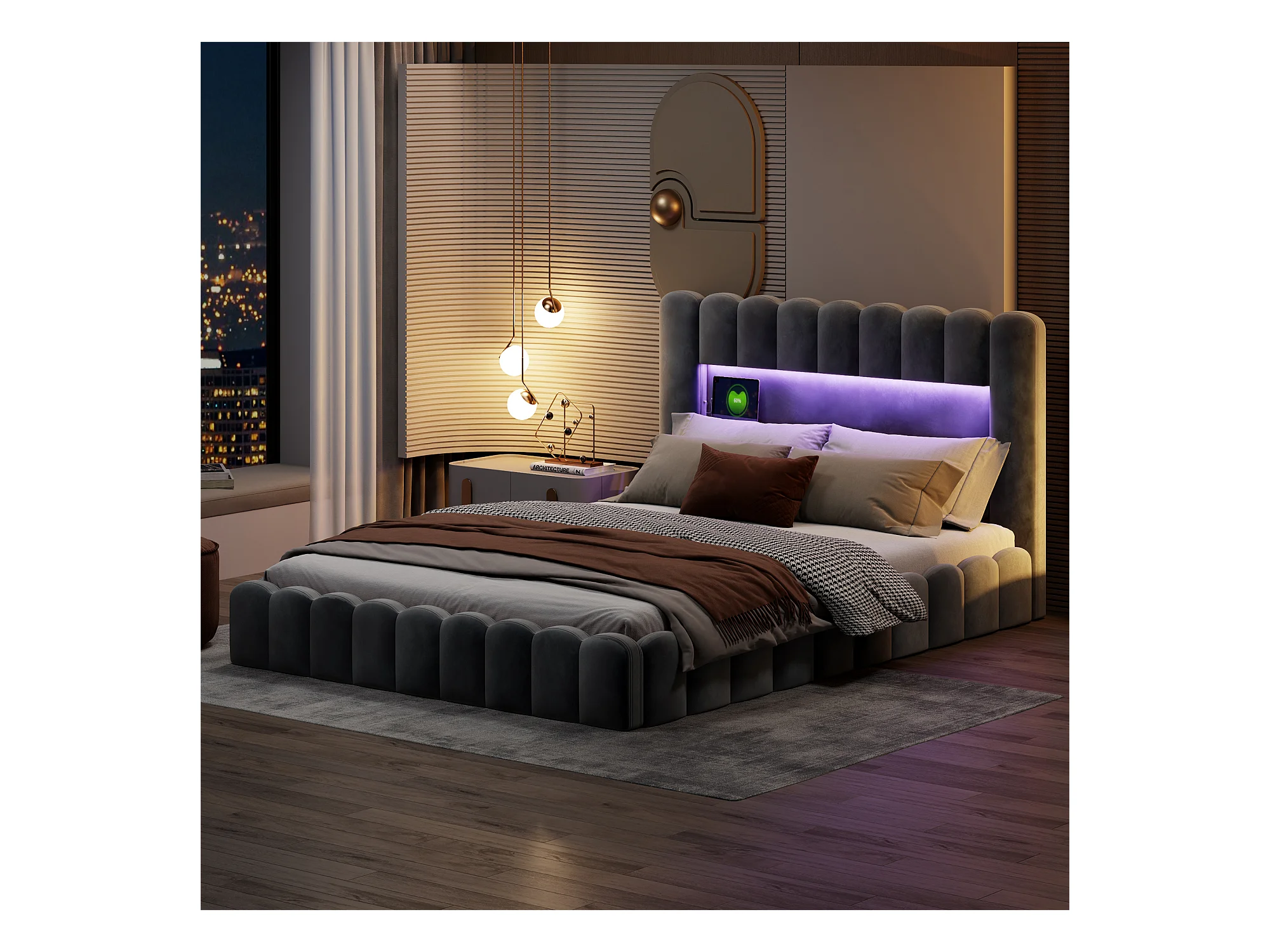 Letto contenitore in tessuto grigio chiaro con design a tronco d'albero, con sollevatori idraulici, testiera LED RGB e porte USB/Type-C - 180x200 cm