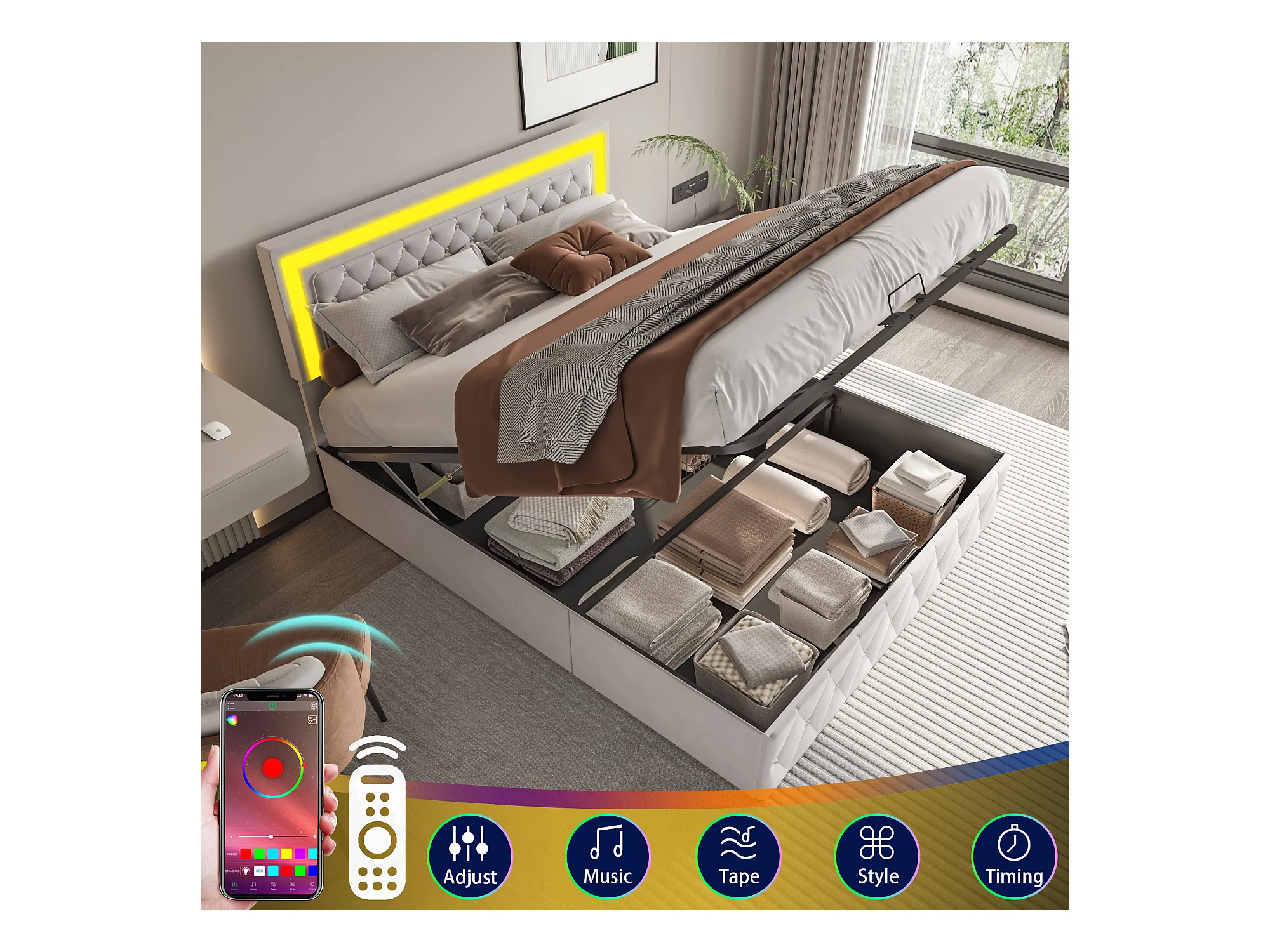 Letto contenitore 160x200cm, tessuto in velluto, struttura letto con testiera, illuminazione a LED, rete a doghe, letto idraulico multifunzione