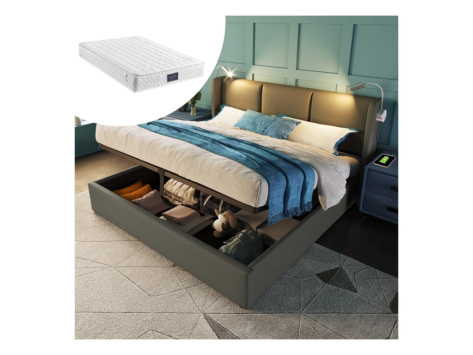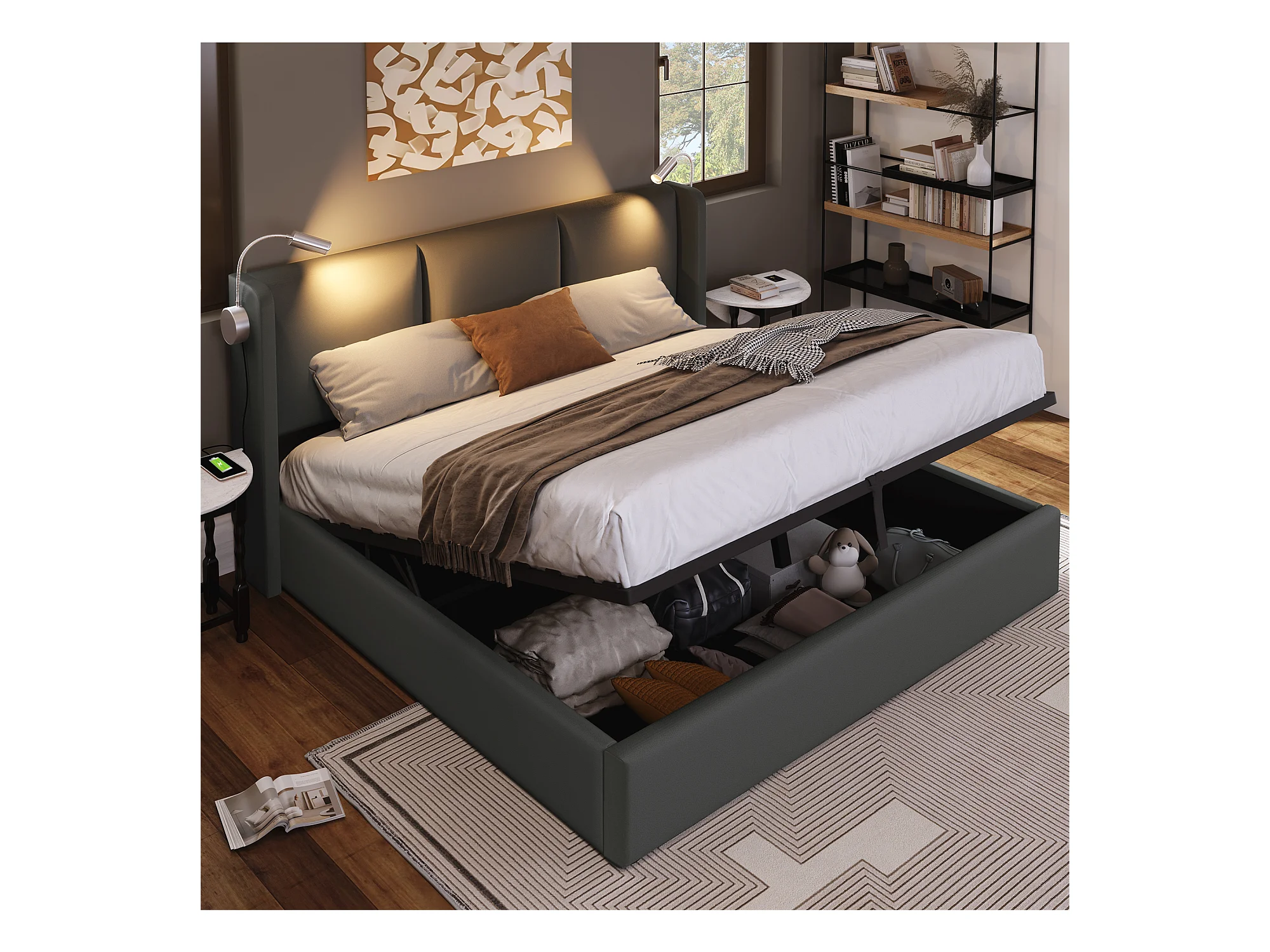 Letto contenitore matrimoniale con testiera, lampada da lettura e caricabatterie USB, struttura in PU grigio (206x165x107cm)