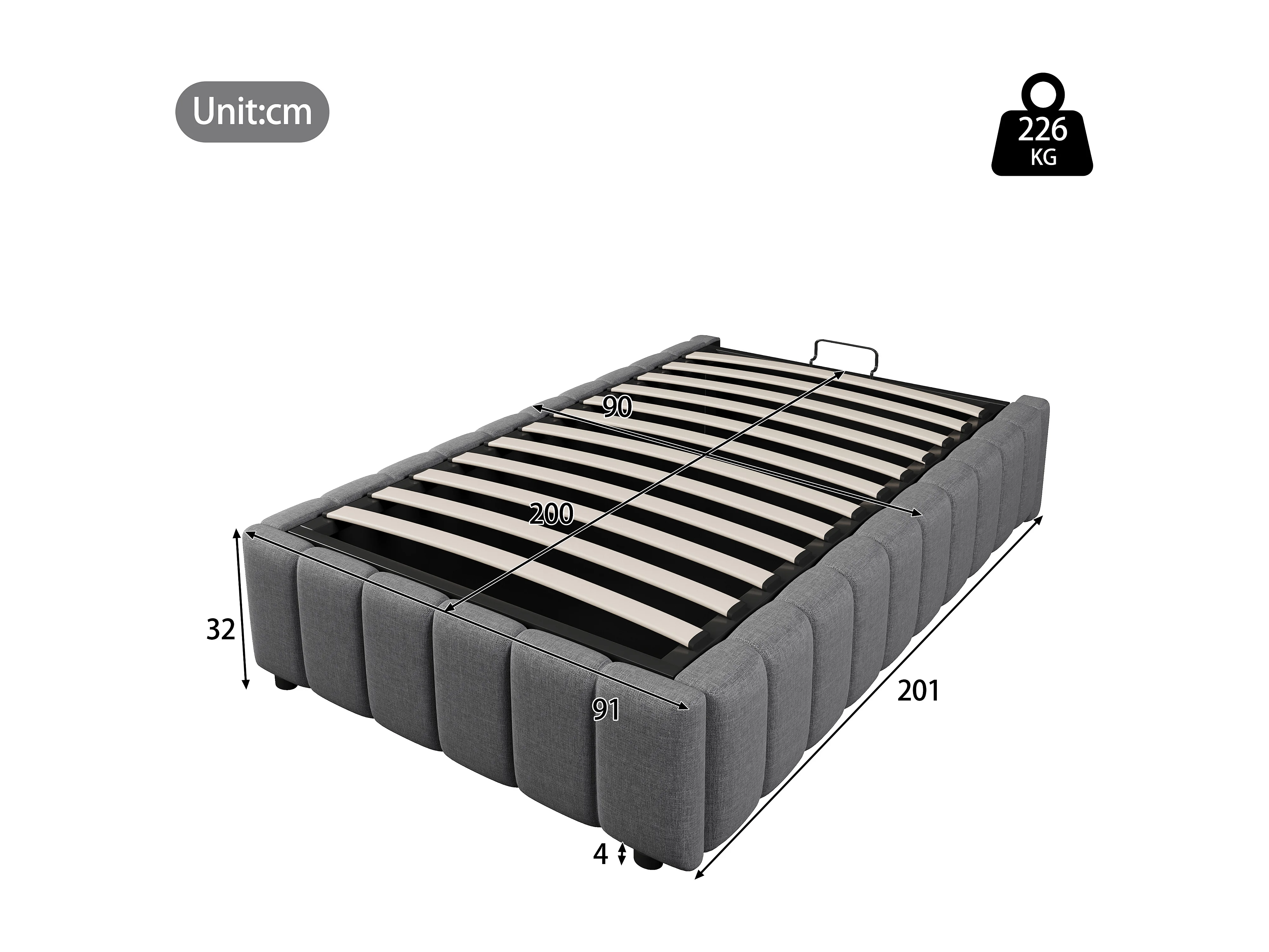 Letto contenitore minimalista 90x200cm in lino grigio senza testiera con contenitore idraulico (senza materasso)