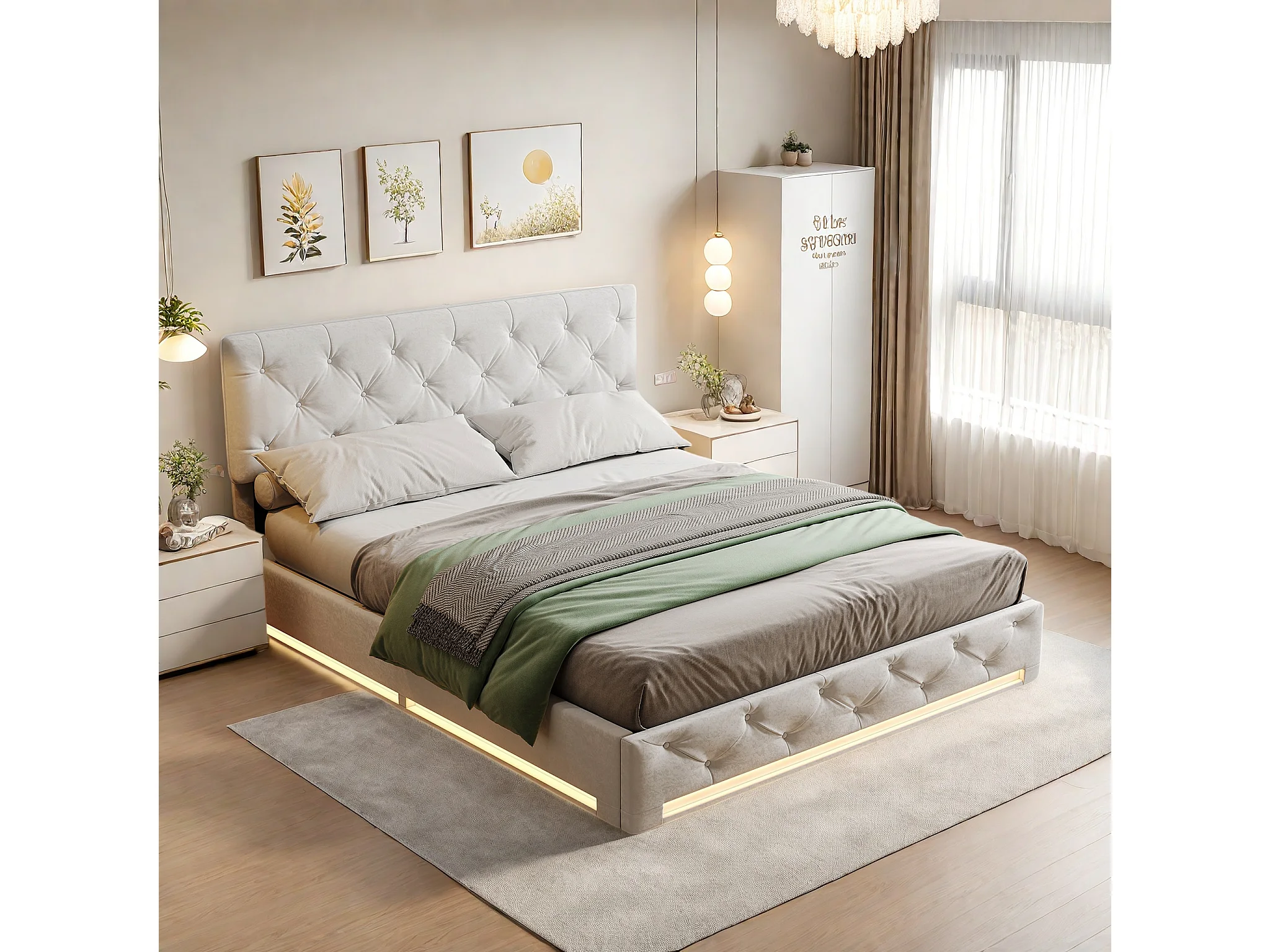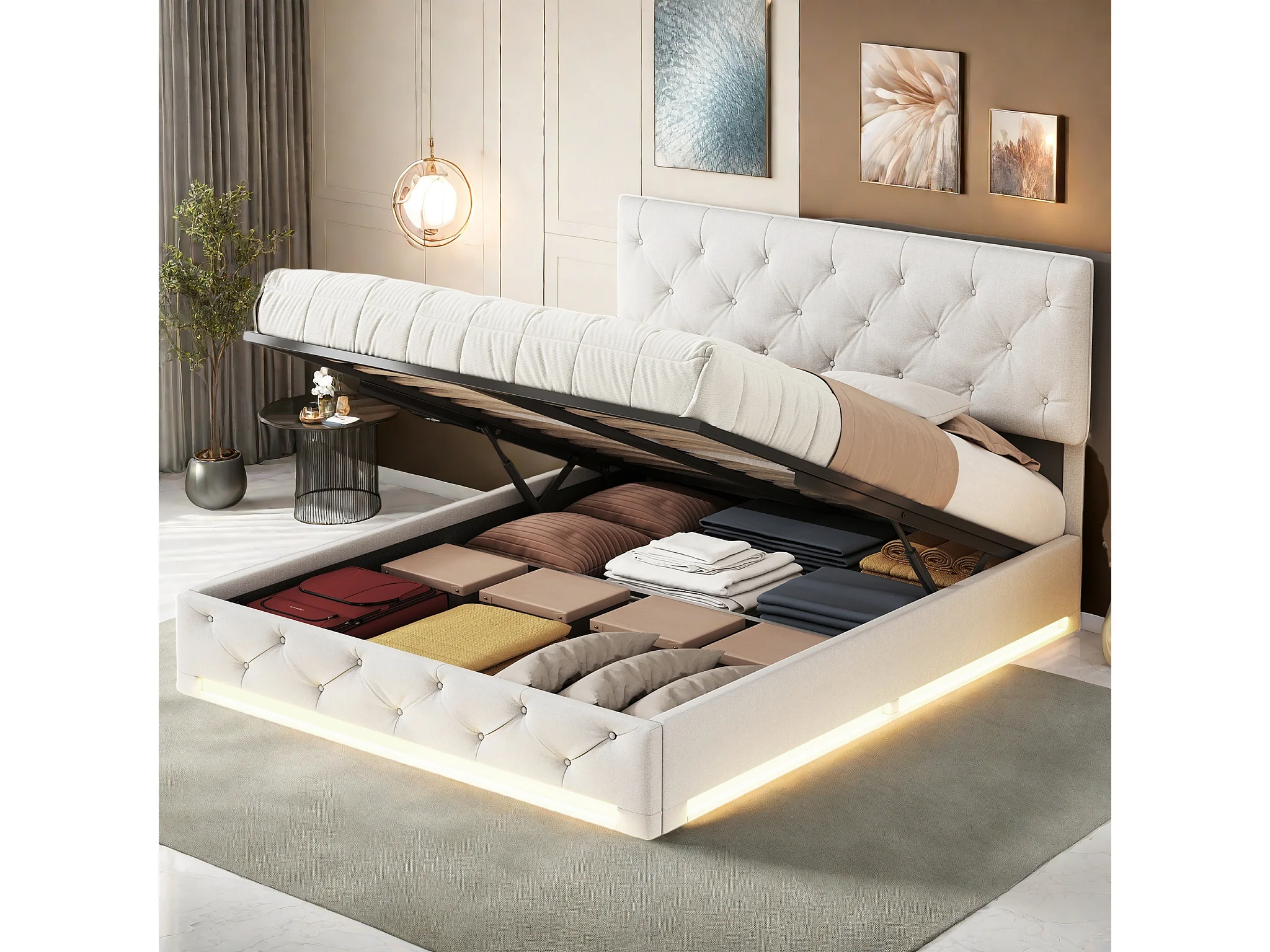 Letto contenitore per adulti 140x200 cm beige in lino con LED, testiera regolabile, rete e contenitore idraulico, stile scandinavo