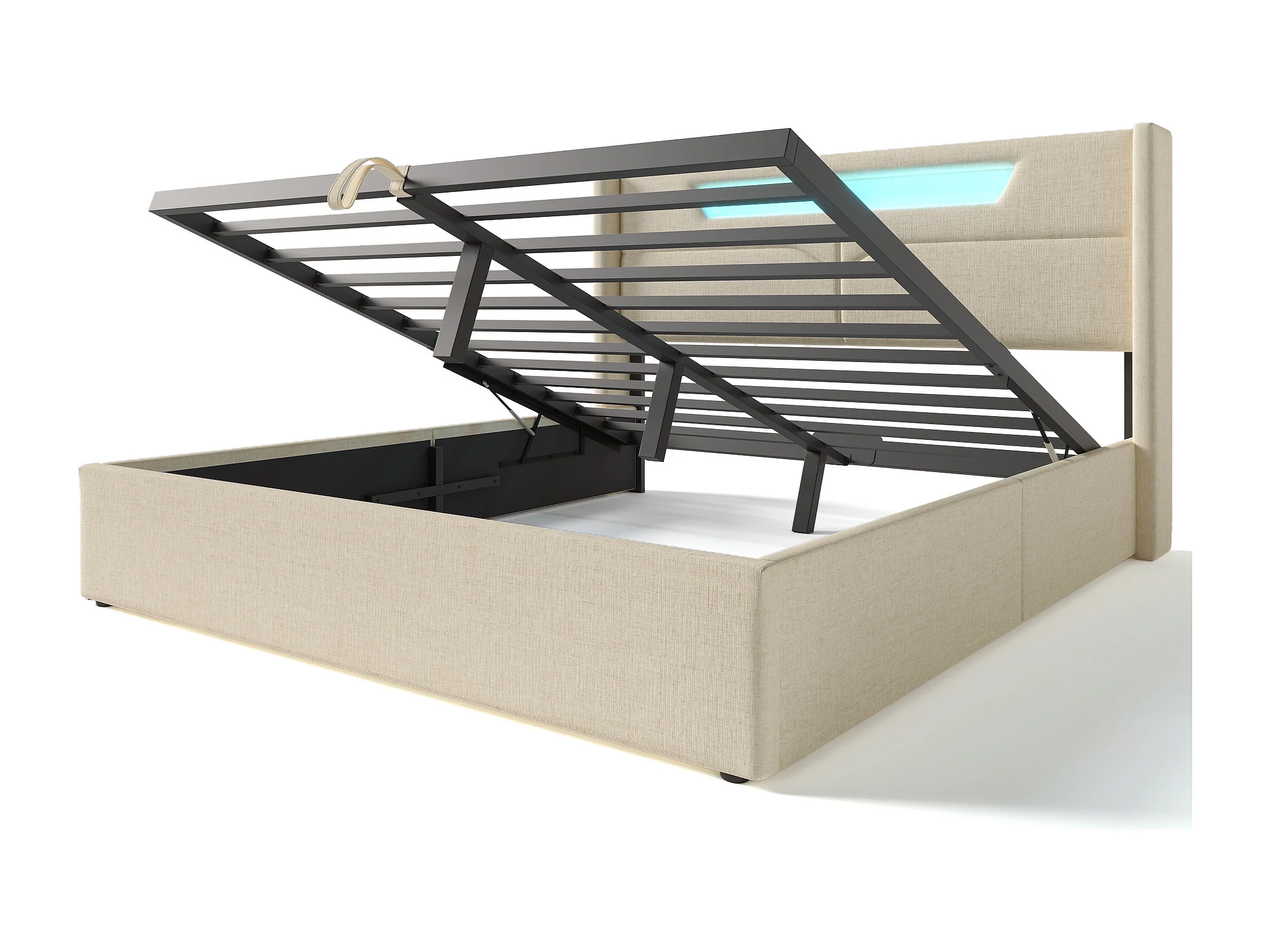 Letto contenitore per adulti 140x200 cm - testiera con USB e LED - struttura in metallo - lino beige (senza materasso)