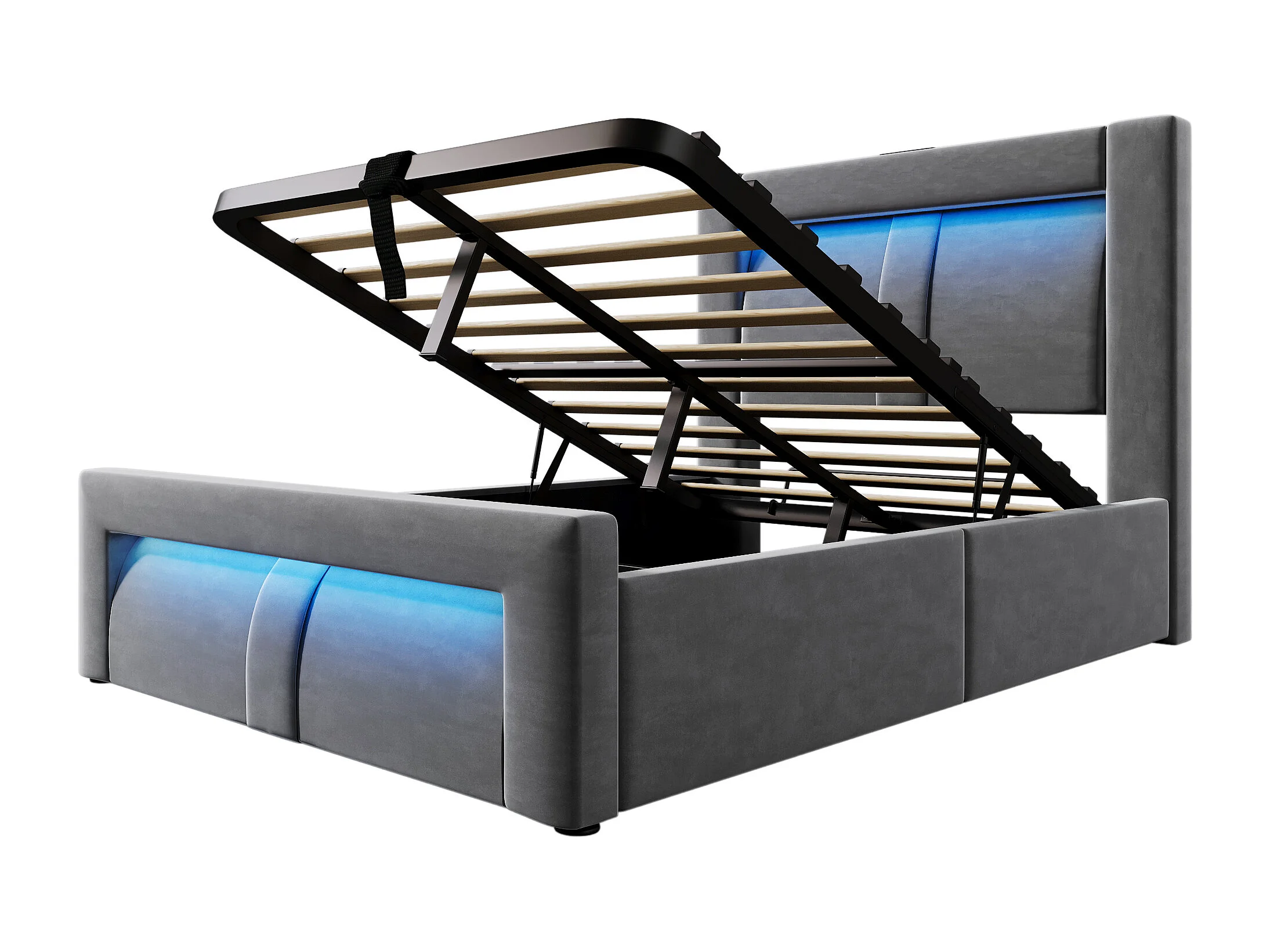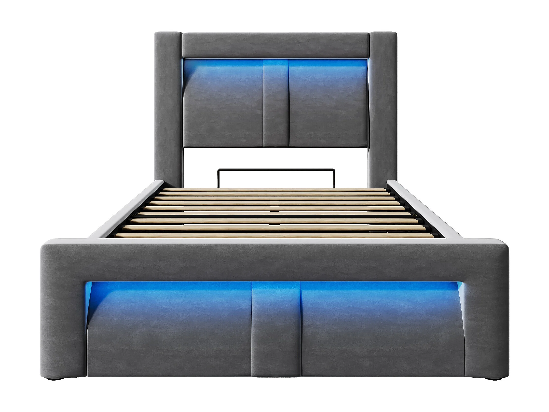 Letto contenitore per bambini 90x200 cm con LED e 3 porte USB - Velluto grigio
