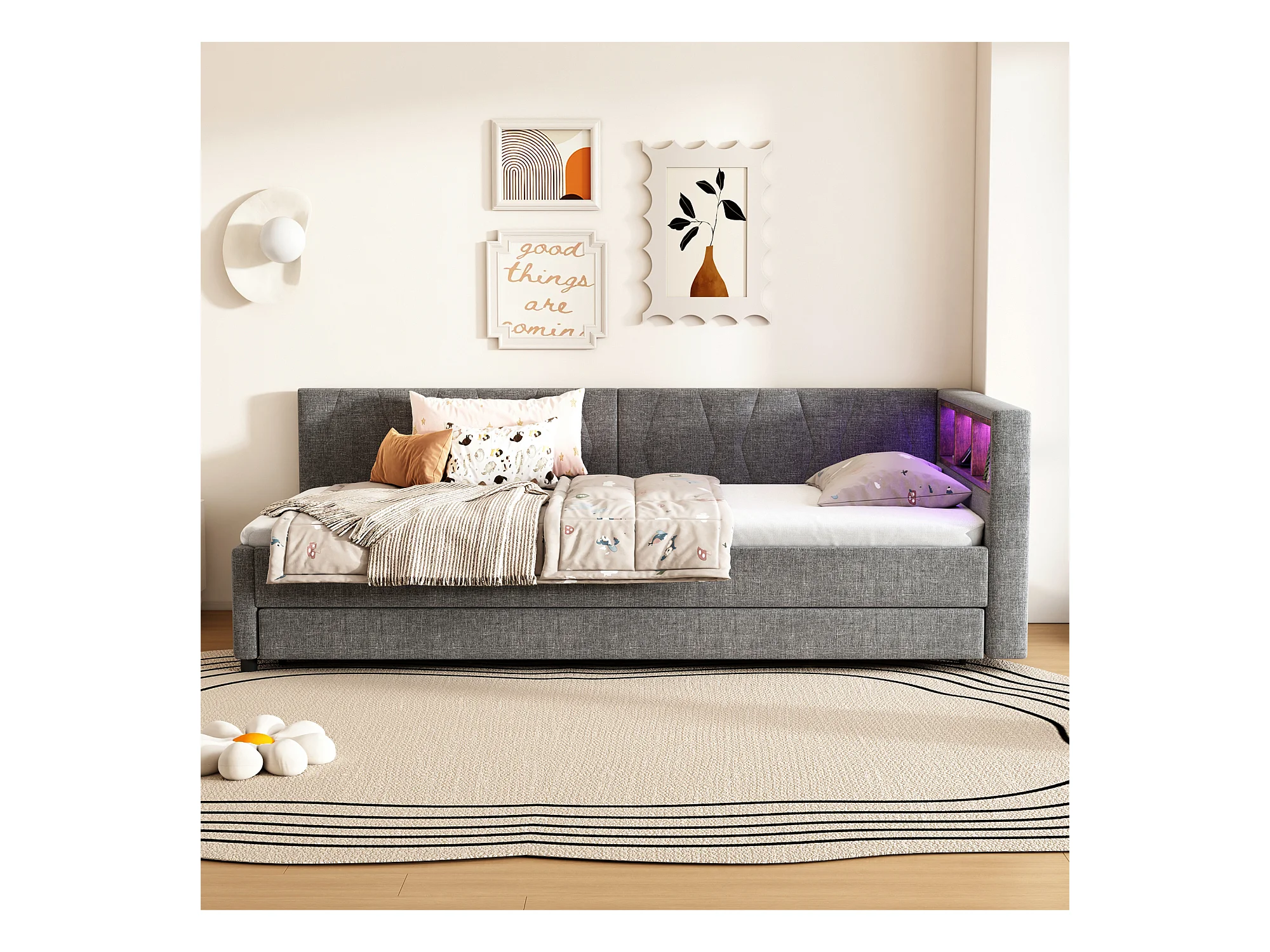 Letto estraibile 90x200 cm, tessuto di lino grigio, divano letto con porte USB e LED, senza materasso