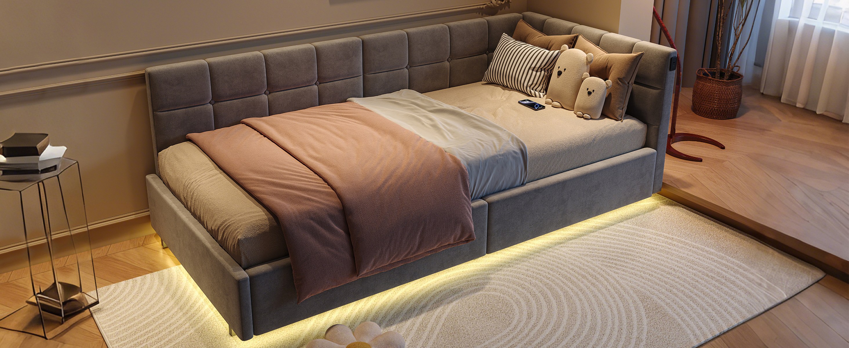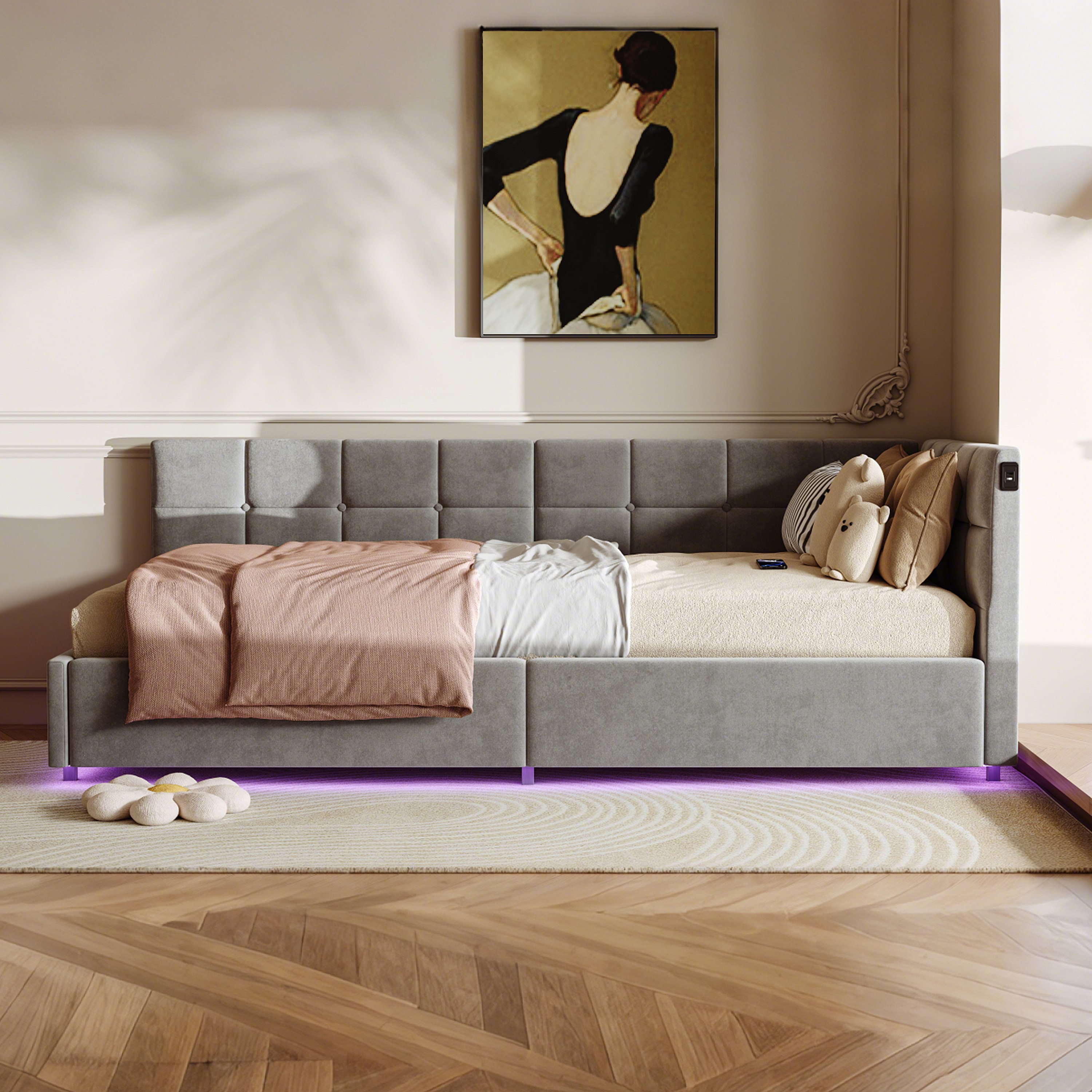 Letto singolo grigio 90x200cm in velluto con effetto galleggiante, contenitore idraulico, porte USB/Type-C e striscia LED RGB con telecomando