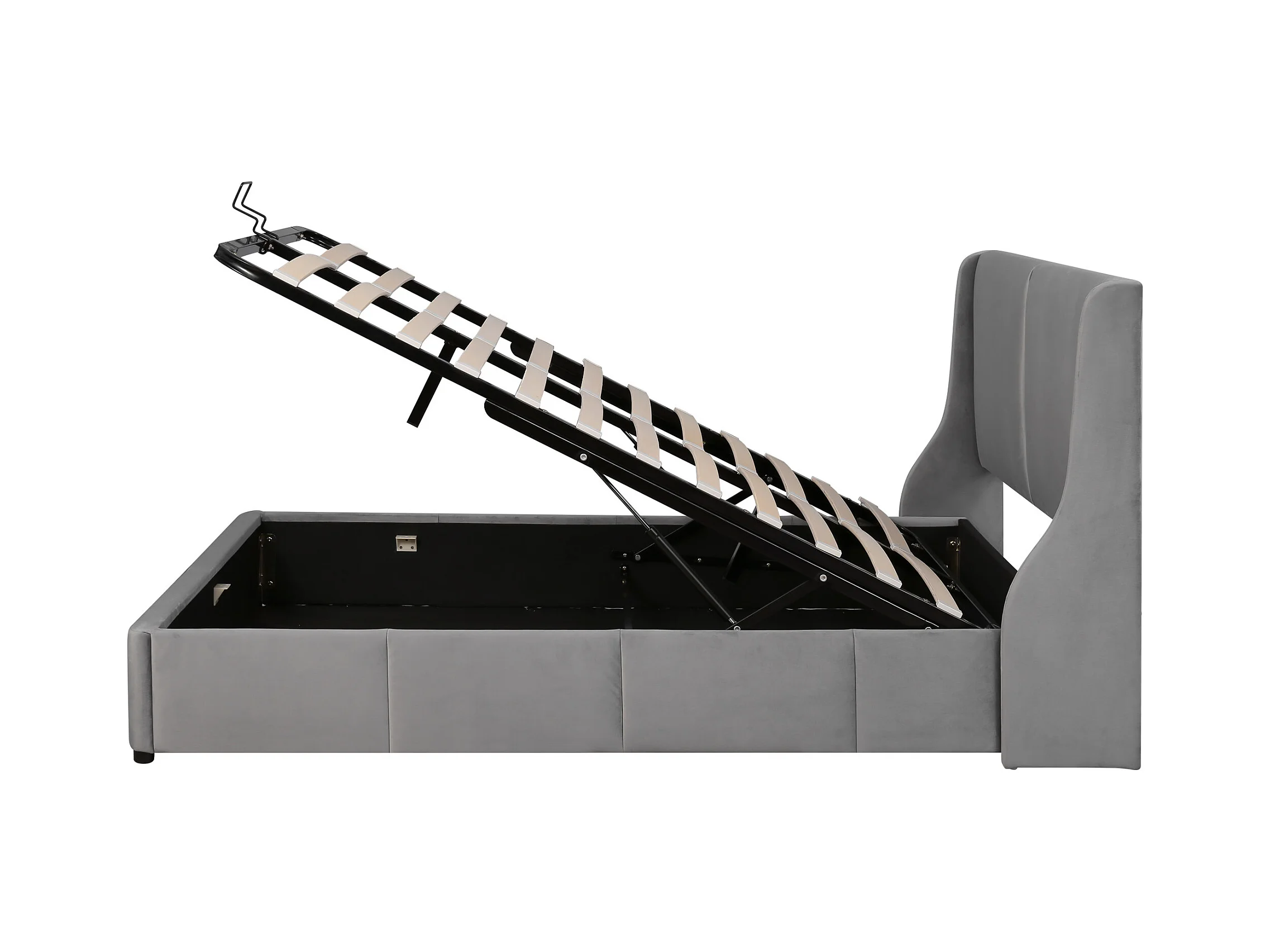 Letto in velluto con ali, bottoni decorativi, idraulico con contenitore, 140x200 cm, grigio (207x146x99 cm)