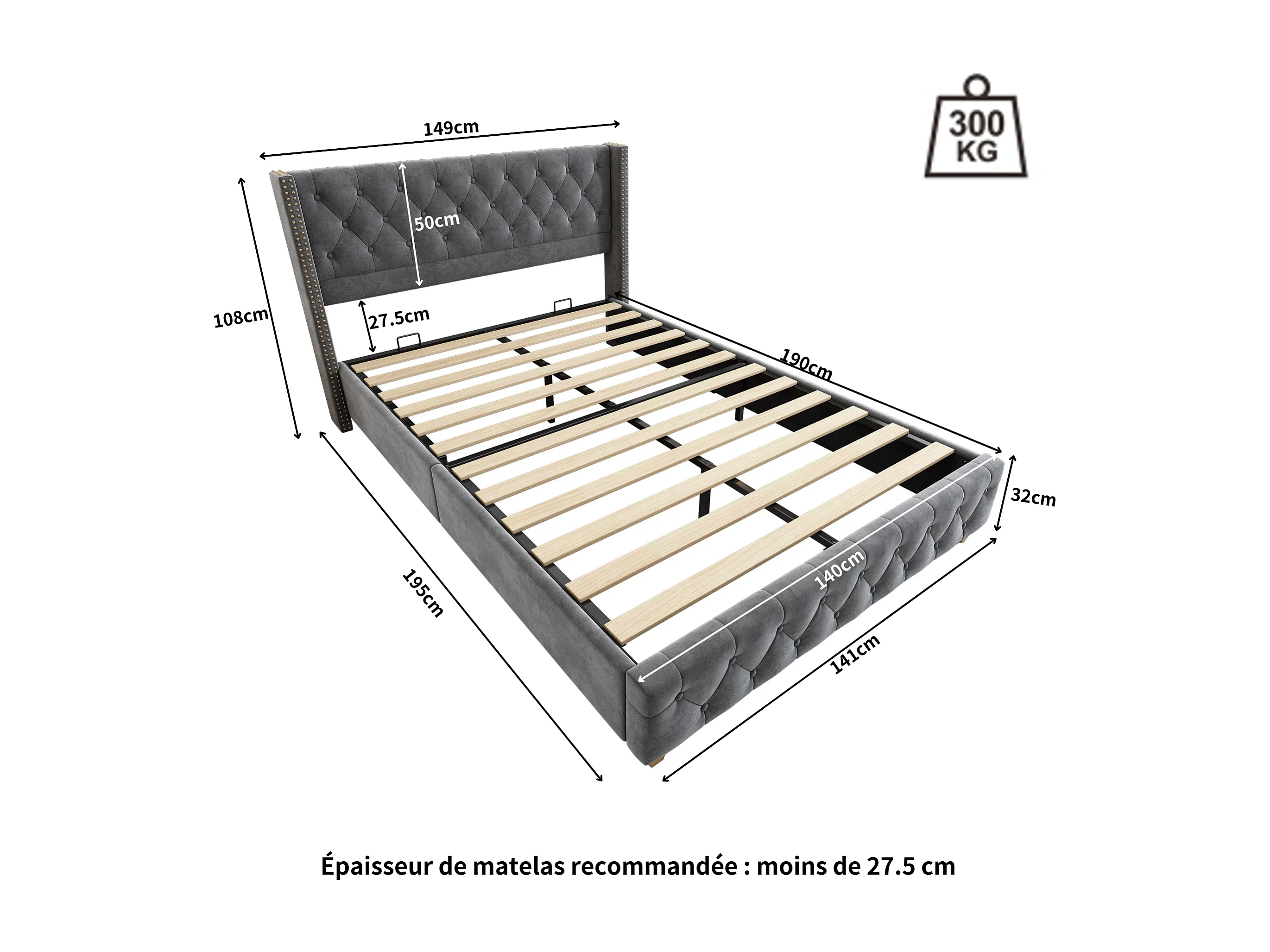Letto imbottito 140x190 cm con testiera e rete a doghe, bottoni, chiodini decorativi, gambe in legno, velluto grigio (140x190x108 cm) ### Dettagli del prodotto: