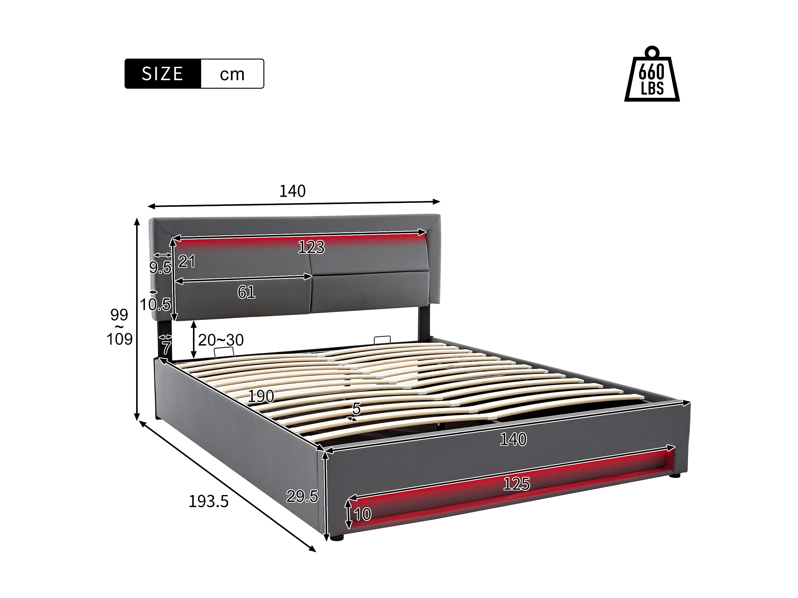 Letto imbottito 140x190cm, con porta USB, illuminazione a LED e spazio di archiviazione, senza materasso, PU, grigio